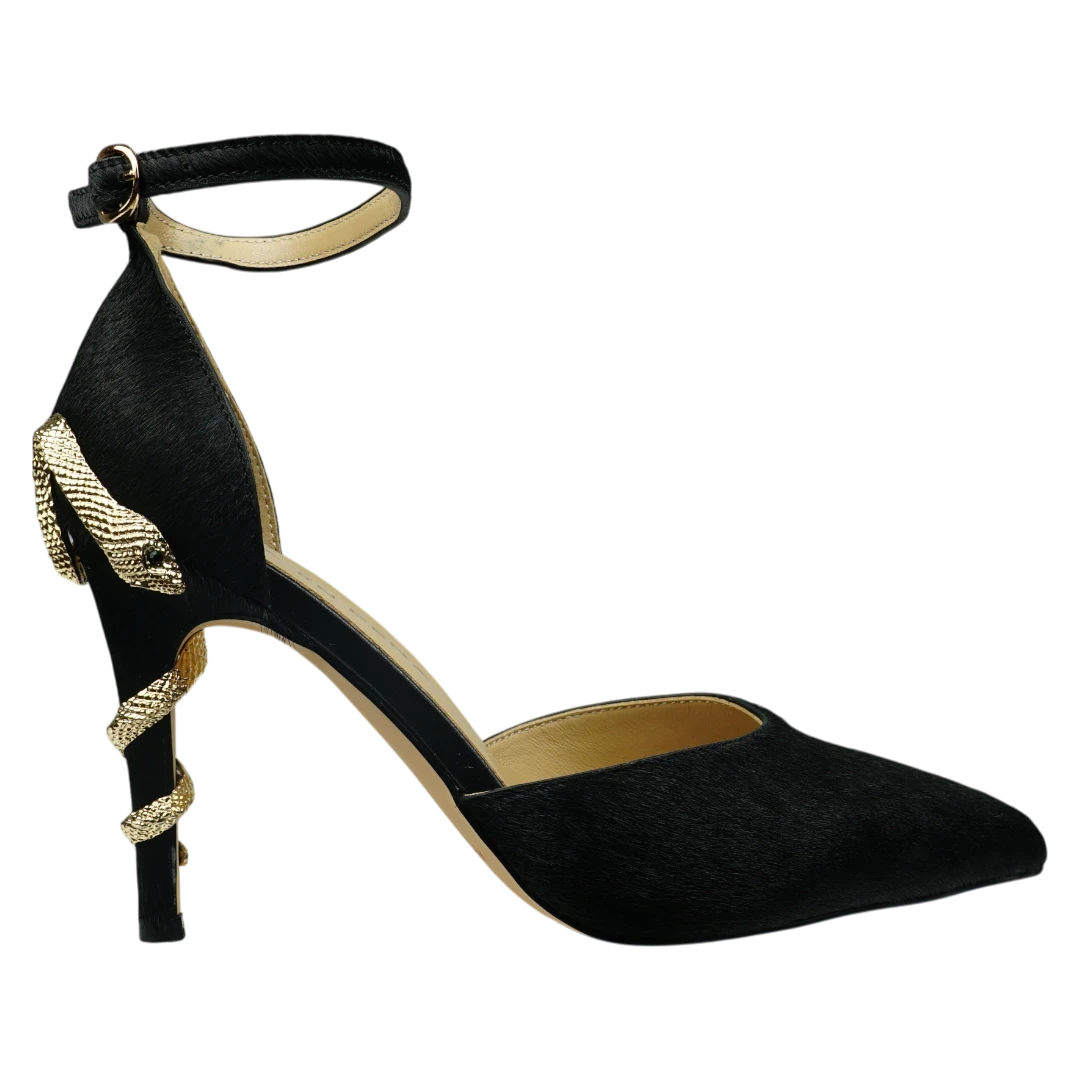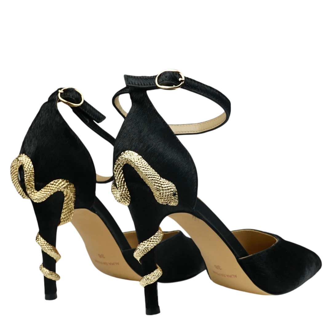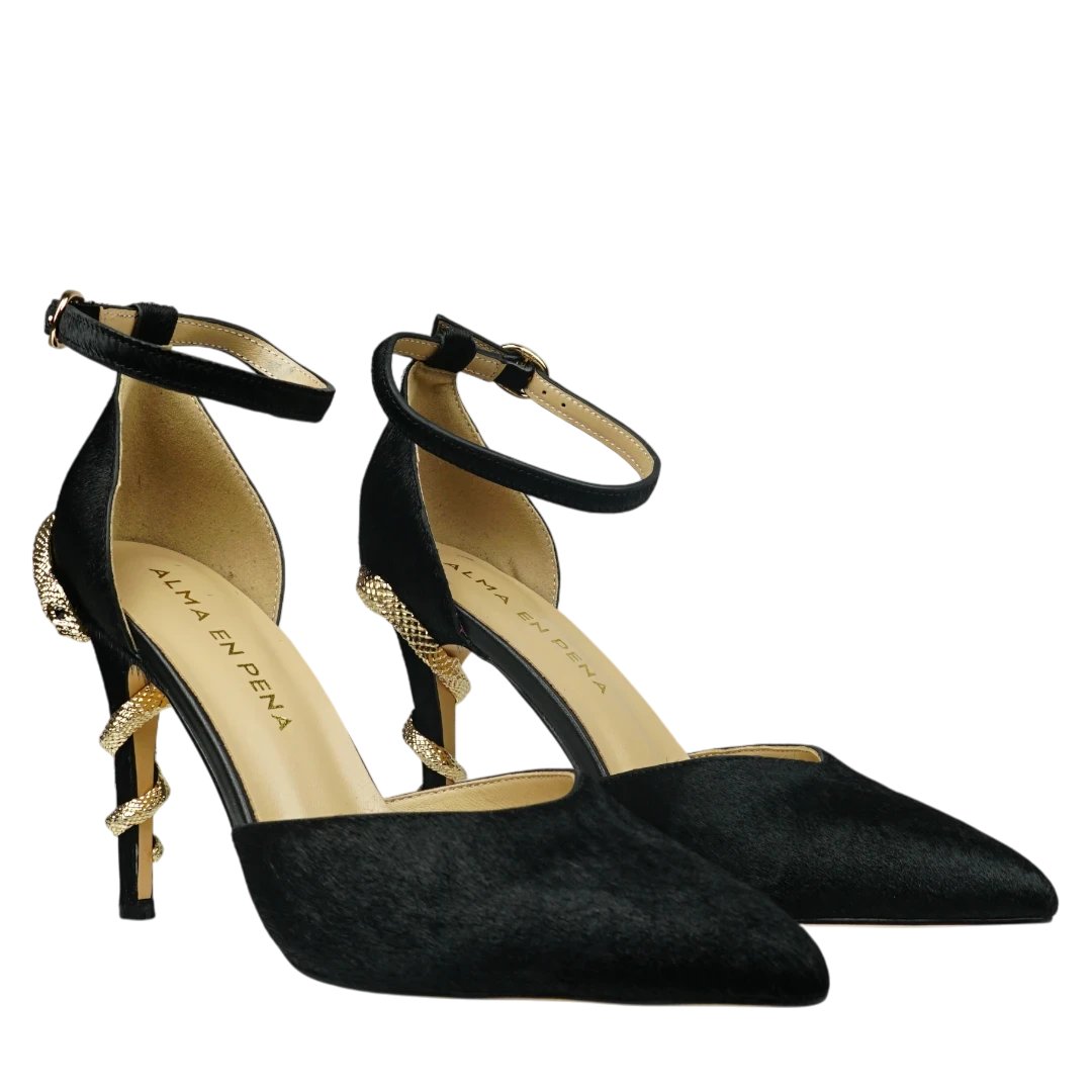 Elegantne, zavodljive i upečatljive — ove Alma en Pena cipele su definicija luksuznog dizajna s daškom mistične ženstvenosti. Izrađene od crne teksturirane kože s efektom dlake, ističu se zlatnim metalnim detaljima koji spiralno obavijaju potpeticu u obliku zmije, stvarajući dojam umjetničkog nakita. Tanka remenčić traka oko zgloba dodatno naglašava eleganciju siluete i osigurava savršeno pristajanje.