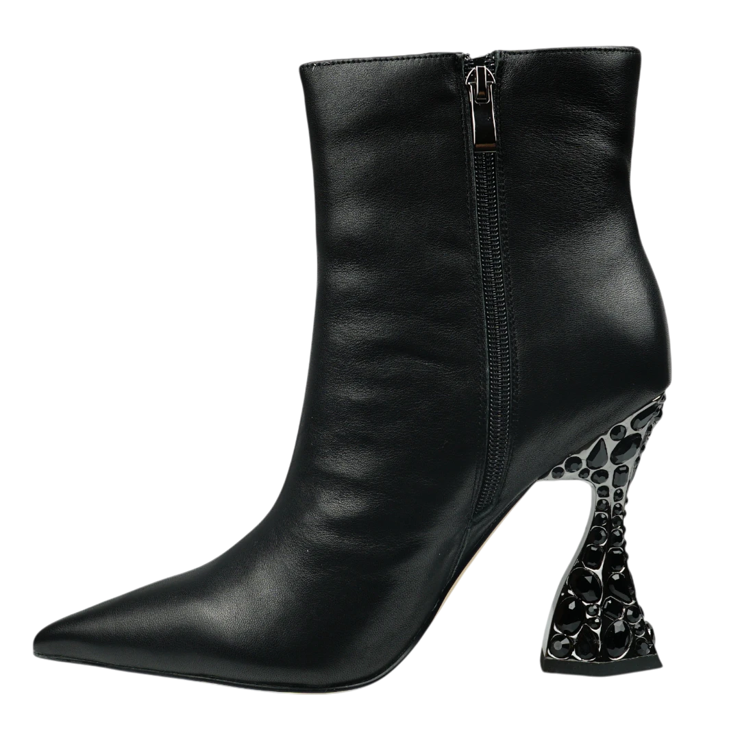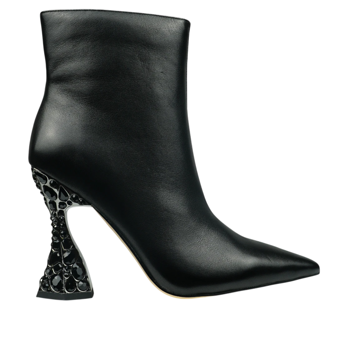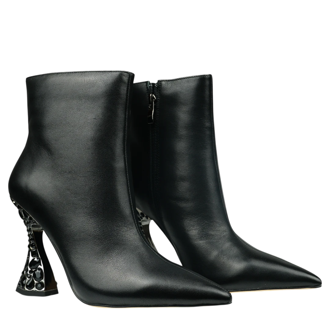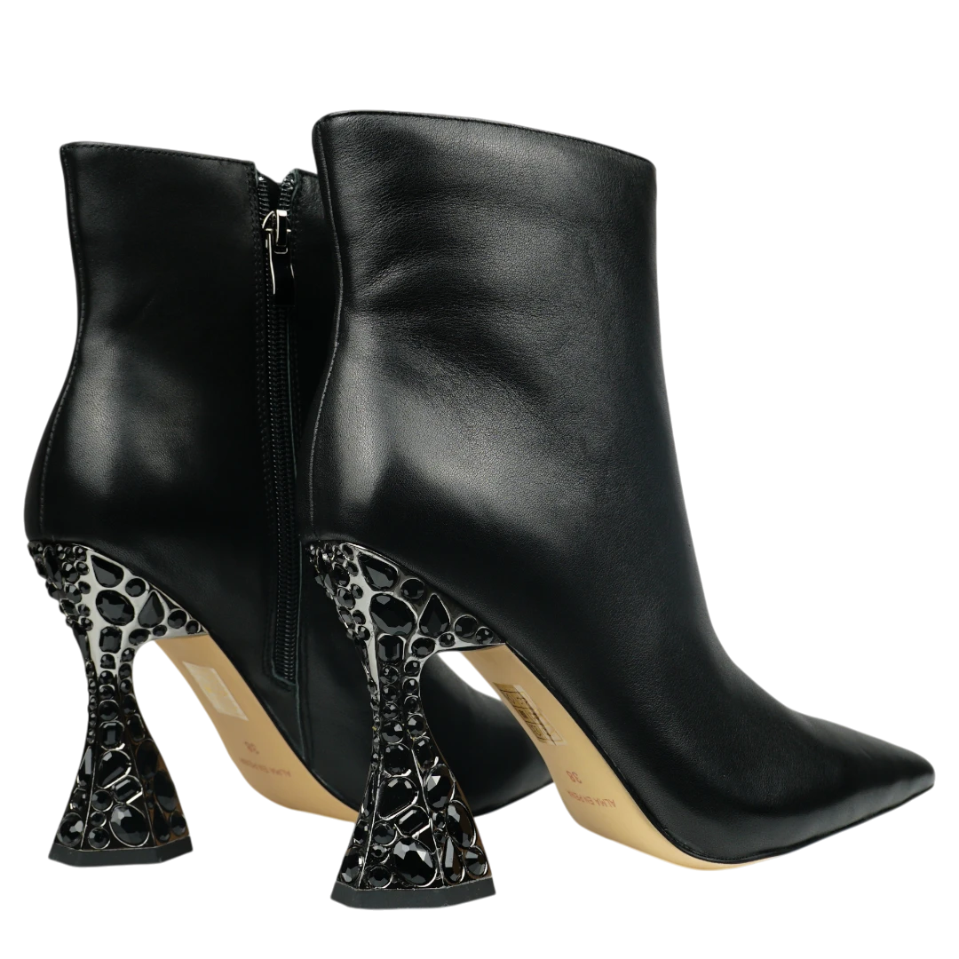 Ove Alma en Pena gležnjače odišu luksuzom i modernom elegancijom u svakom detalju. Izrađene od glatke crne kože s minimalističkom siluetom i šiljastim vrhom, savršeno prate liniju stopala i pružaju profinjen, ženstven izgled. Poseban akcenat daje ukrašena potpetica sa sjajnim crnim kristalima u skulpturalnom obliku, koja ovim gležnjačama daje umjetnički karakter i prepoznatljiv potpis brenda. Idealne su za kombinovanje uz haljine, elegantne pantalone ili suknje — komad koji svaku odjevnu kombinaciju pretvara u sofisticiran modni izraz s dozom glamura.