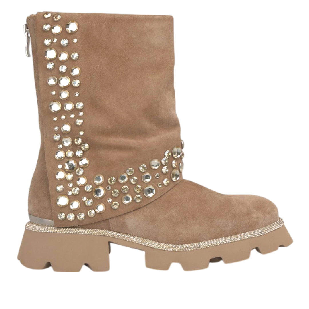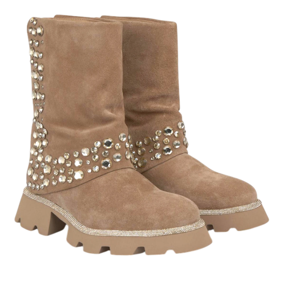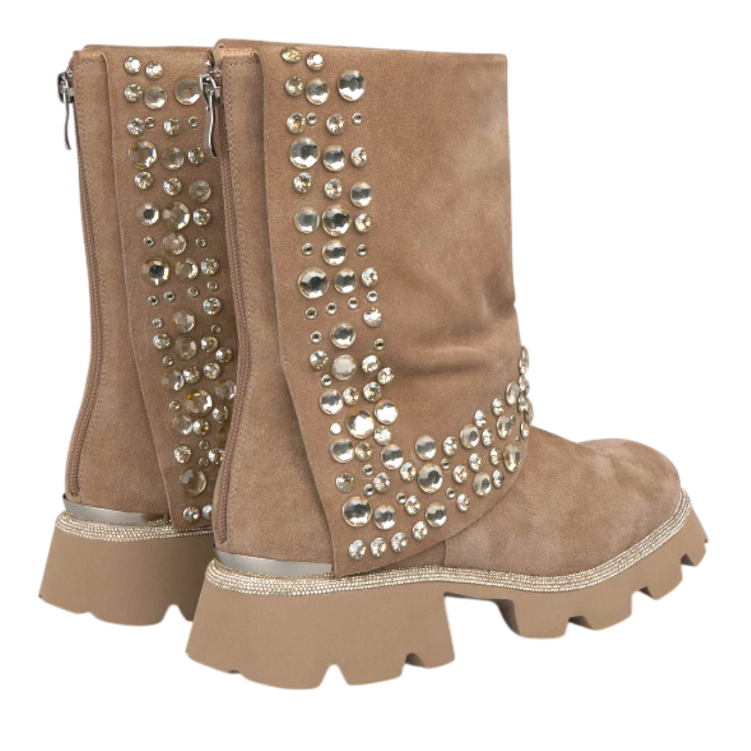 Alma en Pena gležnjače u bež nijansi donose upečatljiv balans između urbanog stila i luksuza. Izrađene od brušenog antilopa, krase ih raskošni kristali različitih veličina koji stvaraju glamurozan sjaj pri svakom koraku. Robustni gumeni đon sa naglašenim profilom i diskretno ukrašen rub čine ih praktičnim izborom za hladnije dane, bez odricanja od elegancije.