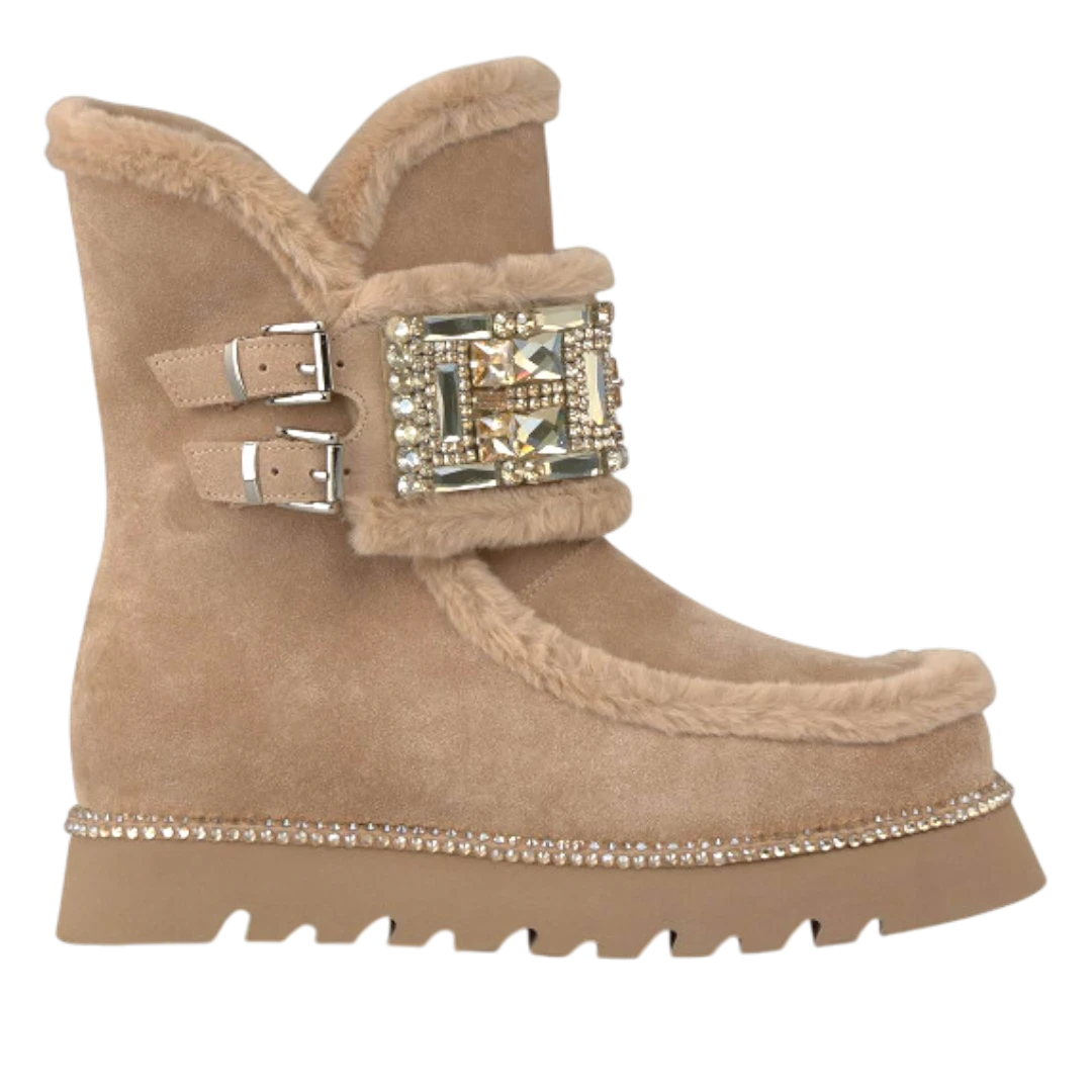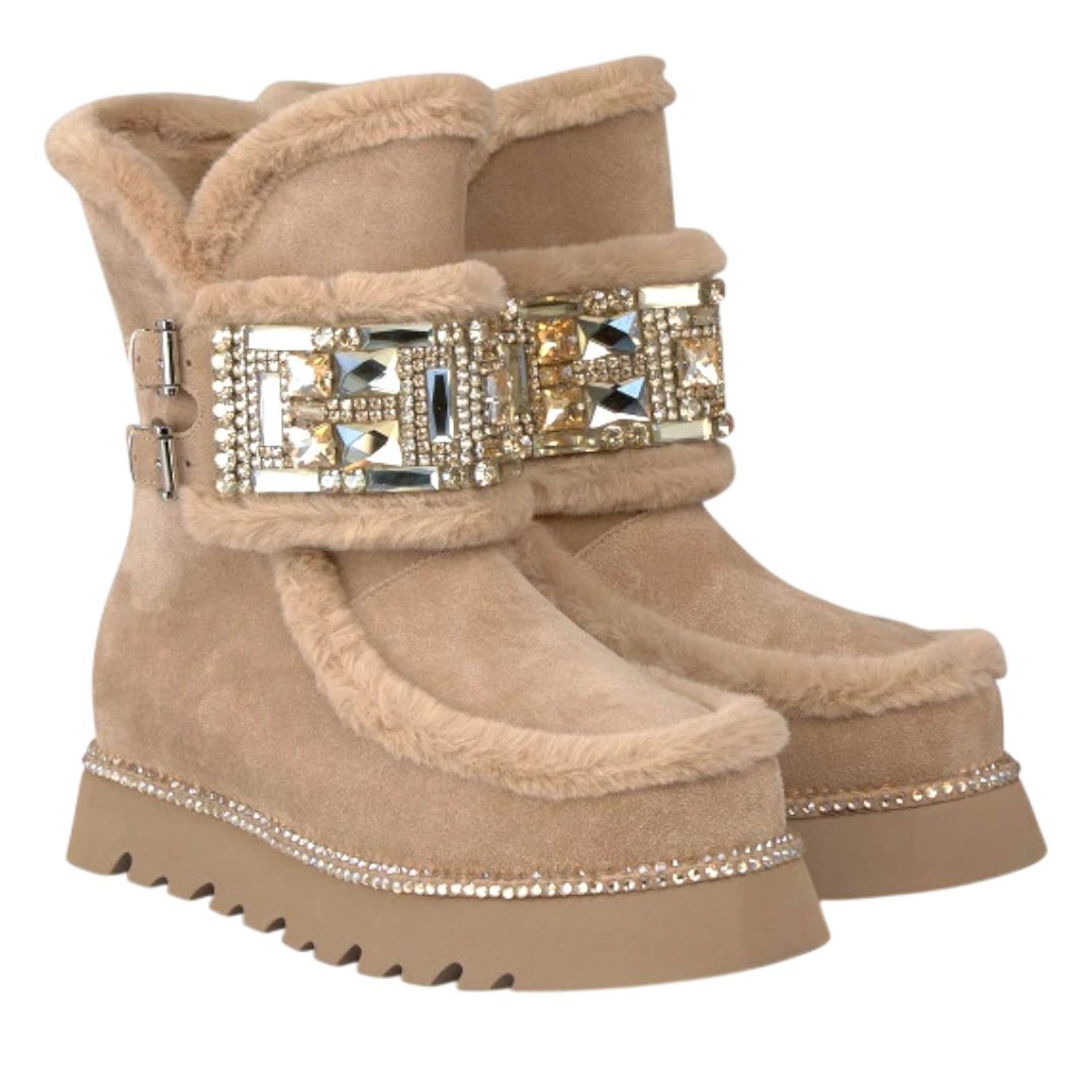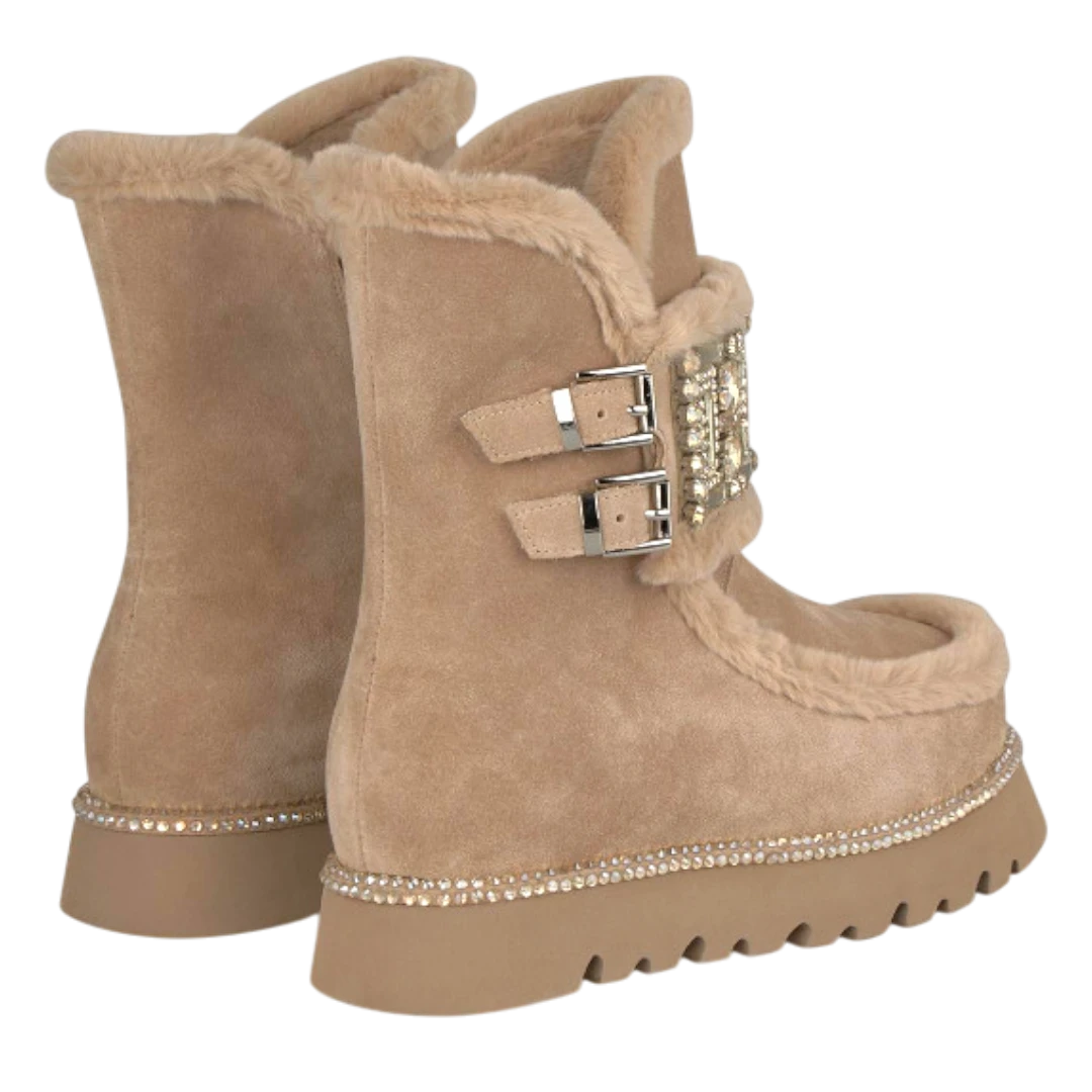 Alma en Pena gležnjače u bež nijansi donose savršen spoj glamura i udobnosti. Izrađene od mekanog brušenog antilopa, obogaćene su luksuznom kristalnom kopčom i metalnim detaljima koji unose dozu sofisticiranosti. Unutrašnjost obložena krznom pruža toplinu i mekoću, dok čvrst zupčasti đon garantuje stabilnost i praktičnost u zimskim danima.