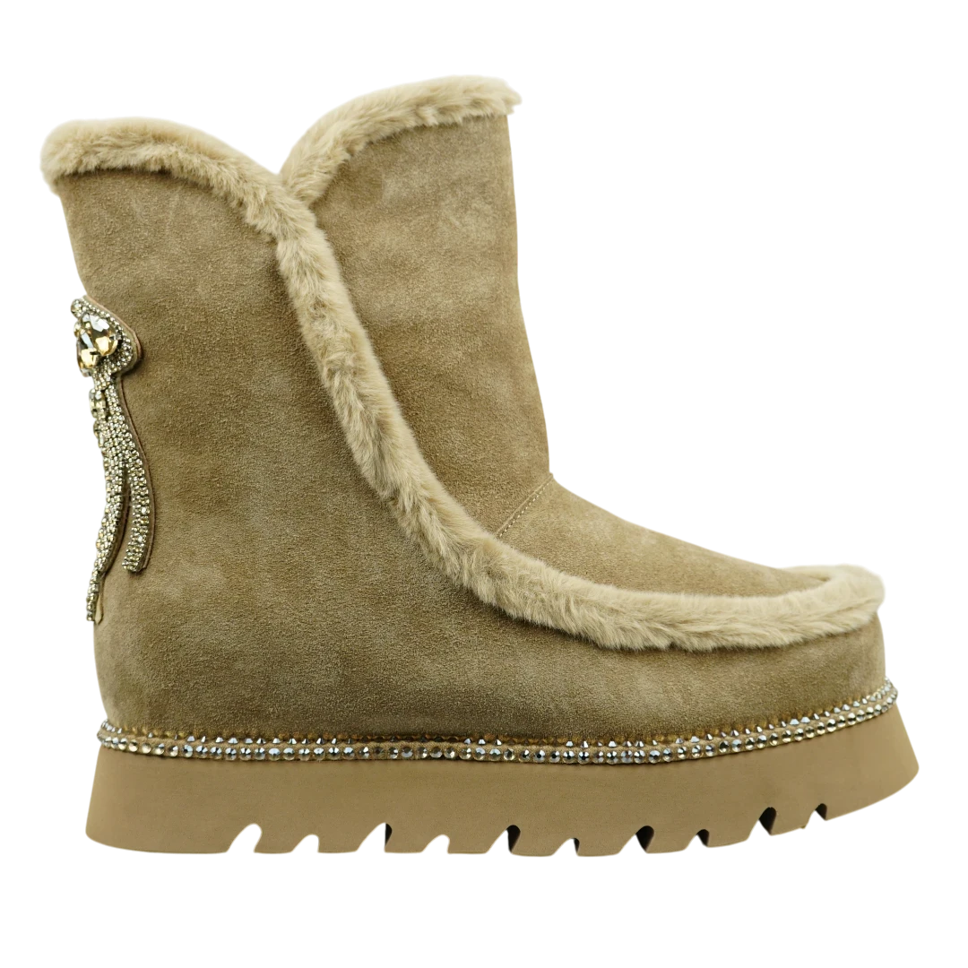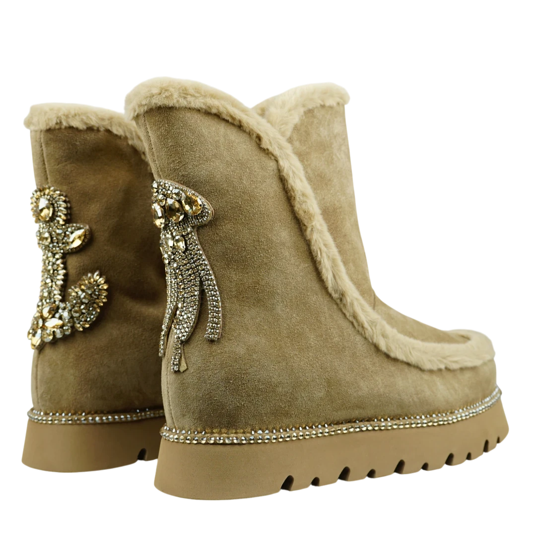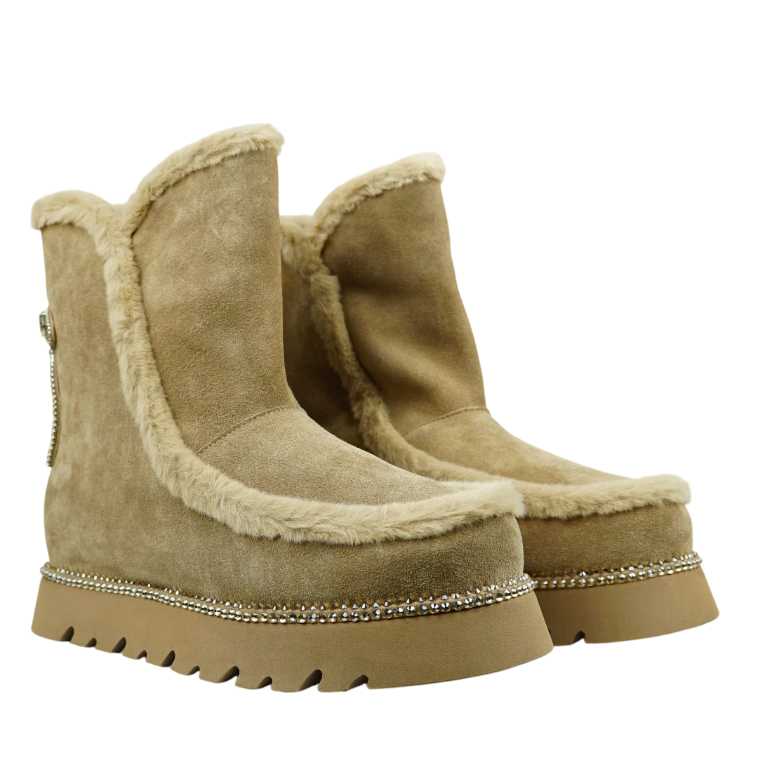 Alma en Pena gležnjače u bež nijansi donose savršenu kombinaciju topline, udobnosti i luksuza. Izrađene od mekane brušene kože, obložene krznom i ukrašene detaljima od kristala, ove čizme podižu svaki zimski outfit. Masivni đon sa zubcima pruža stabilnost i moderan izgled, dok ženstveni ukras na stražnjem dijelu daje dozu glamura. Idealne su za dane kada želite da spojite udobnost i profinjen stil.