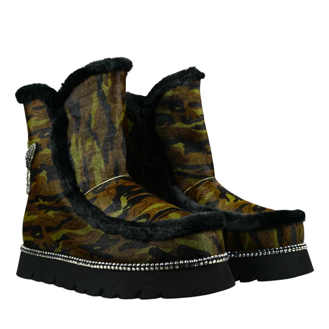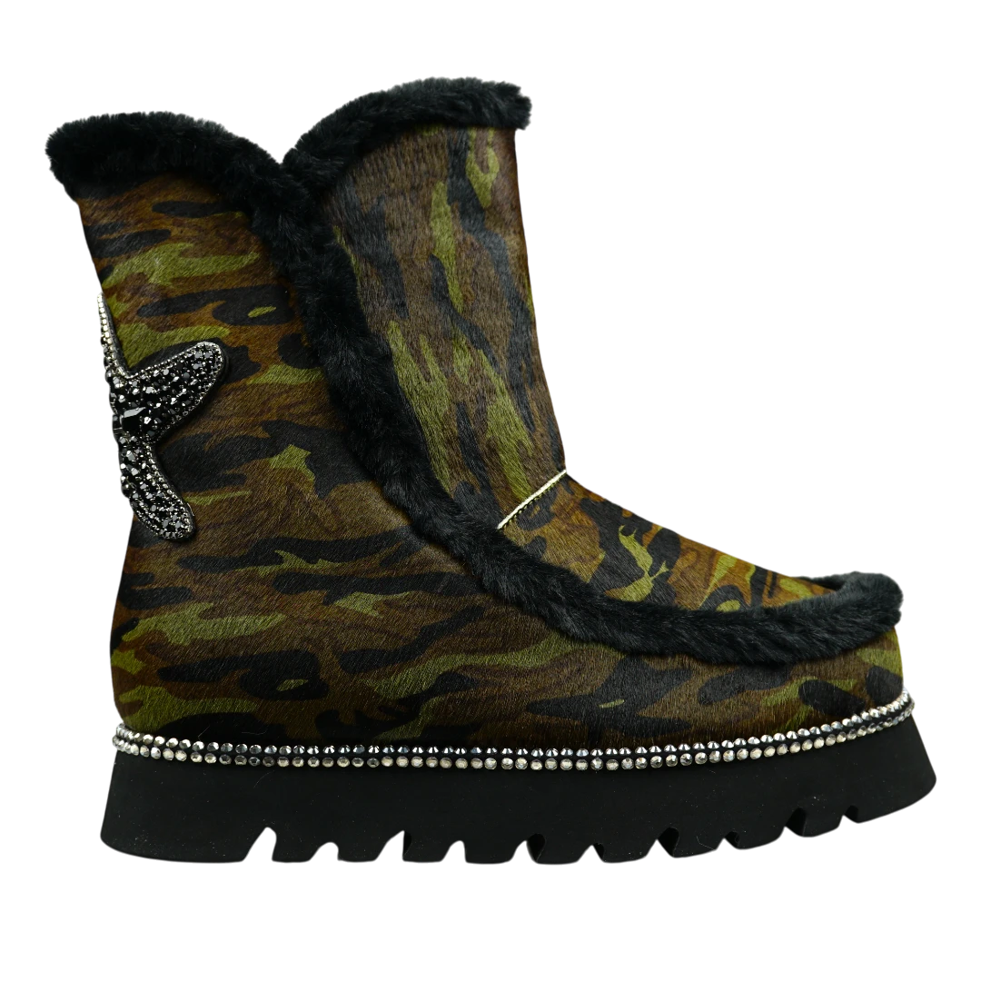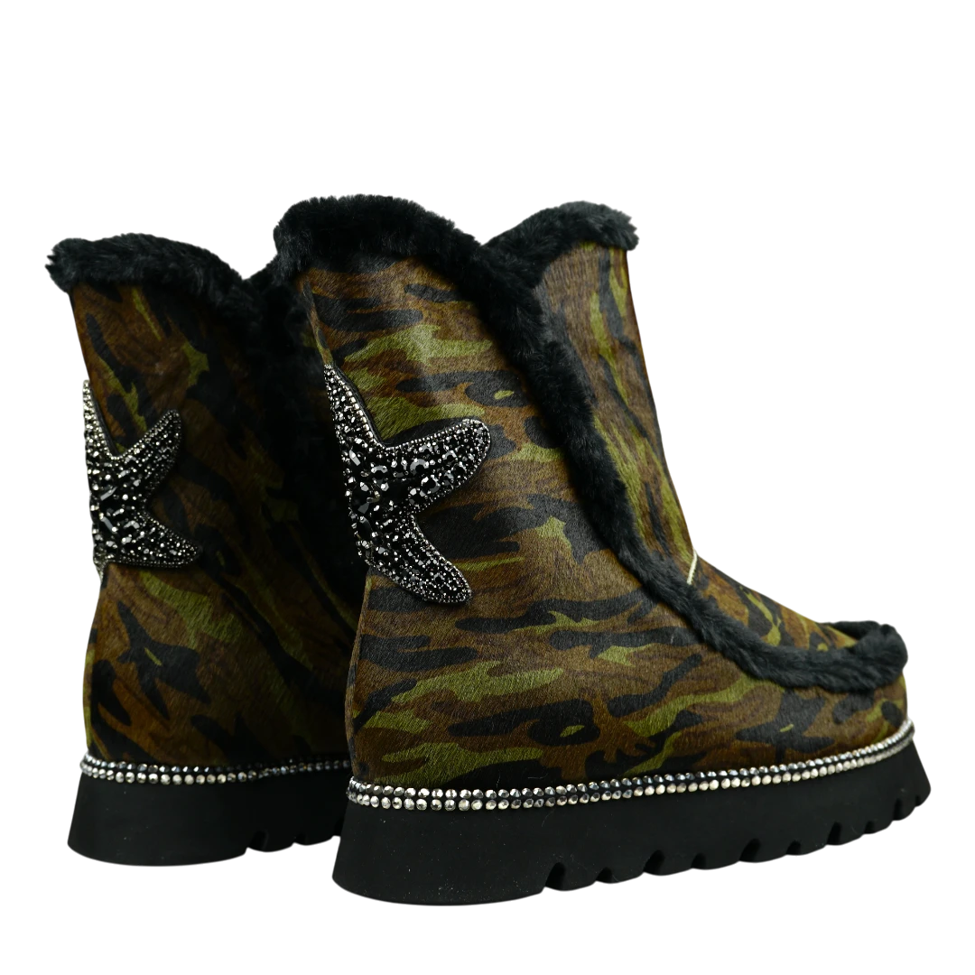 Alma en Pena gležnjače u military stilu donose spoj urbanog dizajna i luksuznog sjaja. Kamuflažni uzorak u kombinaciji s crnim krznom daje edgy izgled, dok crni kristalni ukras u obliku zvijezde i detalji od kristala duž đona podižu svaki outfit na potpuno novu razinu. Masivni zupčasti đon pruža stabilnost i udobnost, savršen za hladne dane kada želite da budete primijećene.