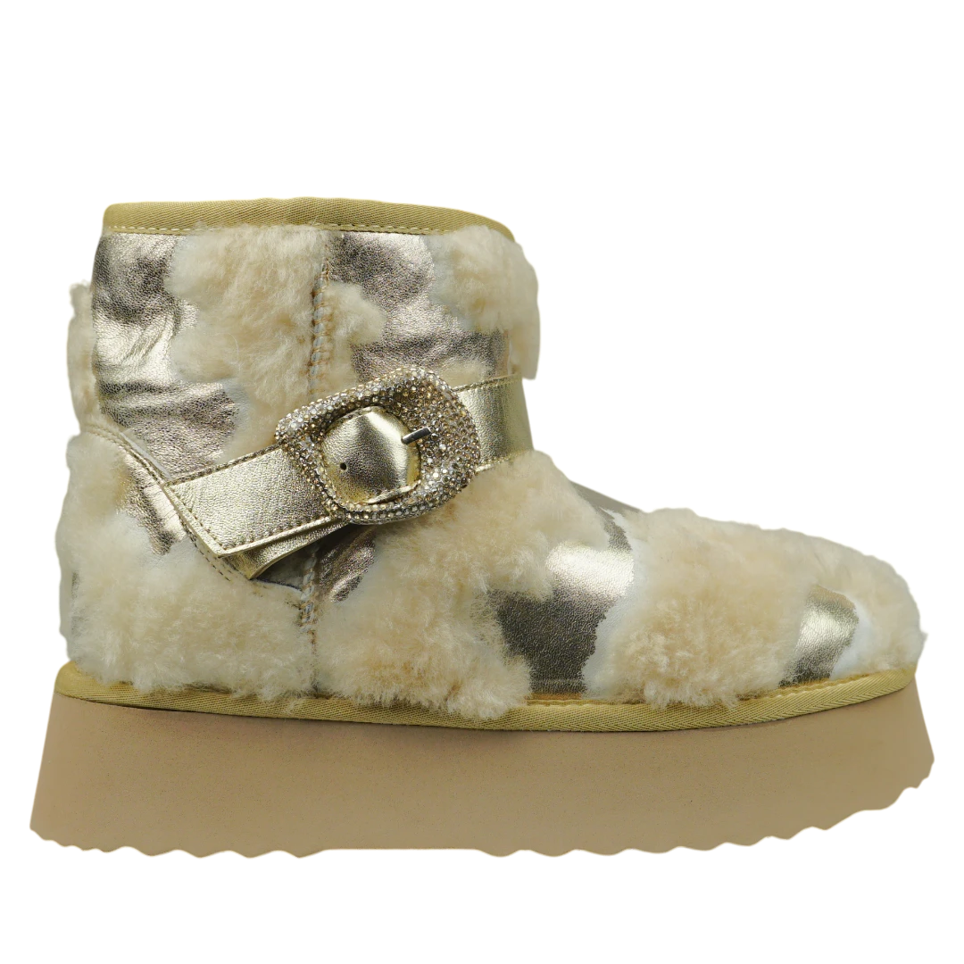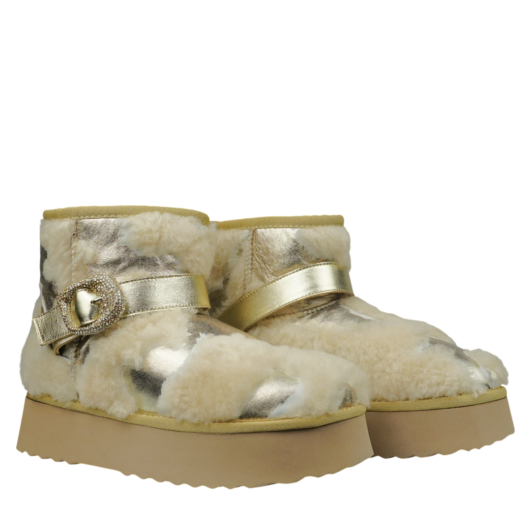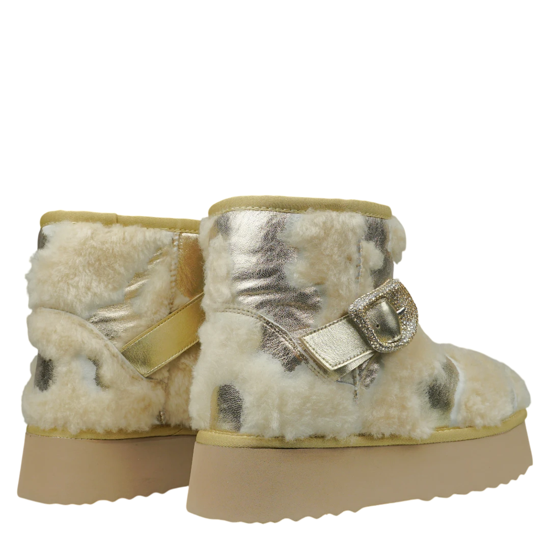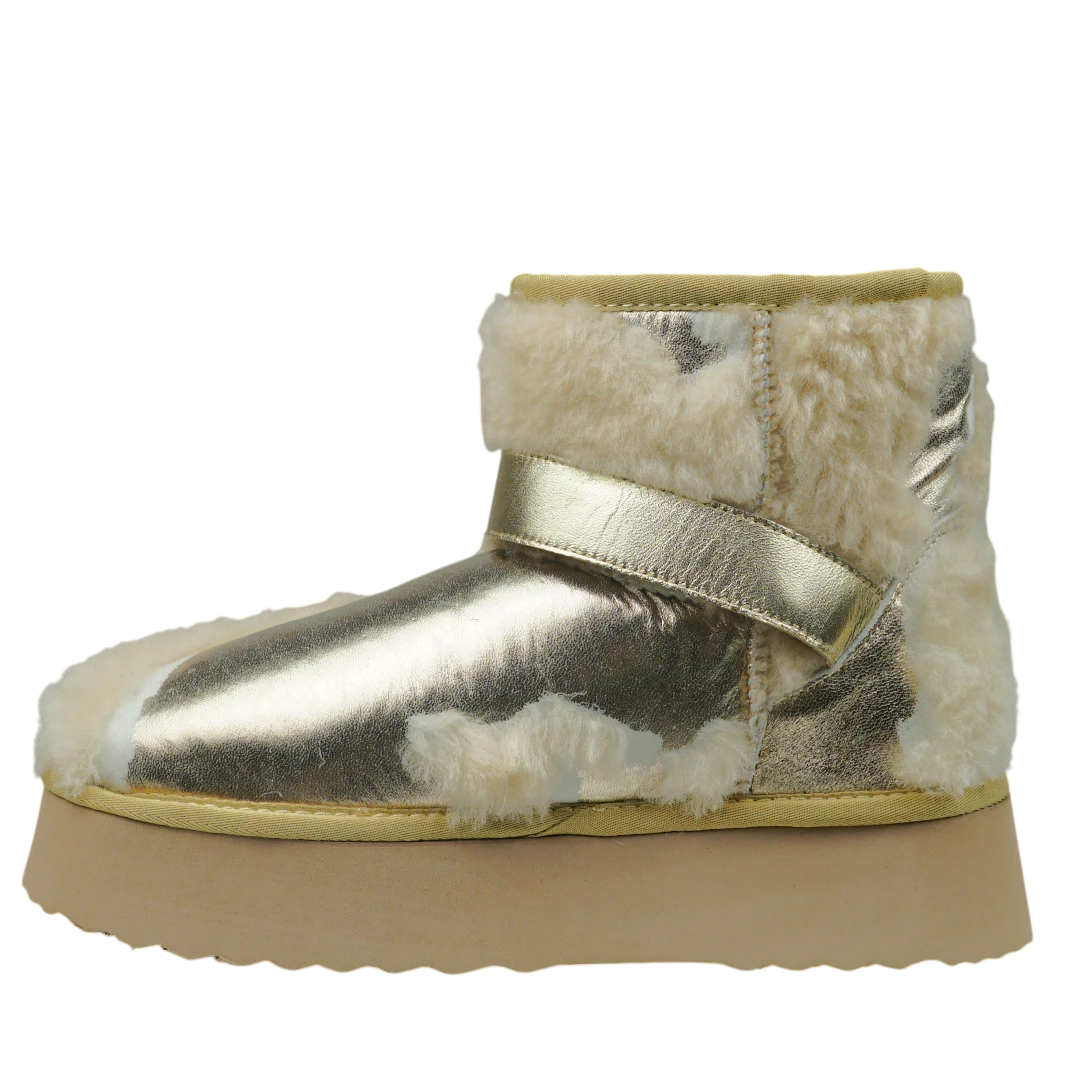 Ove Alma en Pena gležnjače spajaju toplinu, glamur i prepoznatljiv ručni potpis brenda. Izrađene od metalizirane zlatne kože u kombinaciji s bogatim umjetnim krznom, pružaju savršenu udobnost i luksuzan izgled u zimskim danima. Masivni platformasti đon osigurava stabilnost i udobnost pri svakom koraku, dok dekorativna zlatna kopča s kristalima dodaje dašak elegancije i sofisticiranosti. Ove tople i moderne gležnjače idealan su izbor za žene koje žele izgledati chic i glamurozno, bez odricanja od udobnosti i topline.