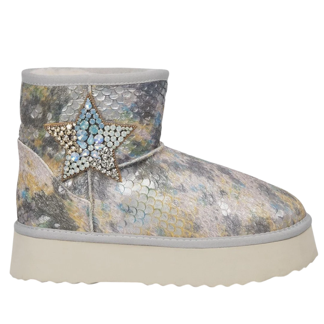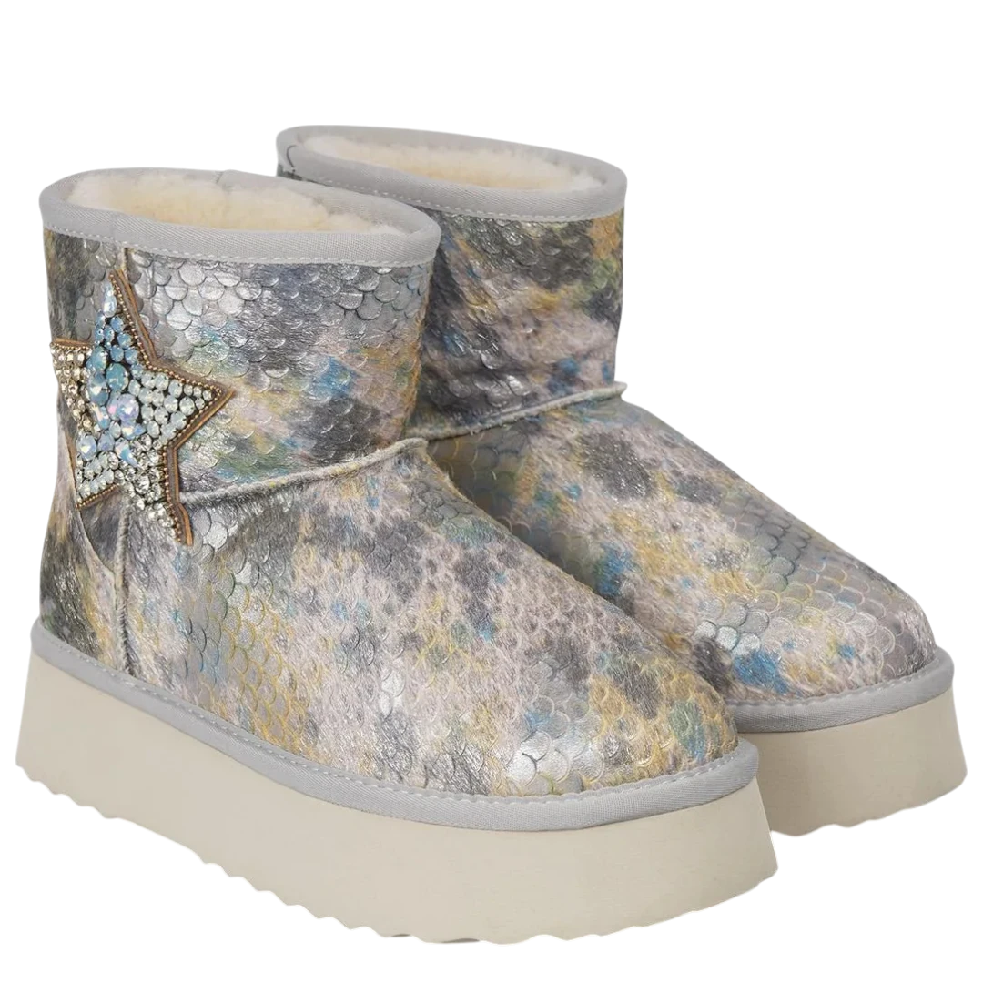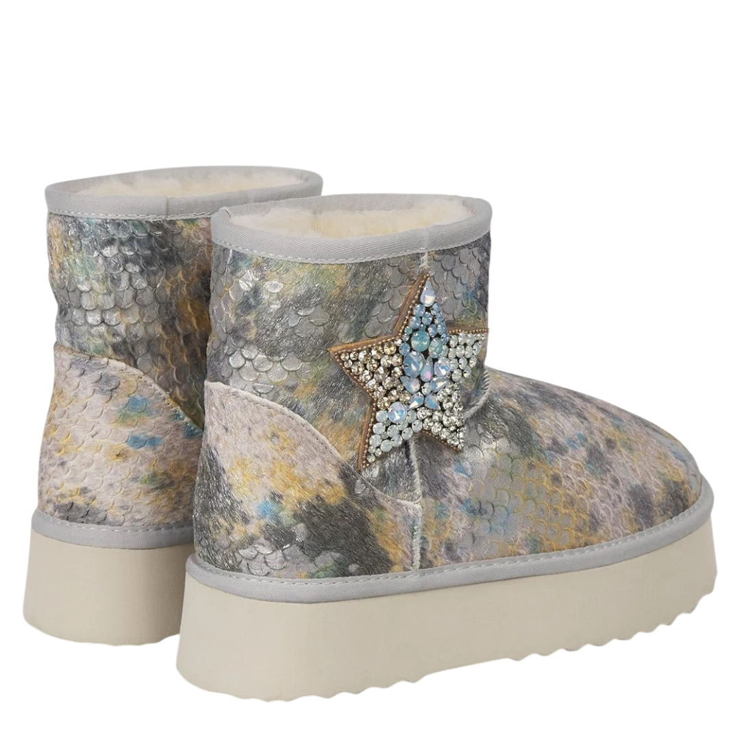 Ove Alma en Pena gležnjače predstavljaju savršenu kombinaciju udobnosti, topline i glamura. Prepoznatljive po svojoj metaliziranoj teksturi s efektom riblje ljuske, ističu se jedinstvenim detaljem u obliku zvijezde ukrašene kristalima koji dodaje dozu luksuza i razigranosti svakom koraku. Unutrašnjost je obložena mekanim, toplim krznom koje pruža osjećaj maksimalne udobnosti tokom hladnih dana, dok lagani gumeni đon osigurava stabilnost i lakoću pri hodu. Ove gležnjače su stvorene za žene koje žele da i u zimskim danima zablistaju — spoj glamura, udobnosti i topline u prepoznatljivom Alma en Pena stilu.