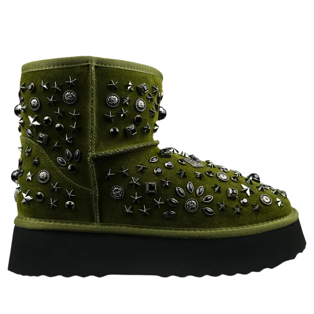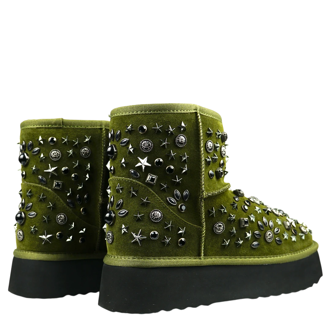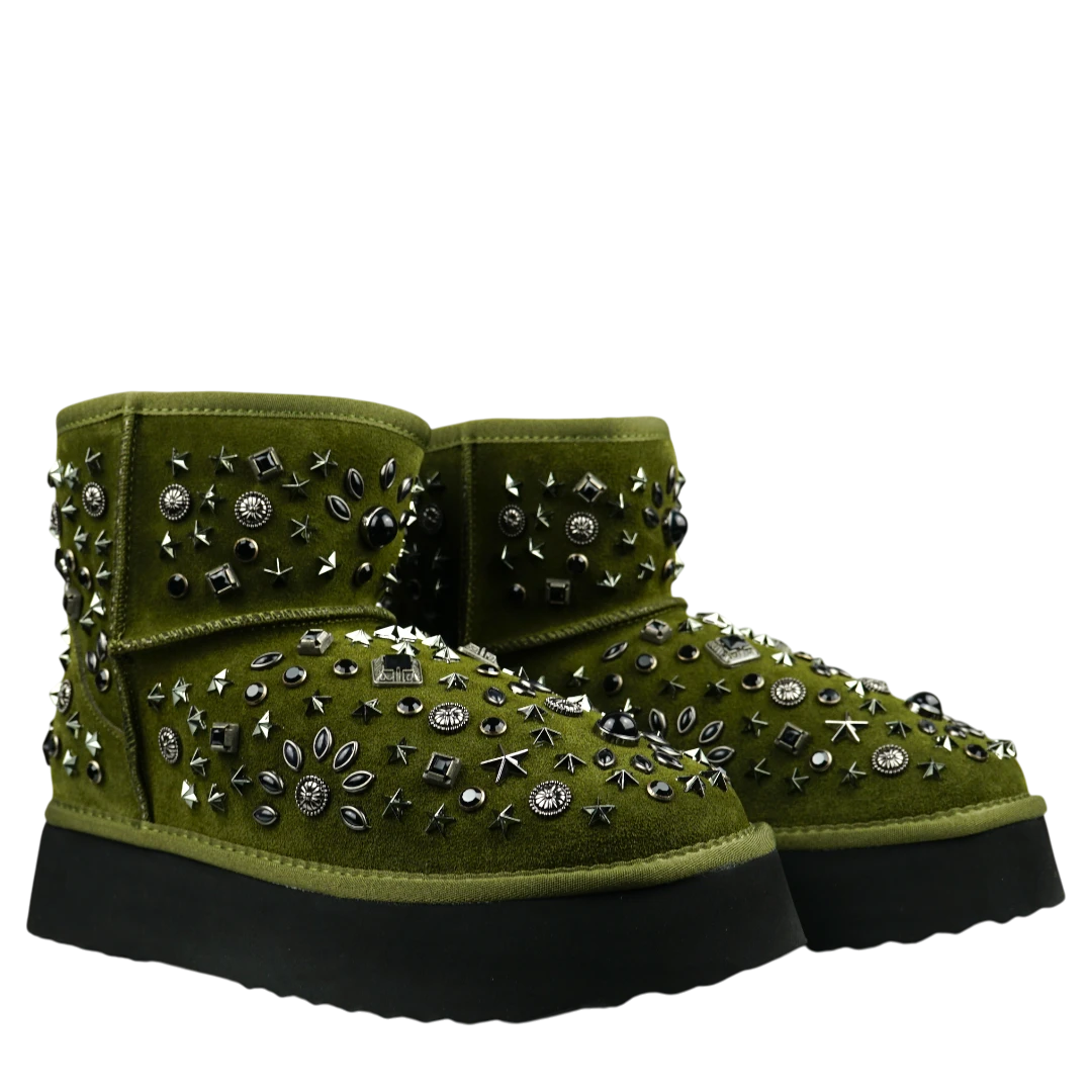 Alma en Pena gležnjače u maslinasto zelenoj boji unose upečatljiv rock-chic karakter u svaku zimsku kombinaciju. Izrađene od luksuzne brušene kože, krase ih bogati metalni ukrasi u različitim oblicima – zvjezdice, zakovice i perle – koji stvaraju jedinstveni trodimenzionalni efekt. Debeli crni gumeni đon pruža udobnost i stabilnost, dok topla unutrašnjost osigurava savršenu zaštitu u hladnim danima. Ove statement gležnjače idealan su izbor za sve koji žele da njihov zimski outfit odiše hrabrošću i autentičnim stilom.