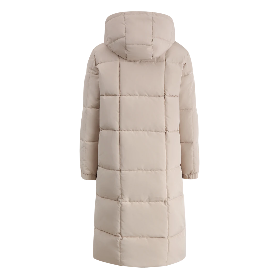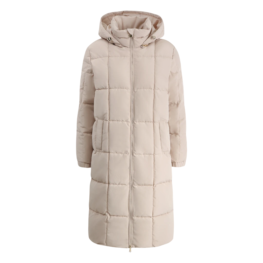 Elegantna duga jakna modernog i minimalističkog dizajna, idealna za hladnije dane kada želite spoj topline, udobnosti i sofisticiranog izgleda. Prošivena struktura s ravnomjernim kvadratnim panelima daje jakni savremen i uredan izgled, dok neutralna bež boja omogućava lako kombinovanje s različitim stilovima – od casual do elegantnih outfita.