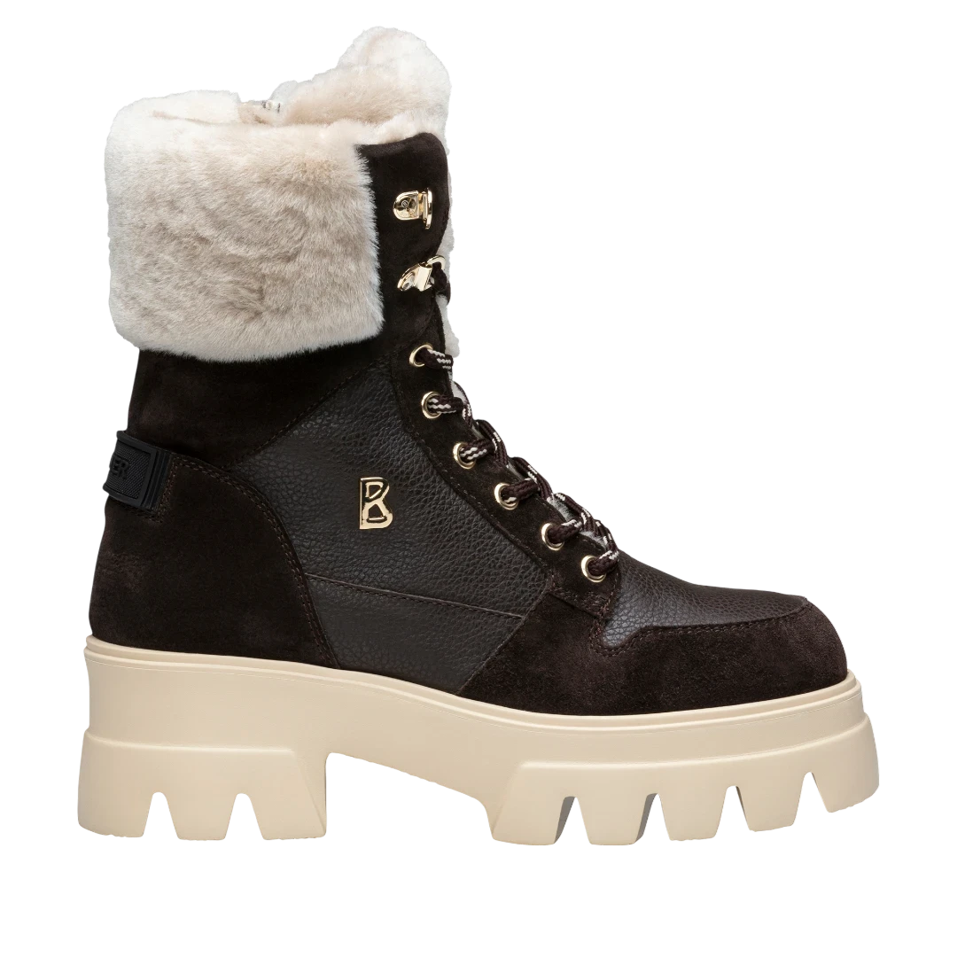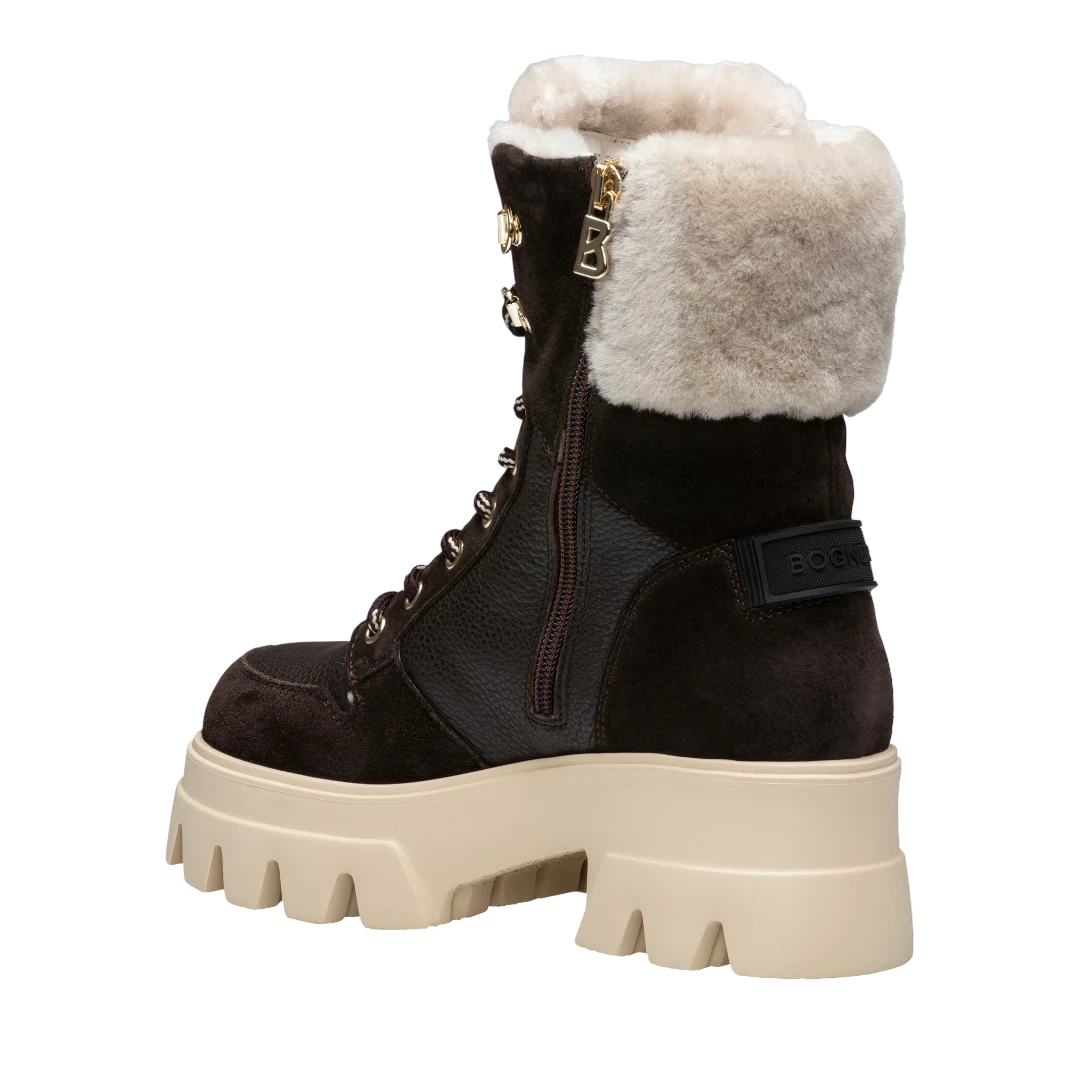 Ove Bogner ženske gležnjače odišu luksuzom, toplinom i modernim planinskim šarmom. Izrađene od kombinacije antilopa i zrnaste kože, s bogatom unutrašnjošću od mekanog umjetnog krzna, pružaju savršen spoj udobnosti i elegancije. Tamnosmeđa nijansa u kontrastu s svijetlim, robusnim potplatom i krznenim okovratnikom donosi atraktivan izgled koji lako nadopunjuje svaku zimsku kombinaciju. Zlatni metalni detalji i prepoznatljivo “B” Bogner logo obilježje ističu luksuzni karakter modela, dok deblji reljefni đon pruža stabilnost i sigurnost pri hodu. Idealne su za žene koje žele savršenu ravnotežu između sofisticiranog dizajna i praktičnosti — savršen izbor za hladne, snježne dane u gradu ili na planini.