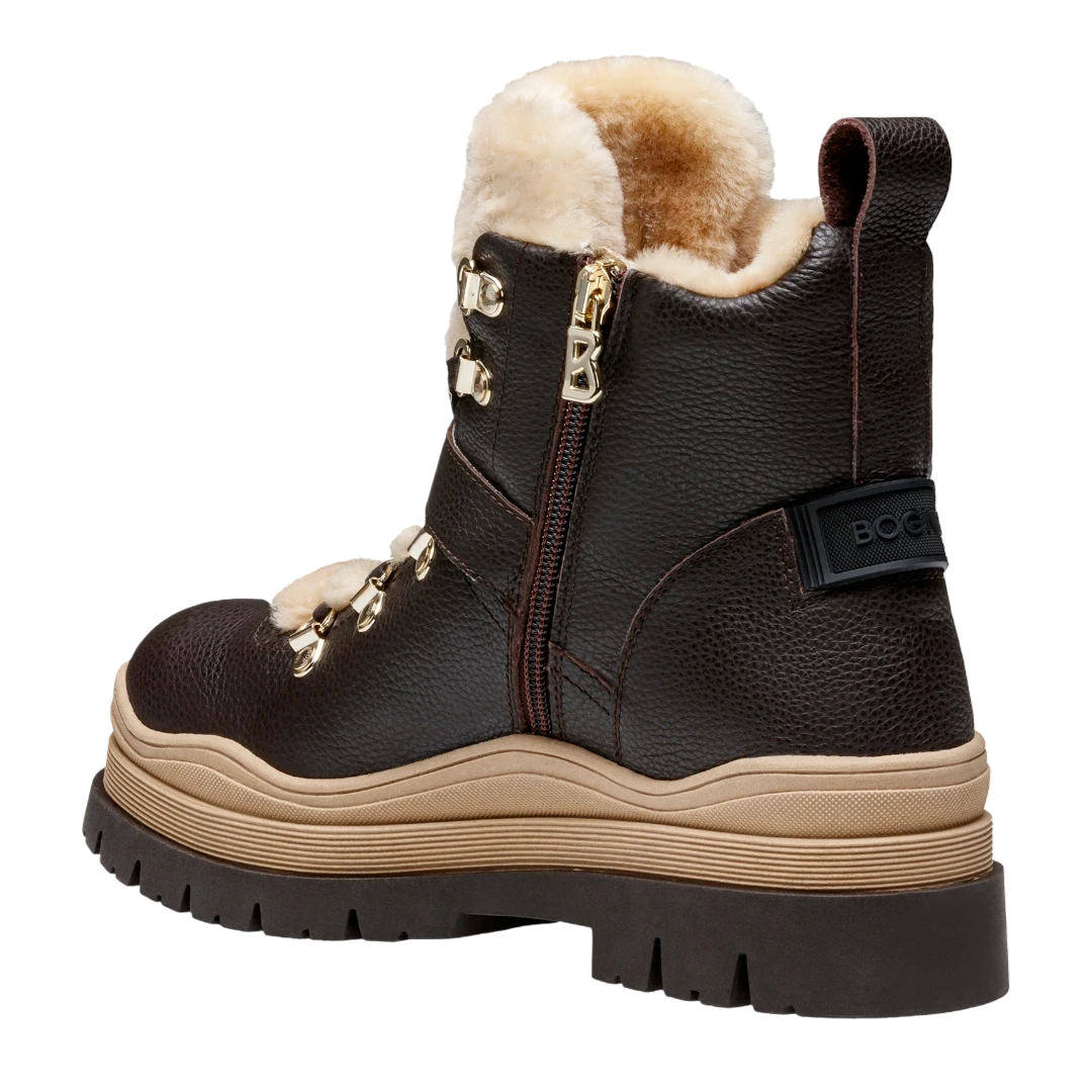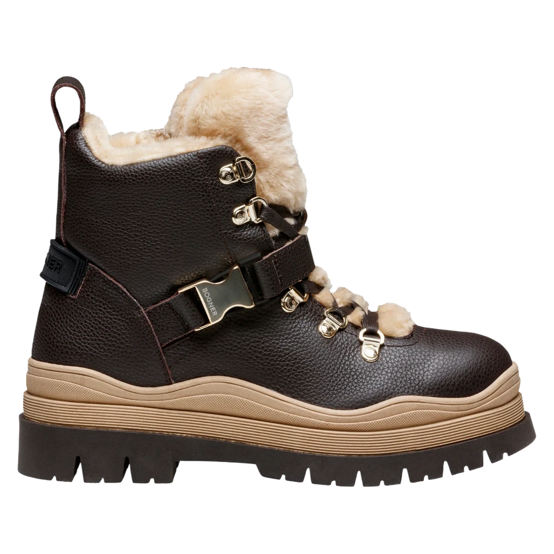 Ove Bogner ženske gležnjače u tamnosmeđoj nijansi predstavljaju savršen spoj robusne elegancije i luksuzne udobnosti. Izrađene su od kvalitetne kože zrnaste teksture, koja osigurava dugotrajnost i otpornost na vremenske uslove, dok je unutrašnjost obložena mekanim krznom koje pruža izuzetnu toplinu i osjećaj ugode tokom hladnih zimskih dana. Posebnu notu sofisticiranosti donosi metalna kopča s Bogner logom, koja istovremeno služi i kao dekorativni i funkcionalni element. Masivan gumeni đon s izraženim profilom garantuje stabilnost i dobro prianjanje na različitim podlogama, dok zlatni detalji i planinarske kukice dodaju luksuzan završni izgled.