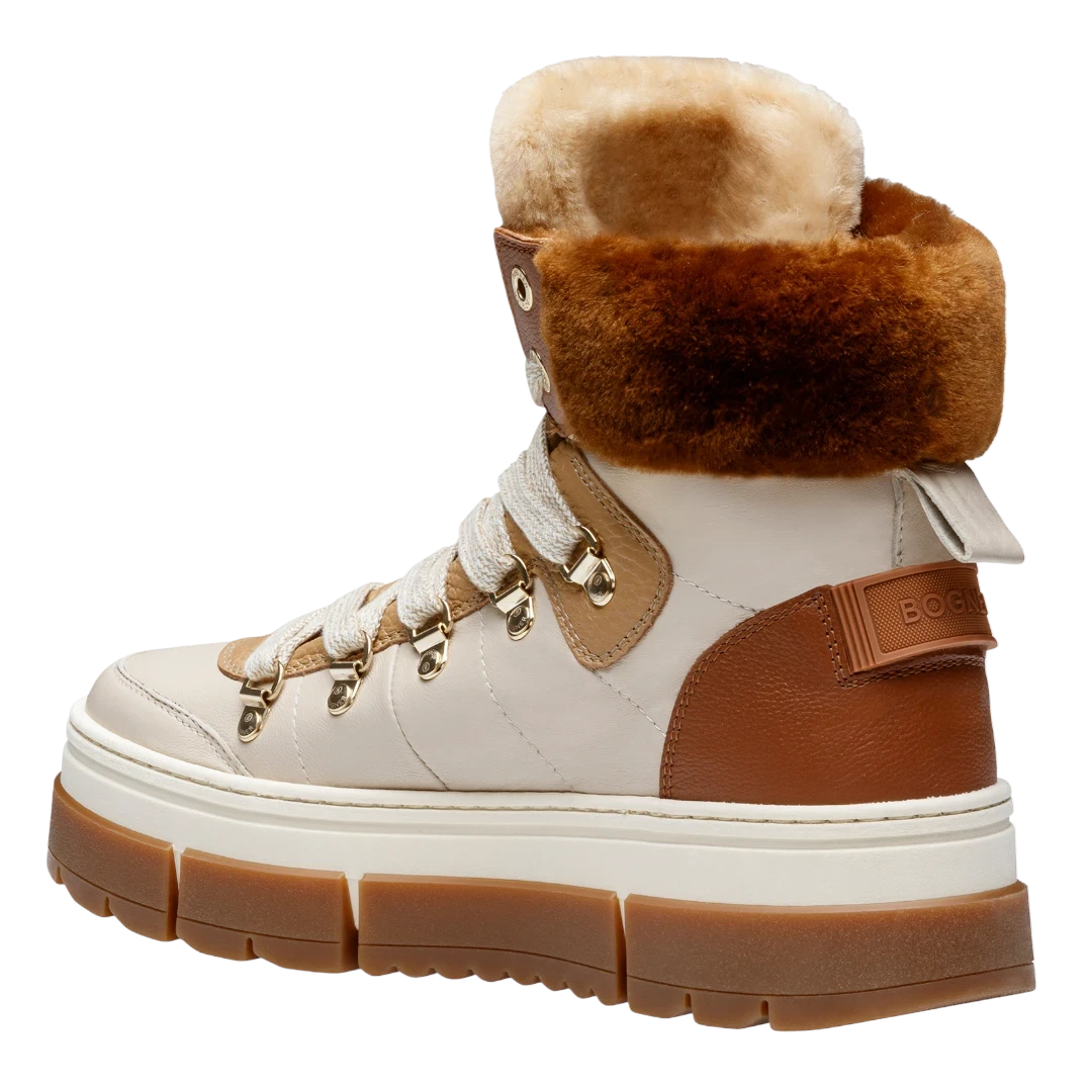 Ove Bogner ženske gležnjače donose spoj vrhunskog luksuza, topline i sportskog duha u prepoznatljivom zimskom stilu brenda. Izrađene od kombinacije glatke kože, antilopa i mekane ovčje vune, pružaju izuzetnu udobnost i toplinsku izolaciju tokom najhladnijih dana. Kontrastni tonovi bež i konjak smeđe boje, uz luksuzni shearling okovratnik, naglašavaju elegantan, ali moderan izgled. Masivni gumeni đon sa izraženim profilom nudi stabilnost i odlično prianjanje, dok dekorativne metalne kukice i pamučne vezice dodaju sofisticiran planinski karakter. Reljefni Bogner logo na peti upotpunjuje dizajn. Savršen izbor za žene koje žele da zadrže stil i eleganciju čak i u zimskim uslovima.