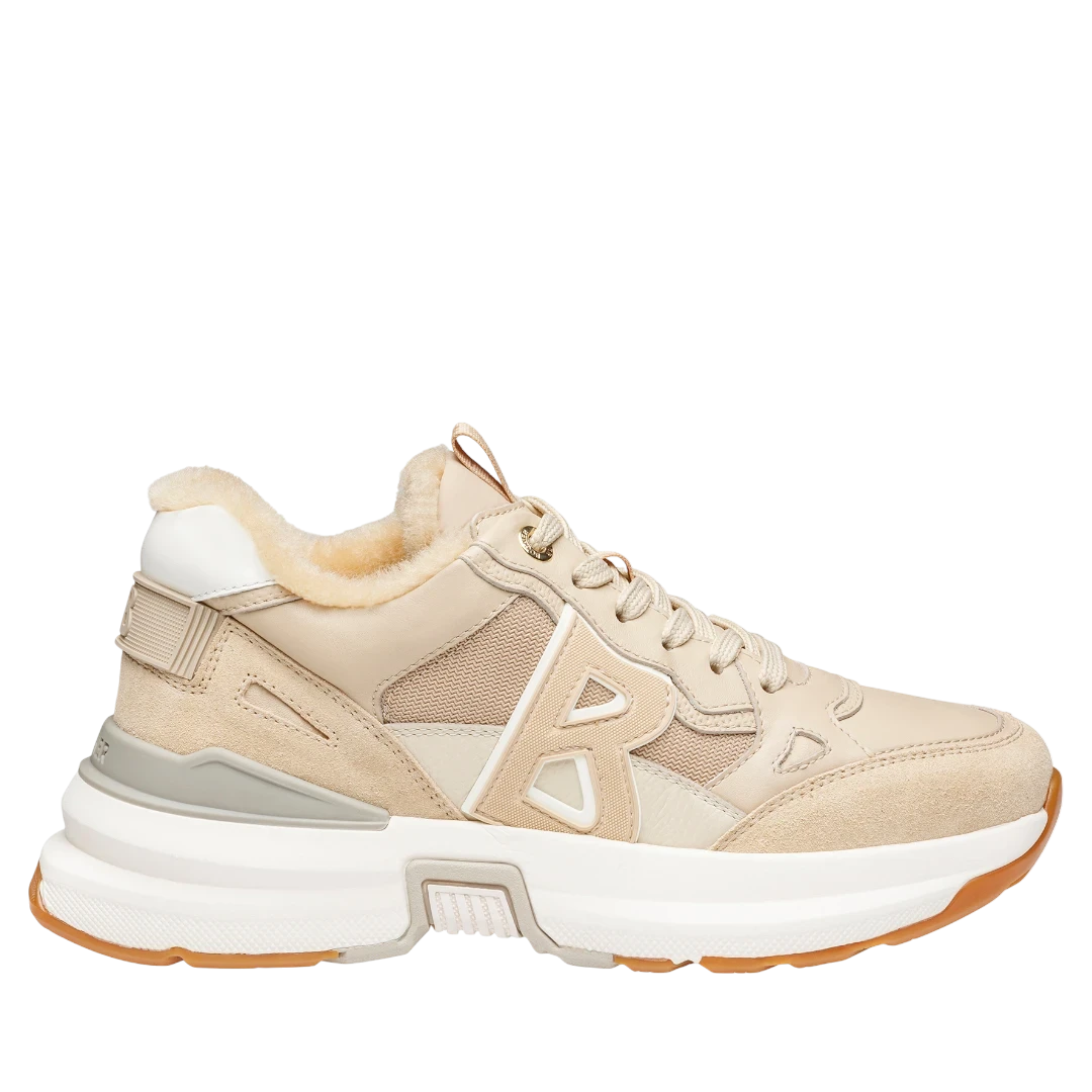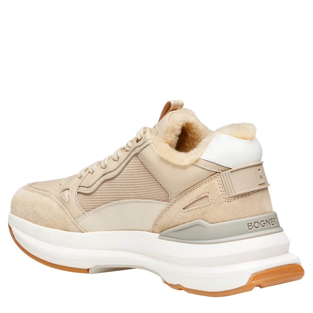 Ove Bogner ženske patike u nježnoj bež nijansi savršeno kombinuju sportski dizajn i luksuznu udobnost. Izrađene od kombinacije kože, antilopa i mrežastih materijala, nude prozračnost, fleksibilnost i moderan izgled. Unutrašnjost je postavljena mekanim krznom, što ih čini idealnim izborom za hladnije dane. Prepoznatljiv 3D “B” logo na bočnoj strani i višeslojni potplat u kontrastnim tonovima bež, bijele i karamel boje daju im dinamičan i sofisticiran karakter. Deblji gumeni đon pruža stabilnost i izuzetnu udobnost, dok svaki detalj odražava vrhunski kvalitet brenda Bogner. Savršene su za žene koje vole spoj sportskog luksuza, topline i modernog urbanog stila.