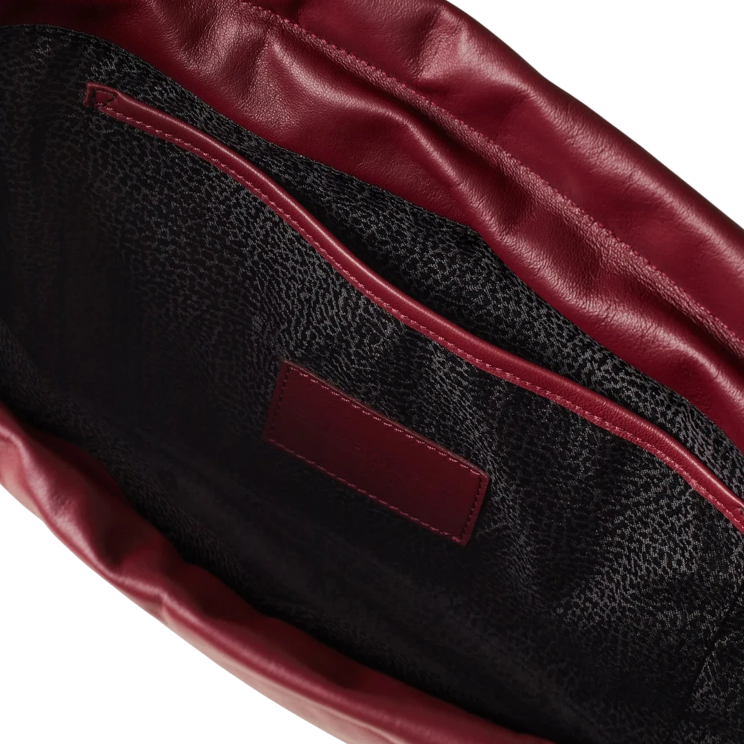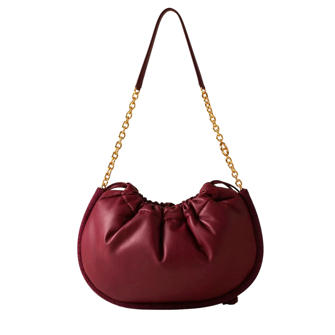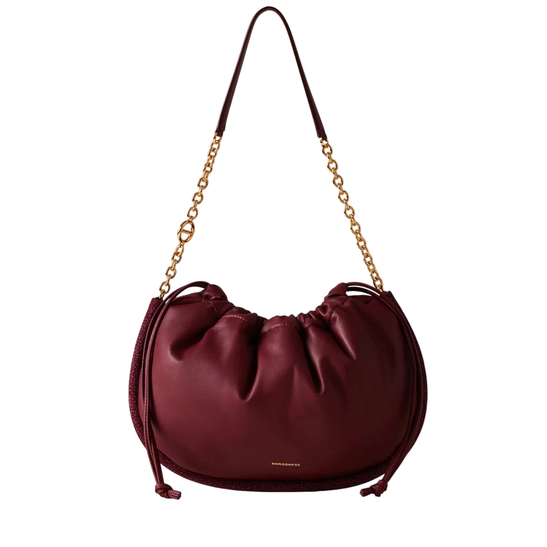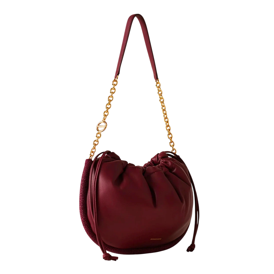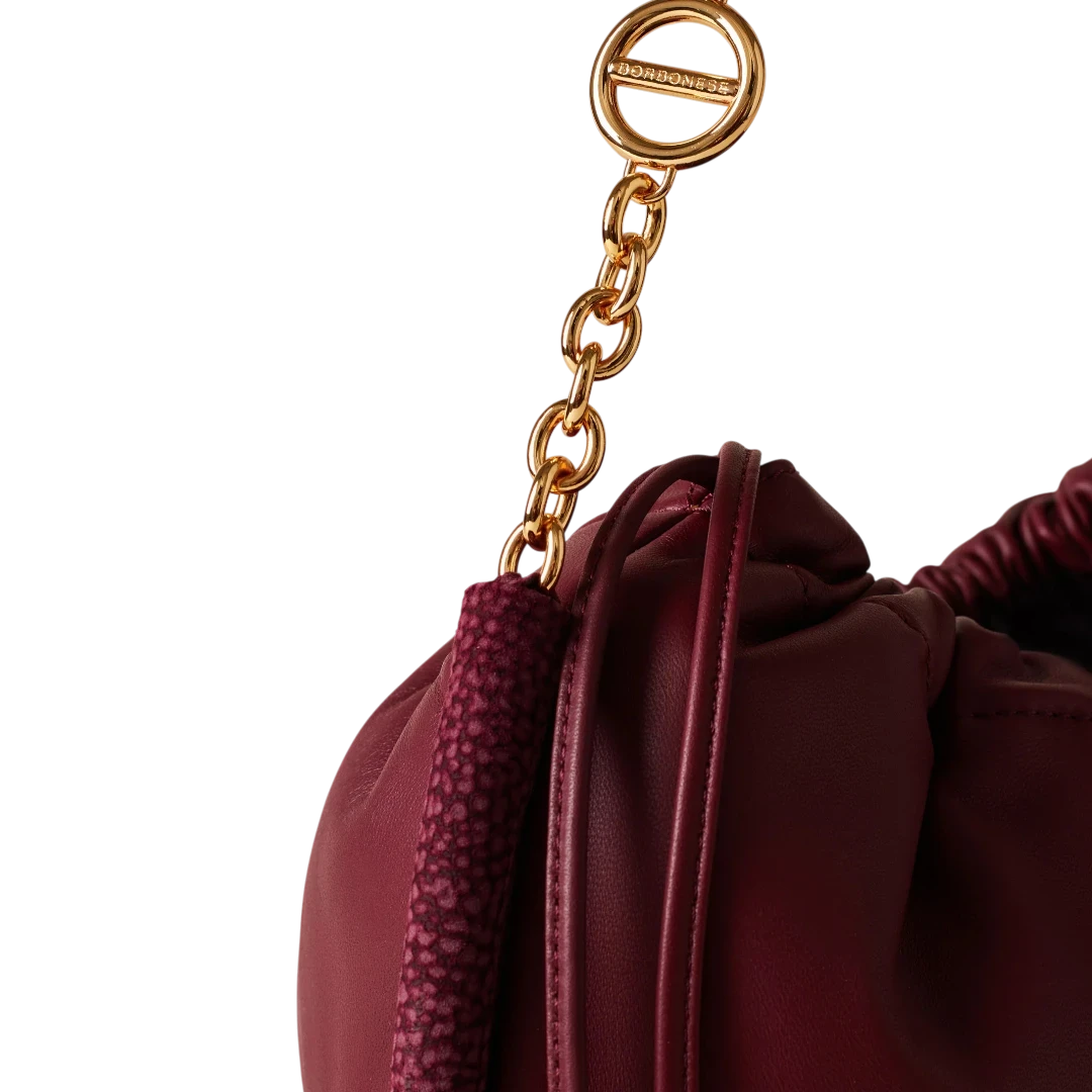 Elegantna i prefinjena, Borbonese torba u bordo boji odiše toplinom i sofisticiranošću karakterističnom za italijanski luksuz. Izrađena od glatke, mekane kože s prepoznatljivim O.P. (Occhio di Pernice) detaljima na bočnim rubovima, ova torba spaja tradiciju zanatske izrade i moderan dizajn. Zlatni lanac i kožna ručka donose kontrast koji naglašava ženstvenost i eleganciju, dok praktično zatvaranje na zatezanje čini torbu funkcionalnom i modernom. Savršen dodatak za svaku priliku — od dnevnog outfita do večernjeg izdanja, ova torba utjelovljuje bezvremenski duh brenda Borbonese.