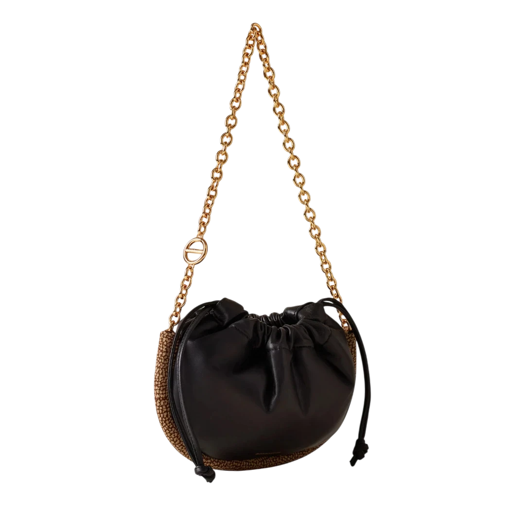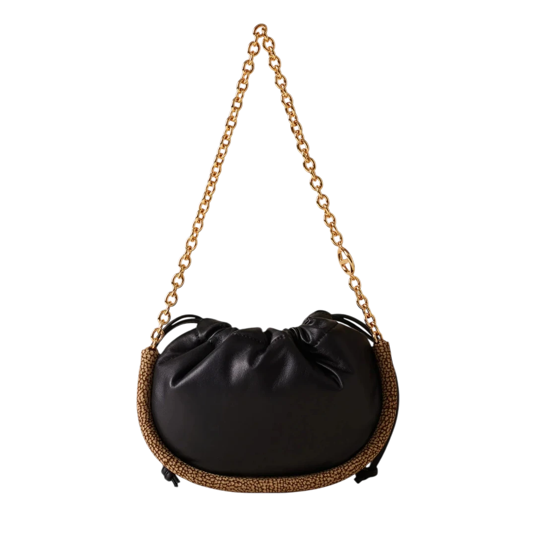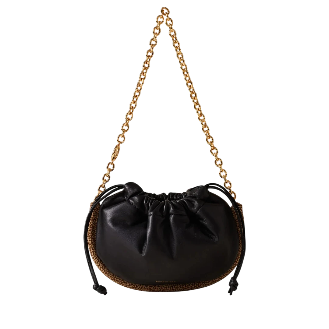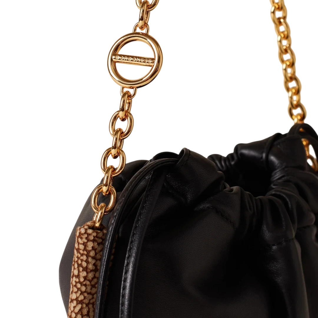 Elegantna i profinjena, Borbonese torba u klasičnoj crnoj boji utjelovljuje bezvremenski italijanski luksuz. Izrađena od mekane, visokokvalitetne kože, krasi je prepoznatljiv O.P. (Occhio di Pernice) detalj na rubovima, koji unosi teksturalni kontrast i prepoznatljiv DNK brenda. Zlatni lanac dodaje dozu glamura, dok zaobljeni oblik i praktično zatvaranje na zatezanje čine ovu torbu savršenom ravnotežom stila i funkcionalnosti. Idealan izbor za žene koje traže sofisticiran, ali moderan dodatak – torba koja s lakoćom prelazi iz dnevnih u večernje kombinacije.