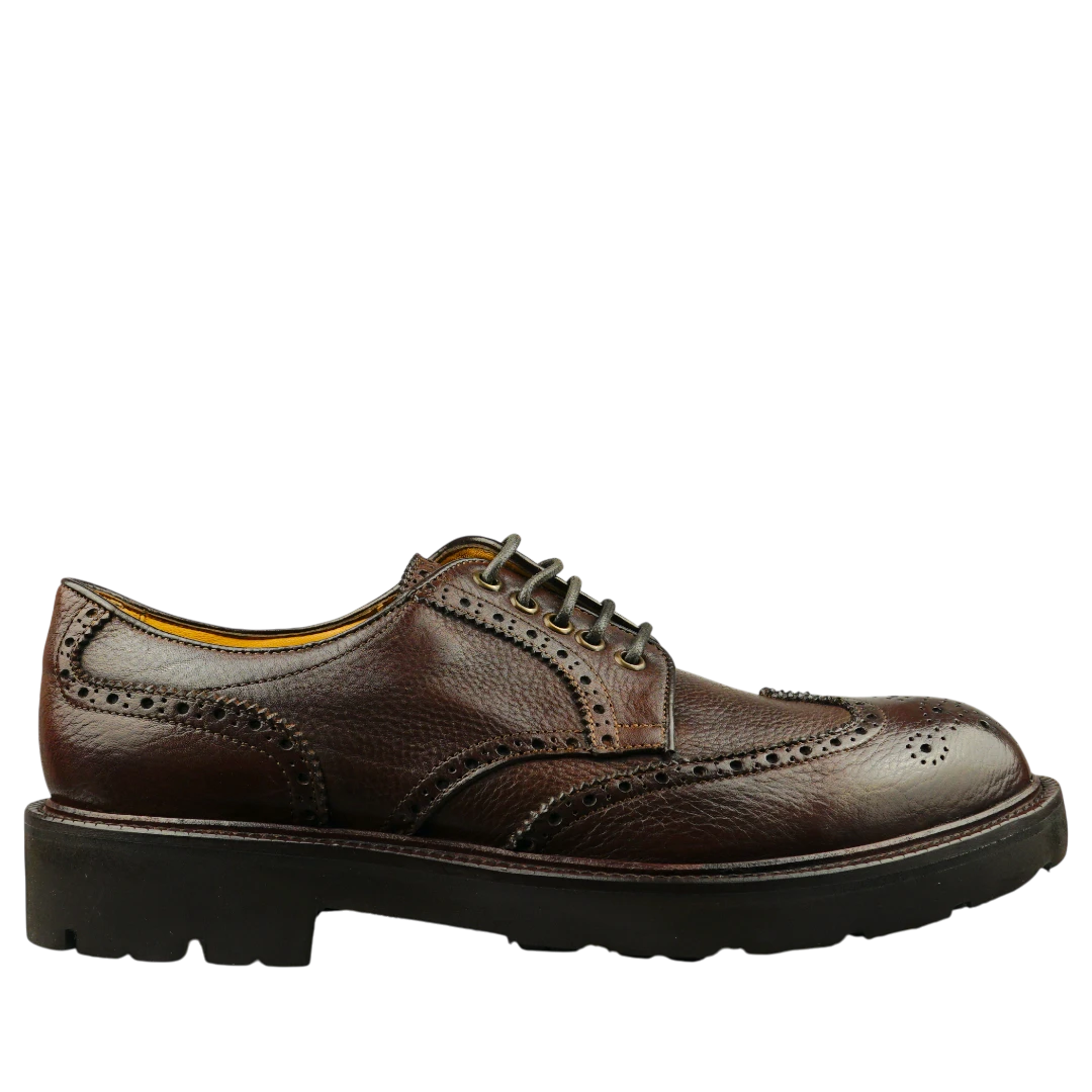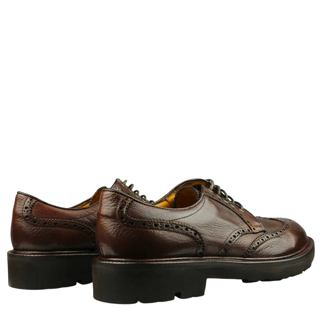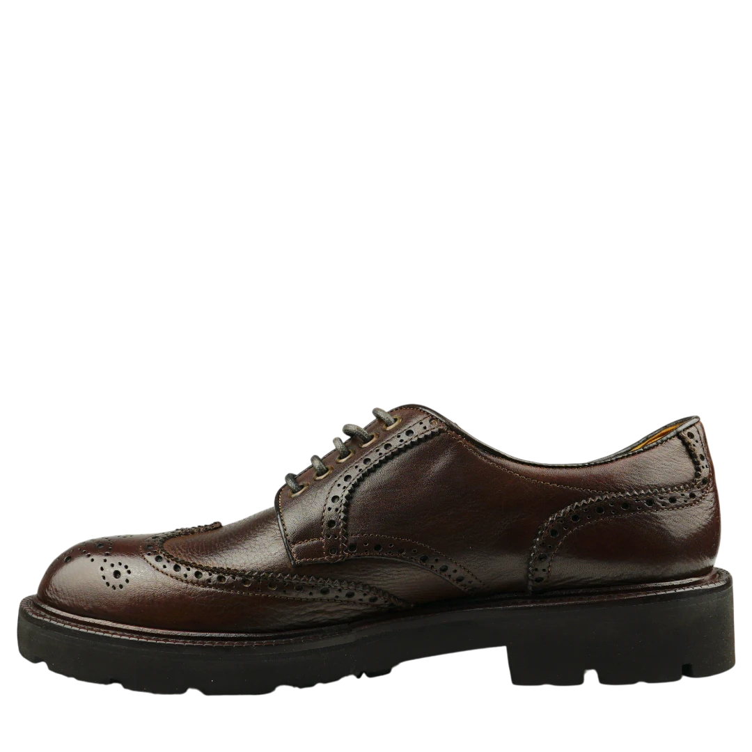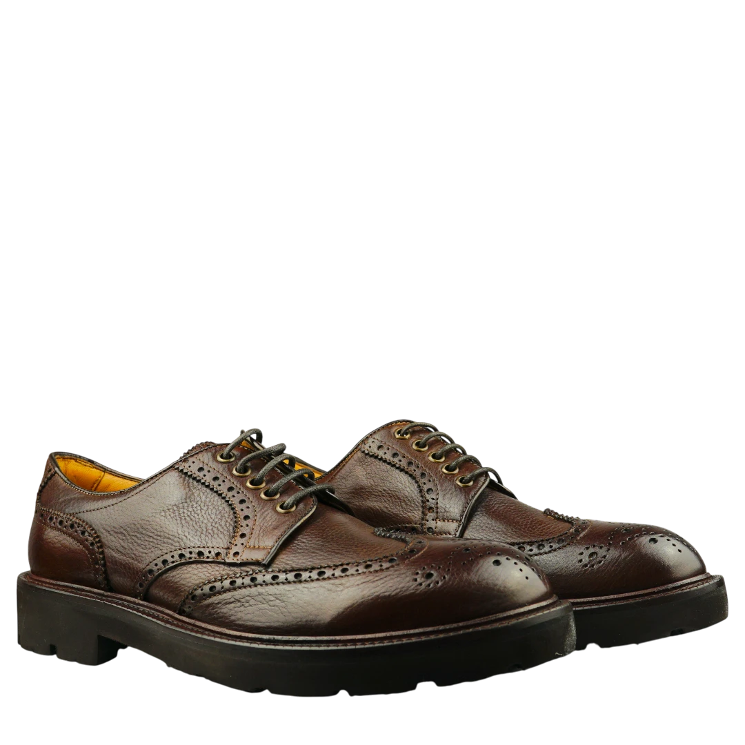 Ove Calpierre muške cipele savršen su primjer italijanske elegancije i besprijekorne izrade. Ručno izrađene od vrhunske smeđe kože s prepoznatljivim brogue perforacijama, odišu klasikom i sofisticiranošću. Masivni gumeni đon pruža stabilnost i udobnost, dok tekstura kože dodaje luksuznu notu svakom outfitu. Idealne su za poslovne kombinacije, ali i za casual elegantne prilike kada želite izgledati profinjeno i moderno u isto vrijeme.