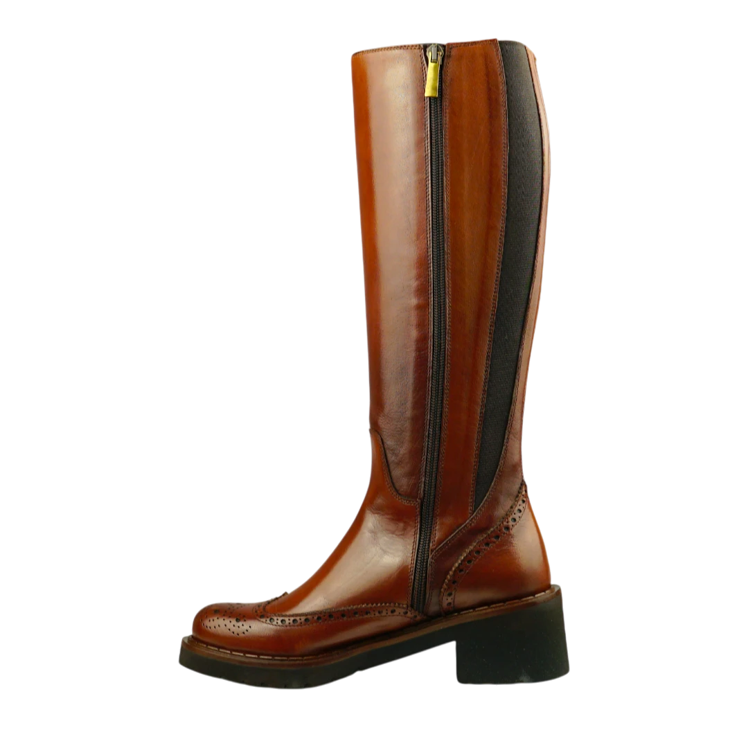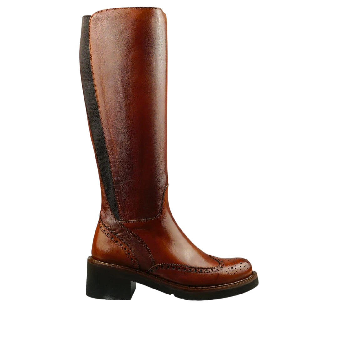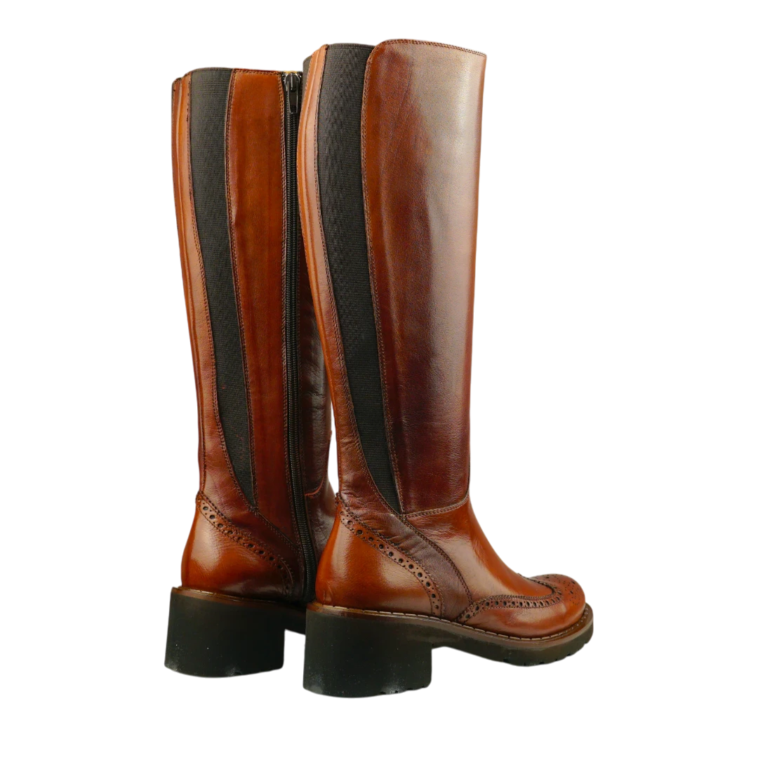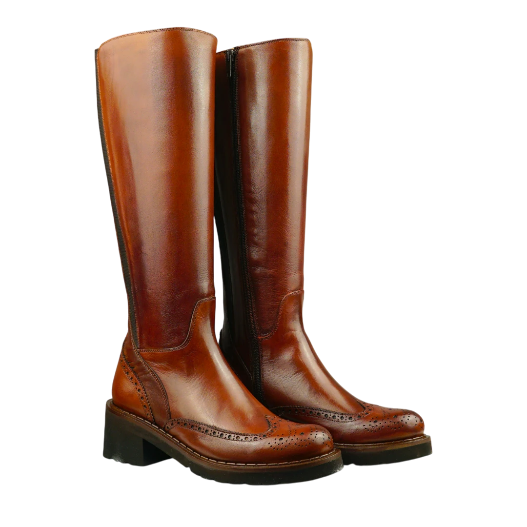 Ove Calpierre čizme u toploj konjak boji izrađene su od vrhunske glatke kože i predstavljaju savršen spoj italijanske elegancije i bezvremenskog stila. Dizajn do koljena s prepoznatljivim brogue perforacijama donosi klasičan “equestrian” izgled, dok elastični umetak pozadi osigurava savršeno pristajanje. Stabilna peta pruža udobnost i profinjen izgled tokom cijelog dana. Idealne su za dame koje traže luksuzan, ali praktičan par čizama koji se savršeno uklapa uz kaput, haljinu ili uske pantalone.