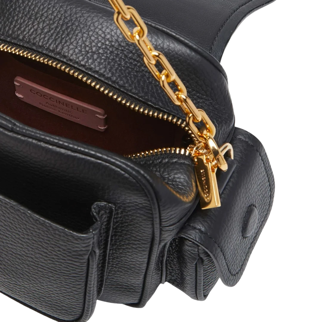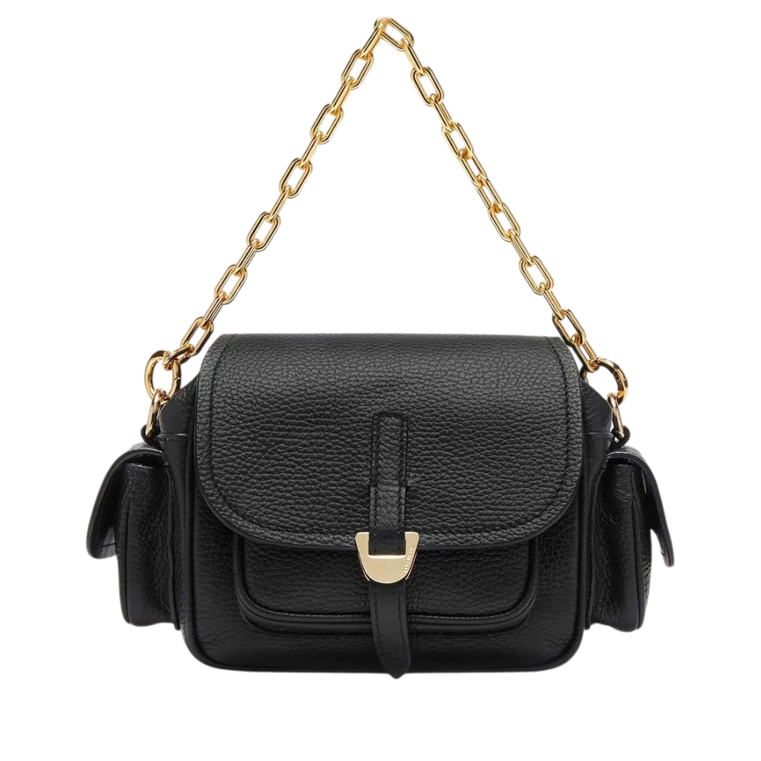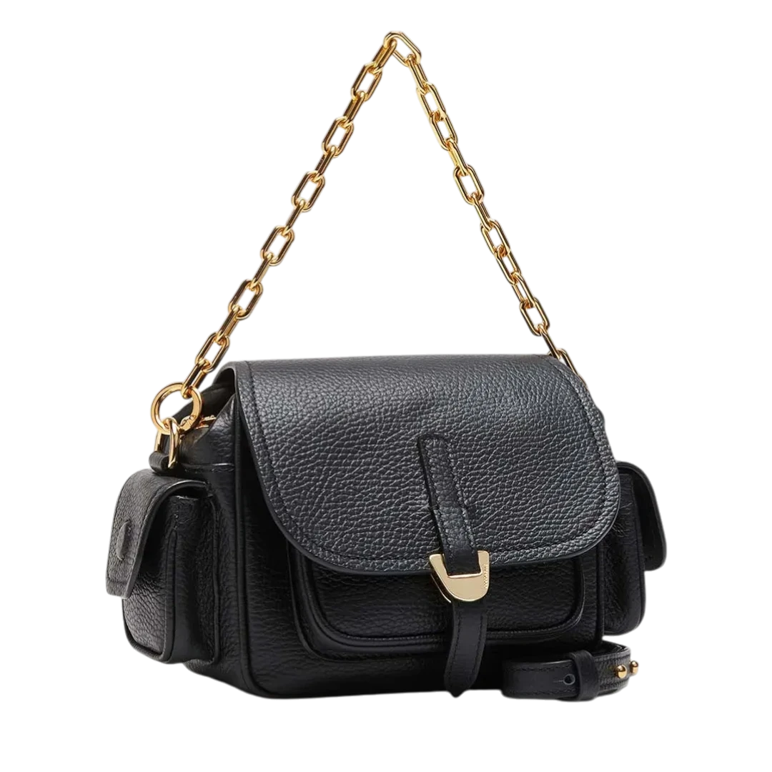 Coccinelle torba u crnoj boji donosi moderan i funkcionalan dizajn s naglaskom na luksuzne detalje. Izrađena od fine granulirane kože, ističe se prepoznatljivim preklopom i elegantnom zlatnom kopčom. Bočni džepovi dodaju praktičnost, dok masivni zlatni lanac služi kao upečatljiva ručka, dajući torbi sofisticiran i trendovski izgled. Kompaktna, a dovoljno prostrana za osnovne potrepštine, ova torba savršen je izbor za žene koje traže spoj elegancije, praktičnosti i modernog stila – od dnevnih kombinacija do večernjih izlazaka.