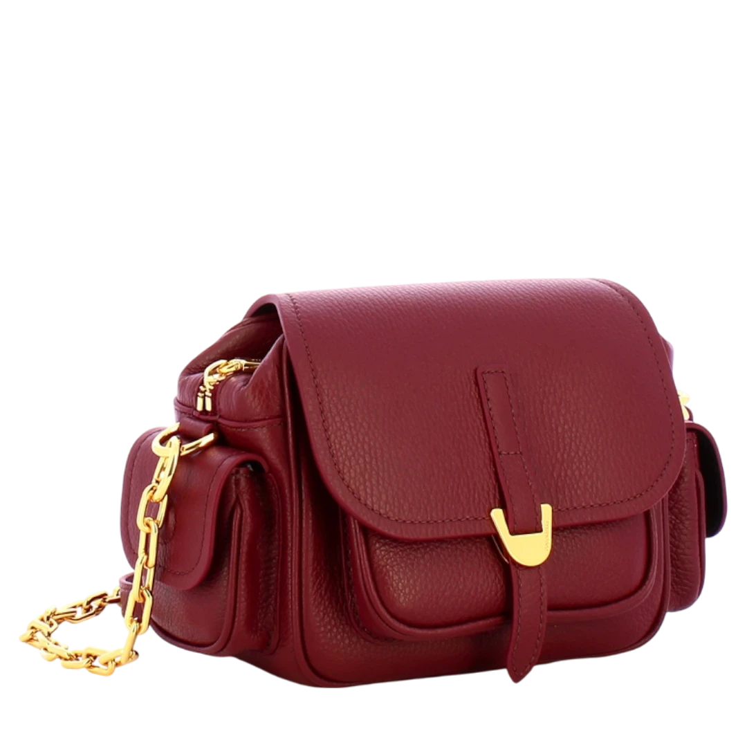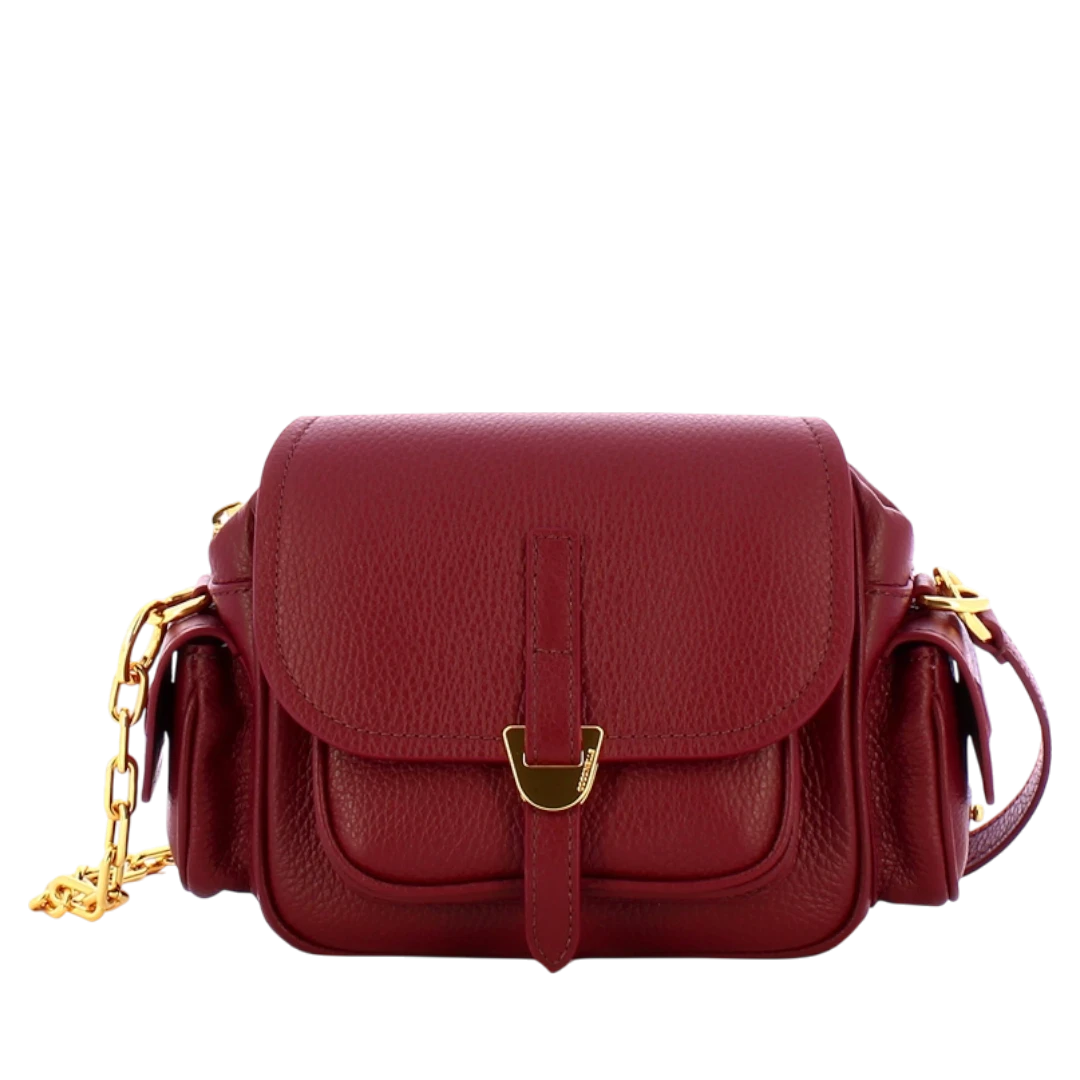 Coccinelle torba u bordo boji donosi moderan i funkcionalan dizajn s naglaskom na luksuzne detalje. Izrađena od fine granulirane kože, ističe se prepoznatljivim preklopom i elegantnom zlatnom kopčom. Bočni džepovi dodaju praktičnost, dok masivni zlatni lanac služi kao upečatljiva ručka, dajući torbi sofisticiran i trendovski izgled. Kompaktna, a dovoljno prostrana za osnovne potrepštine, ova torba savršen je izbor za žene koje traže spoj elegancije, praktičnosti i modernog stila – od dnevnih kombinacija do večernjih izlazaka.