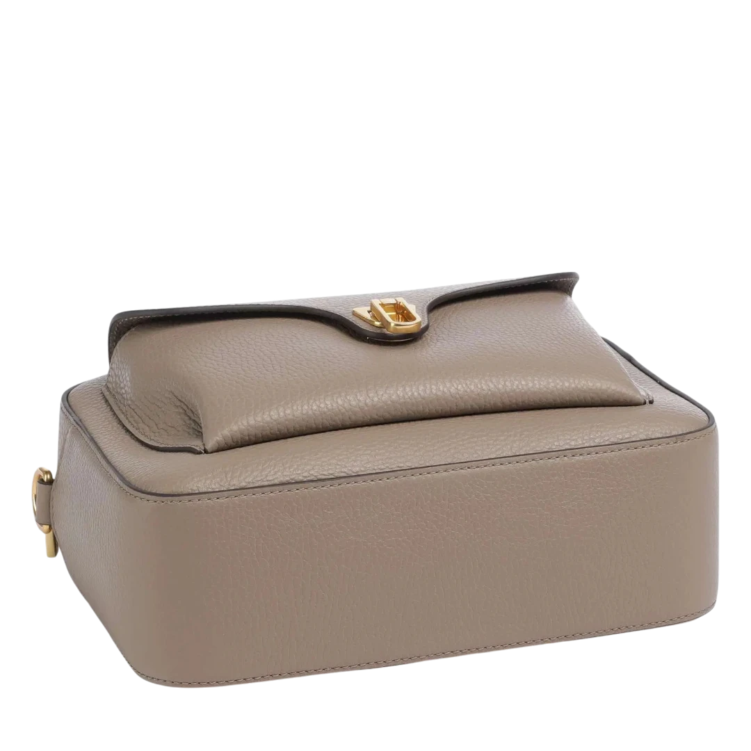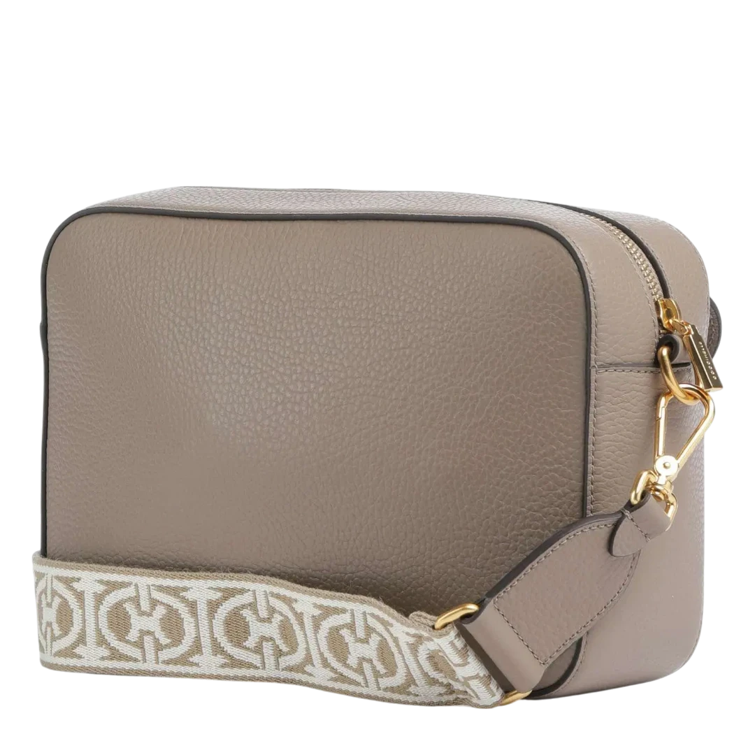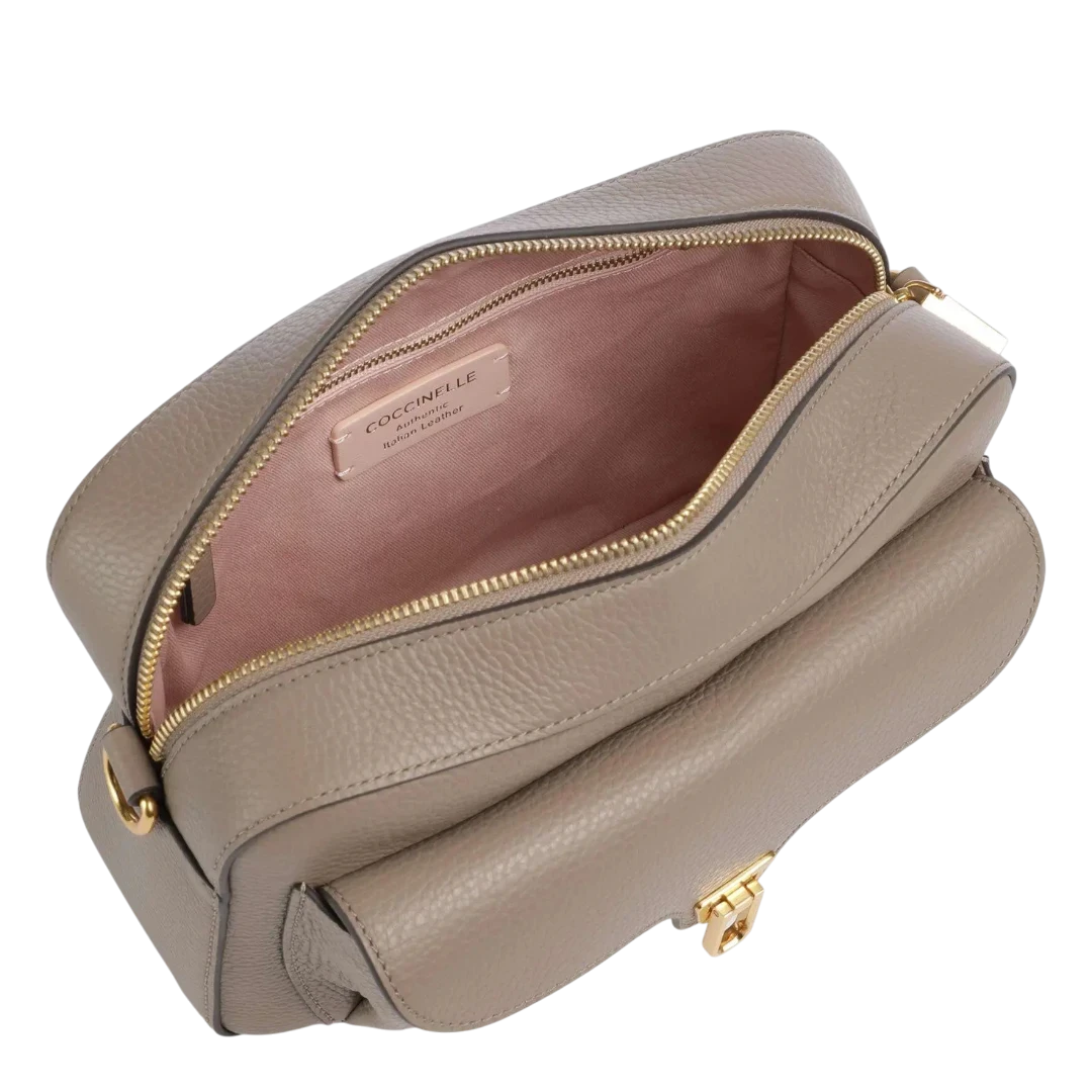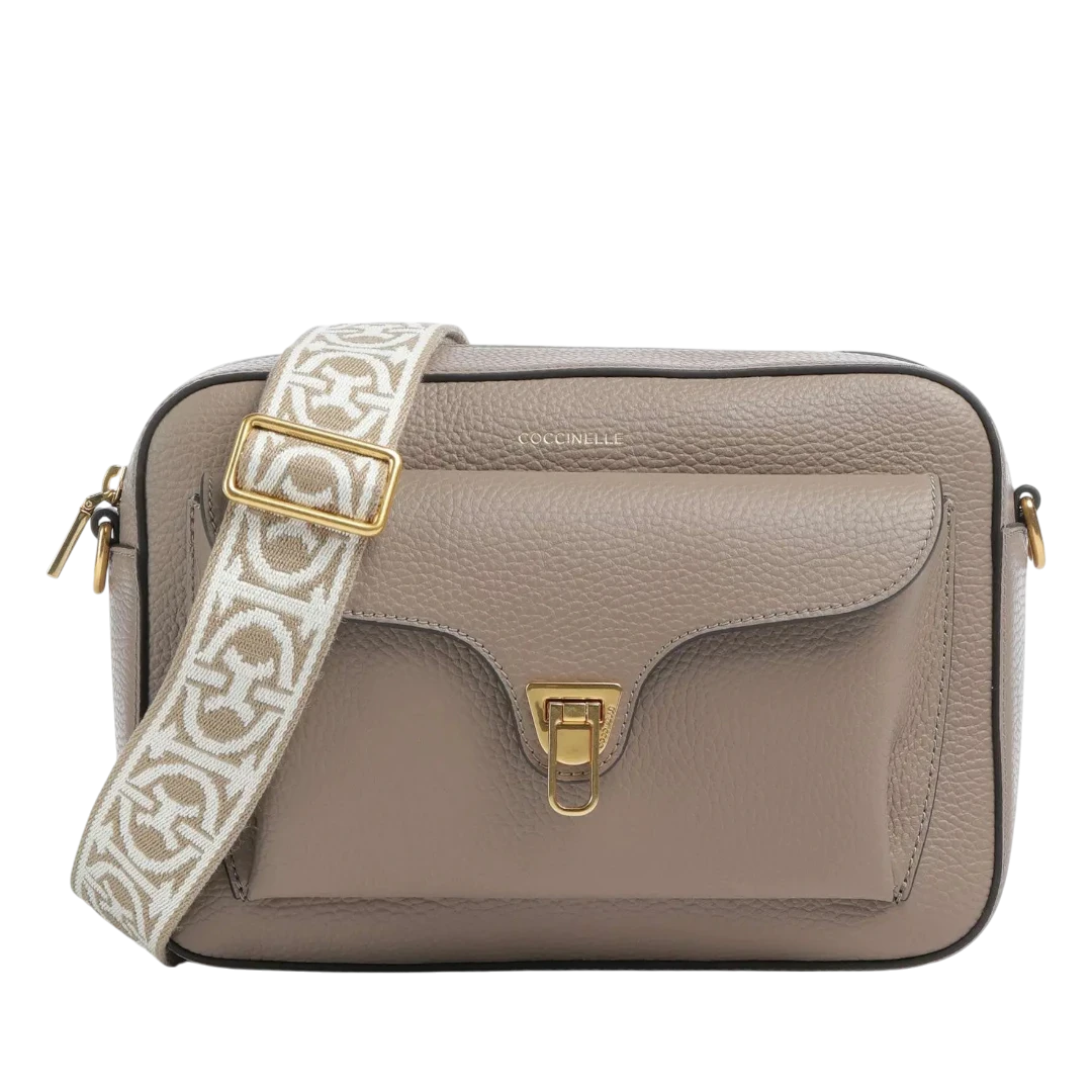 rnaste kože u sofisticiranoj taupe nijansi, krasi je prepoznatljiv prednji džep sa zlatnim metalnim kopčanjem, simbolom profinjenog Coccinelle stila. Poseban akcenat donosi široki platneni kaiš s monogramom brenda, koji dodaje moderan i urbani karakter, čineći torbu idealnom za svakodnevno nošenje. Kompaktan oblik i funkcionalna unutrašnjost omogućavaju lako kombinovanje uz dnevne i večernje outfite.