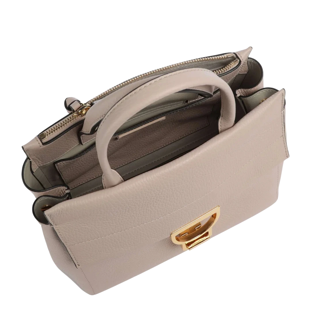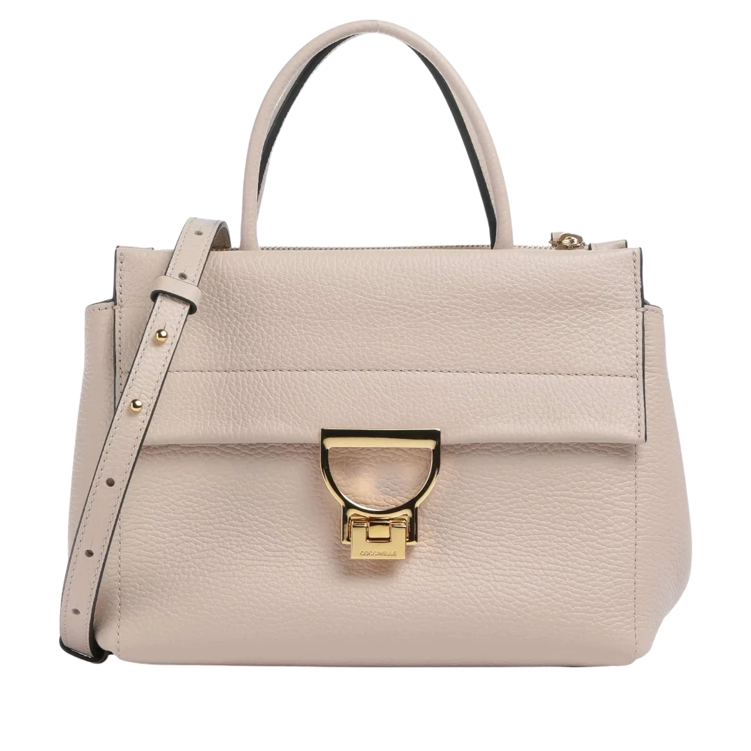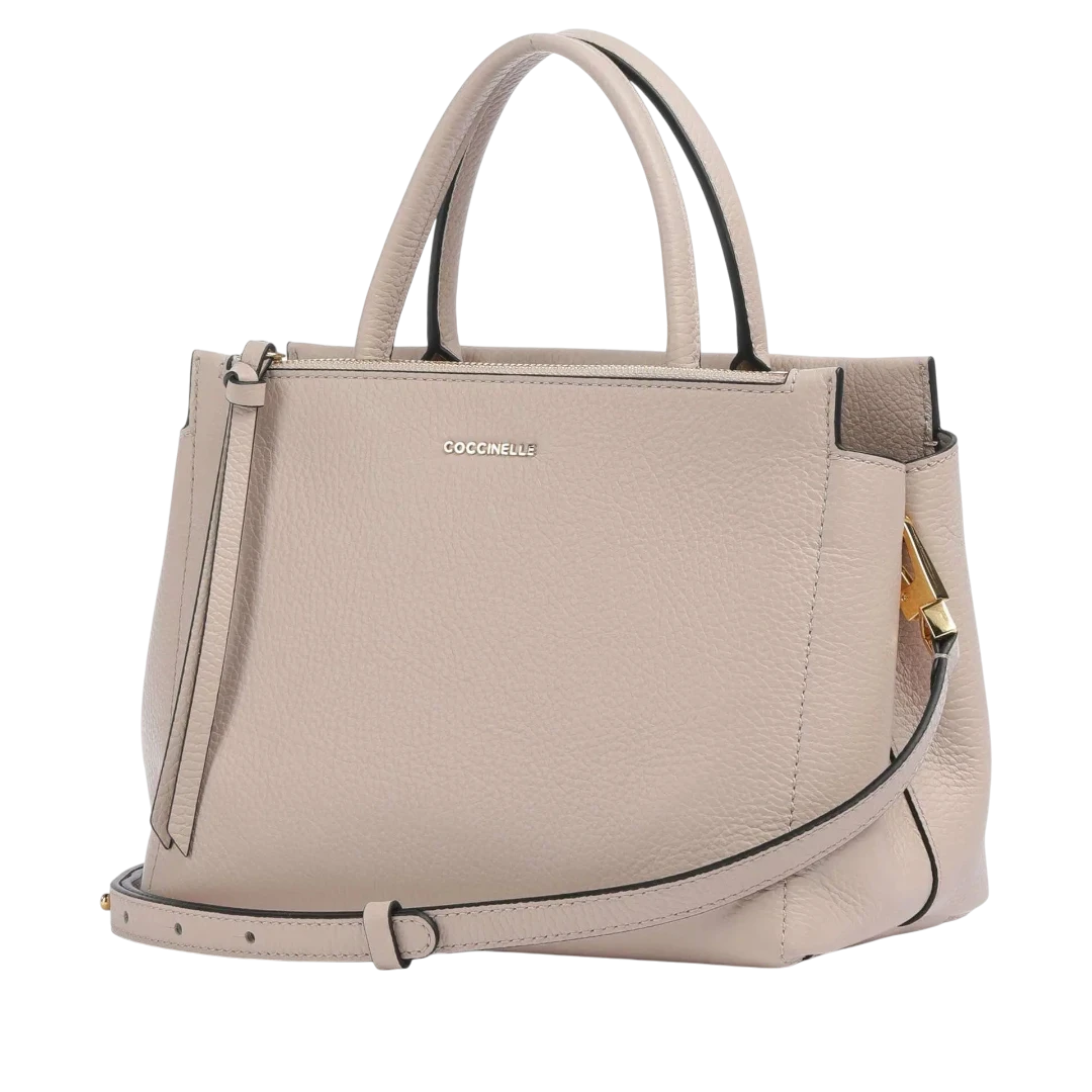 Coccinelle torba u nijansi svijetlog bež tona odiše profinjenošću i bezvremenskim stilom. Izrađena od visokokvalitetne prirodne kože s prepoznatljivom zrnastom teksturom, ova torba spaja luksuz i praktičnost u savršenoj ravnoteži. Zatvara se elegantnom zlatnom metalnom kopčom s Coccinelle potpisom, dok ručka i podesivi remen omogućavaju nošenje u ruci ili preko ramena. Unutrašnjost je organizirana i prostrana, idealna za svakodnevne potrebe moderne žene. Savršen izbor za dame koje cijene italijanski dizajn, sofisticirane detalje i dugotrajnu eleganciju.