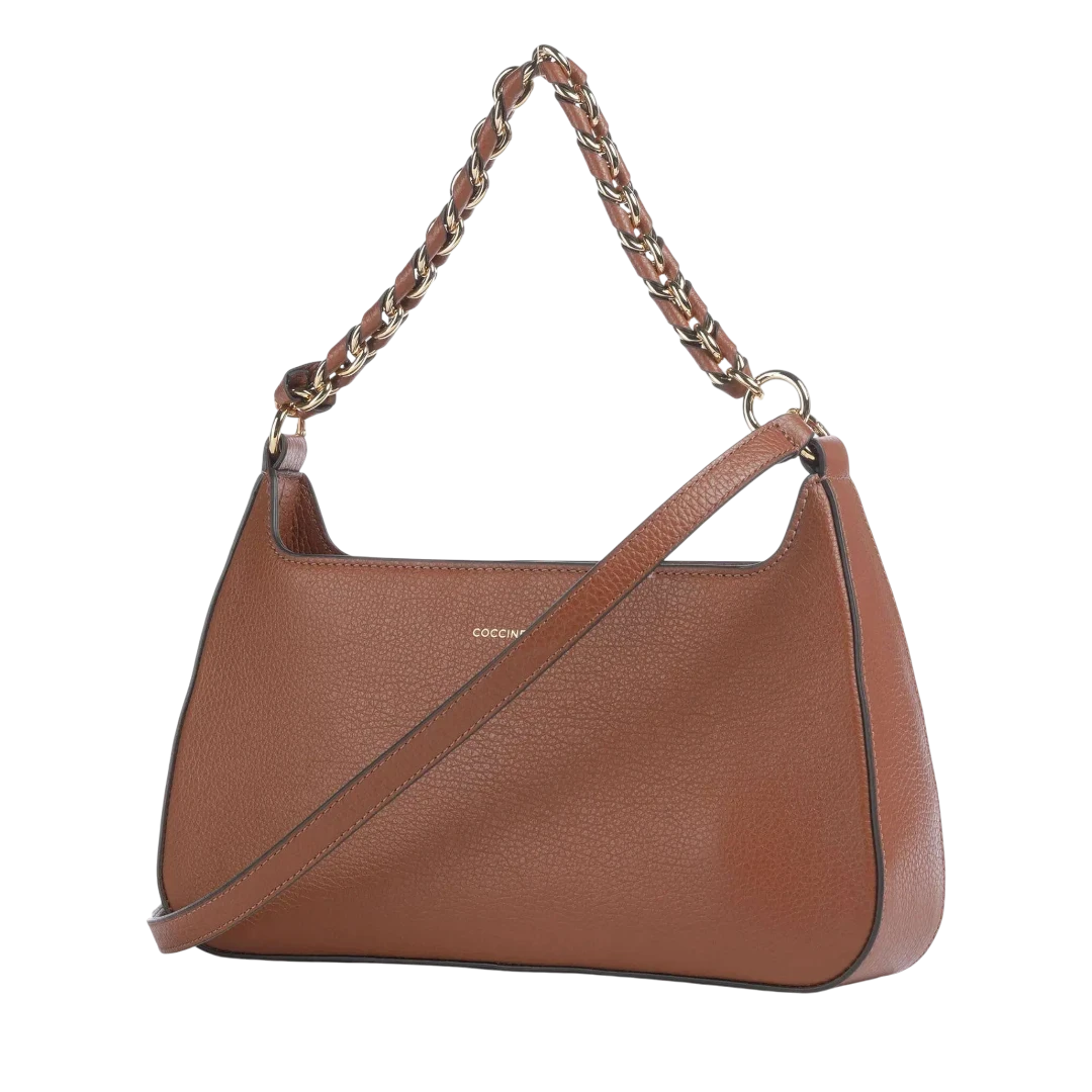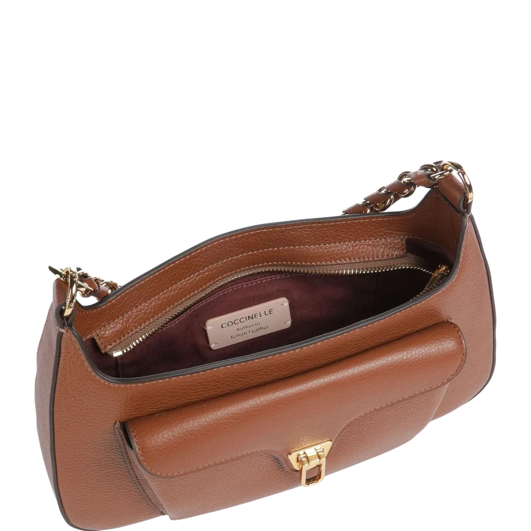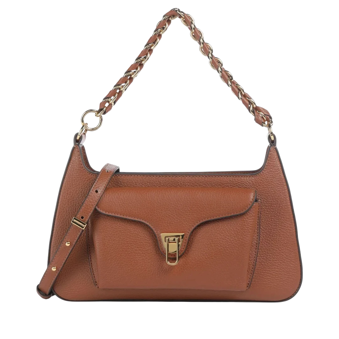Coccinelle torba u nijansi tople konjak smeđe boje odiše profinjenom elegancijom i modernim duhom. Izrađena od luksuzne granulirane kože, ističe se praktičnim prednjim džepom sa metalnom kopčom i sofisticiranim detaljima. Poseban akcenat daje pletena naramenica od kože i zlatnog lanca, koja unosi glamurozan i trendovski ton. Uz to, tu je i dugi podesivi kaiš za nošenje preko ramena ili crossbody stil. Zahvaljujući svom izduženom obliku i prostranosti, ova torba predstavlja savršen balans između funkcionalnosti i italijanskog šika – idealna za dan i noć.