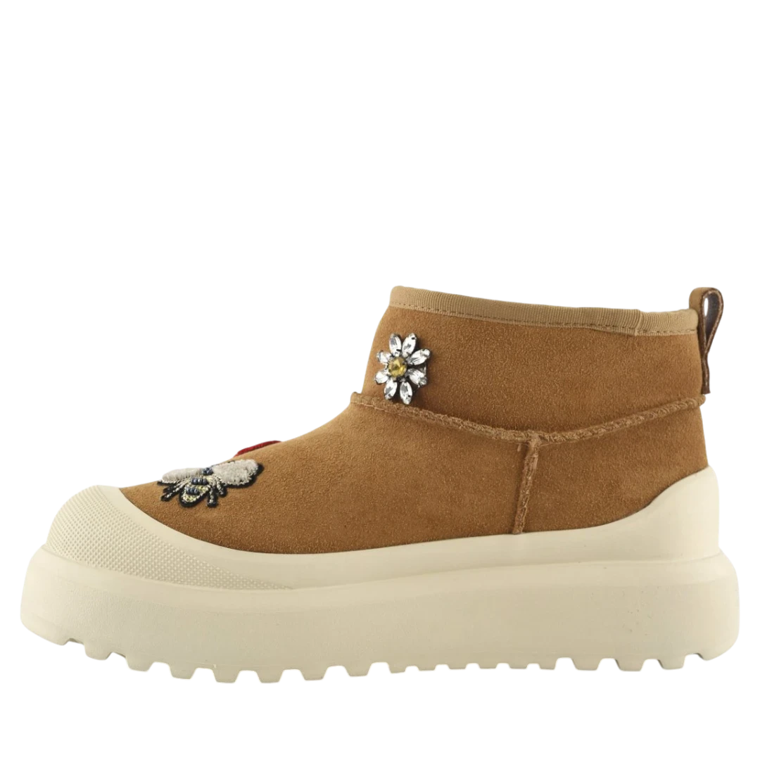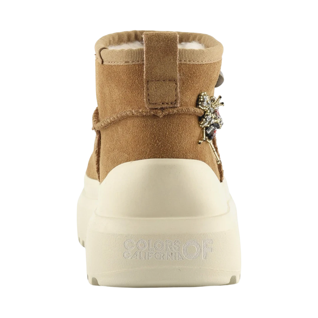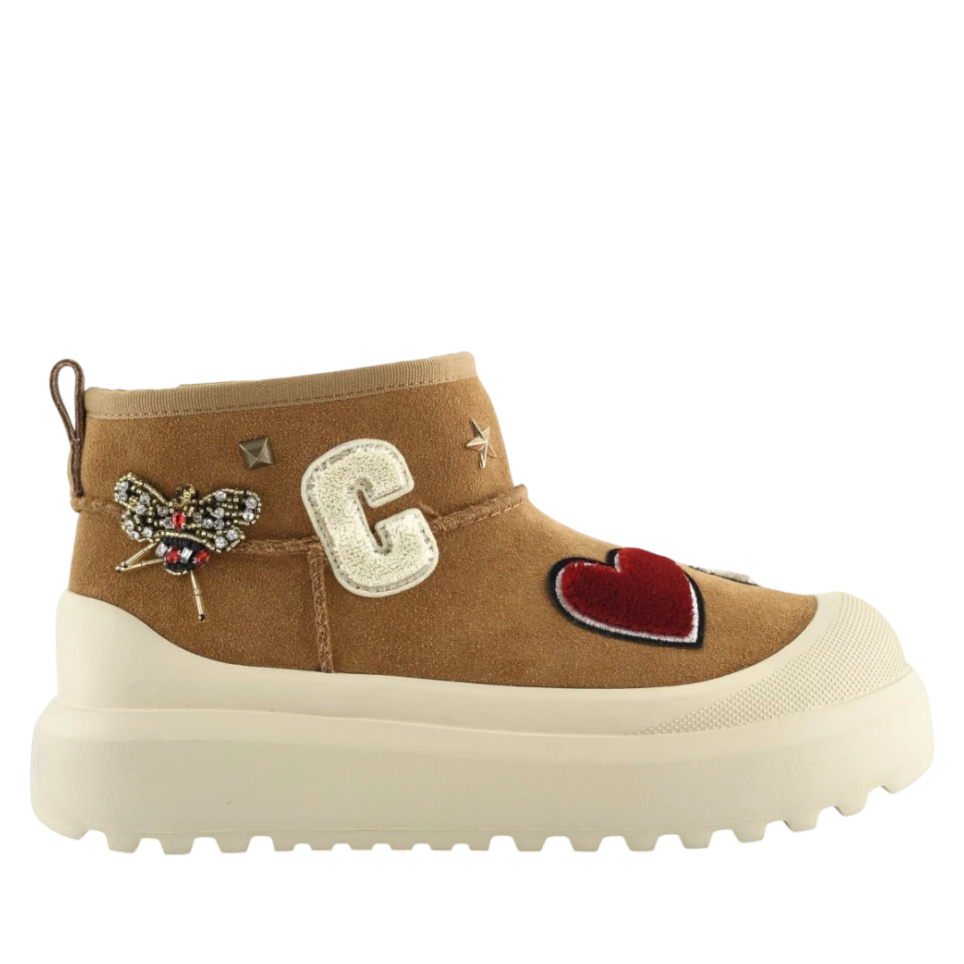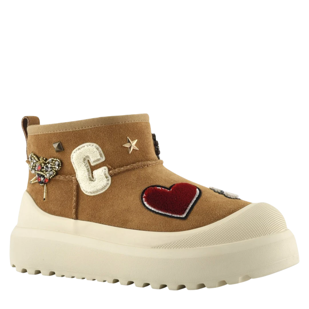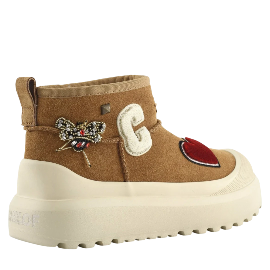 Zabavne i trendi Colors of California gležnjače u camel nijansi donose savršen spoj modnog izraza i udobnosti. Izrađene od meke brušene kože, krase ih upečatljive aplikacije – crveno srce, slovo „C“, zvjezdice i dekorativna pčela ukrašena perlicama – koje daju razigran, mladalački ton. Masivni gumeni đon u svijetloj boji osigurava stabilnost, udobnost i moderan kontrast, dok topla unutrašnjost čini ovaj model savršenim za zimske dane. Idealne za žene koje vole spoj topline, originalnosti i urbanog stila u duhu Colors of California brenda.