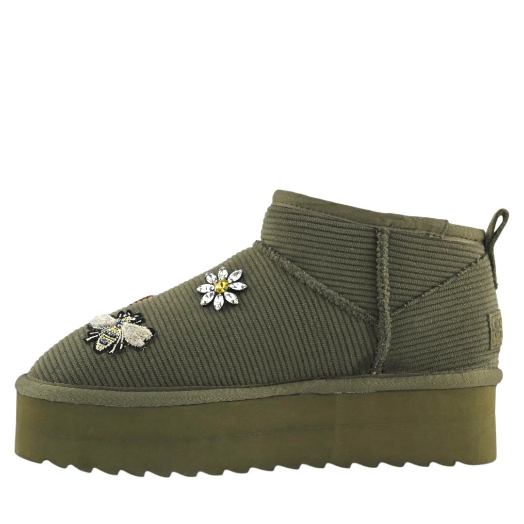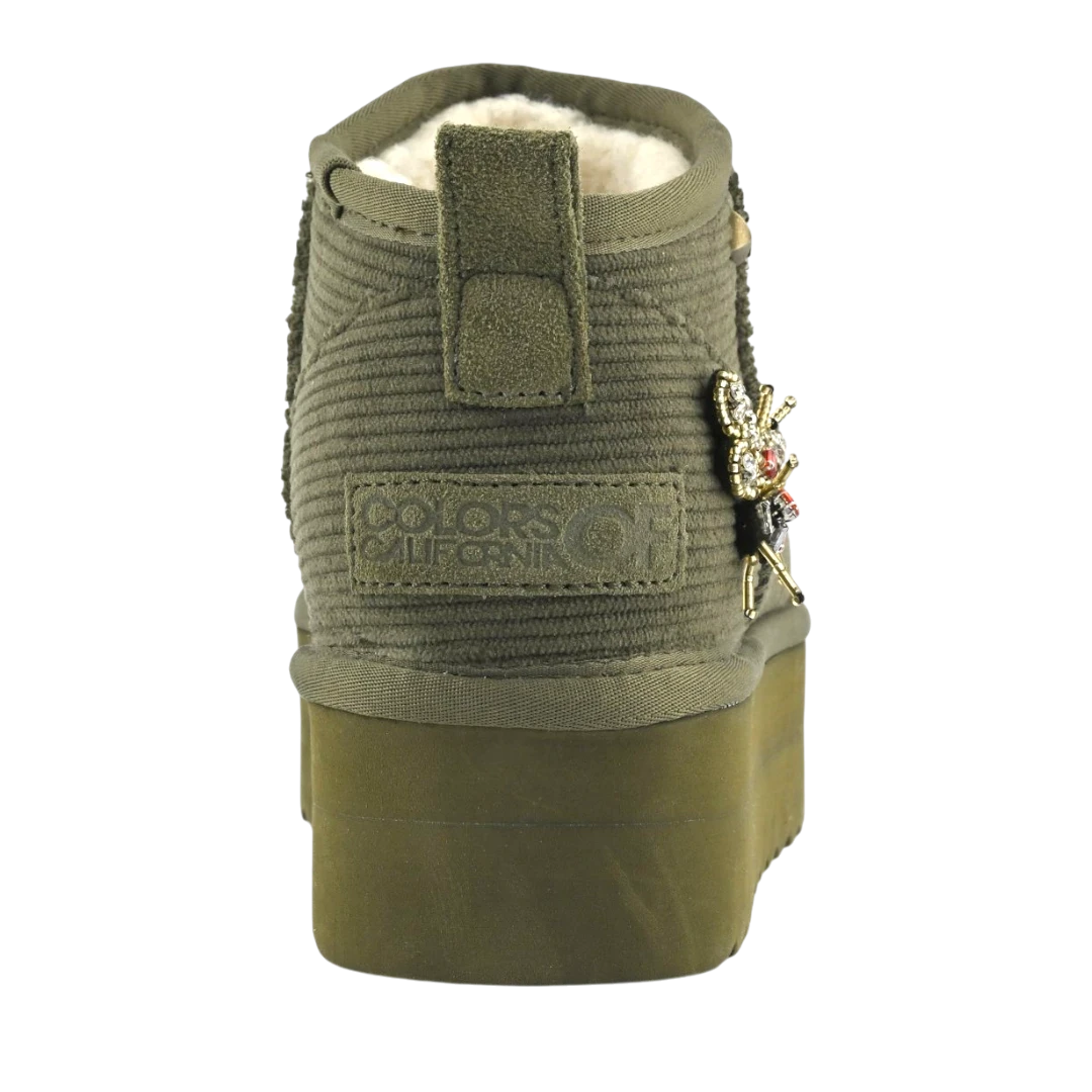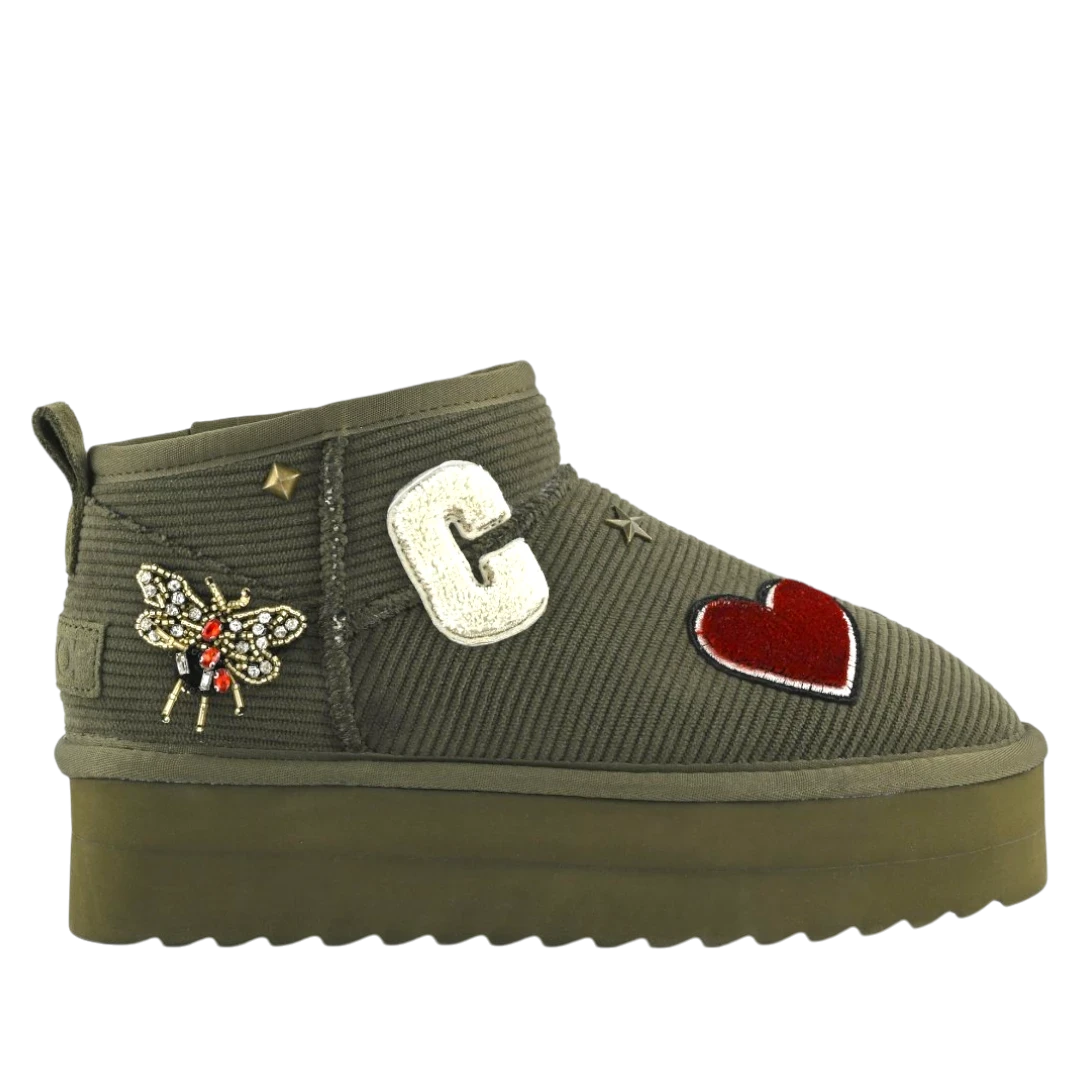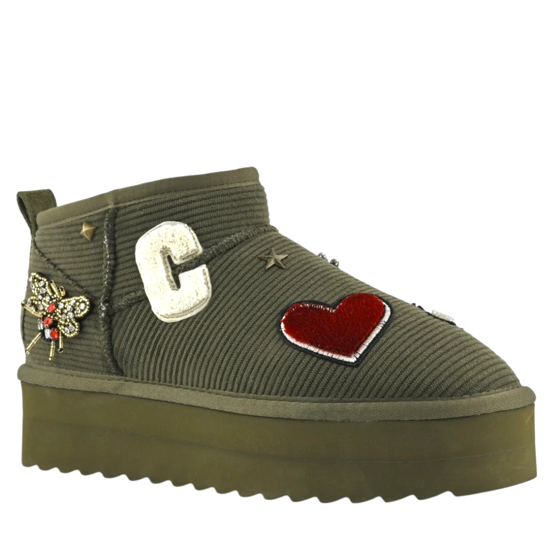 Zelene Colors of California gležnjače donose jedinstvenu kombinaciju udobnosti, topline i modnog izraza. Napravljene od mekanog rebrastog materijala, ukrašene su efektim aplikacijama – crvenim srcem, inicijalom „C“ i dekorativnom pčelom od perlica – koje unose dozu razigranosti i urbanog šarma. Povišeni gumeni đon osigurava stabilnost i lakoću kretanja, dok topla unutrašnjost pruža udobnost u hladnim danima. Ove gležnjače savršene su za žene koje žele istaknuti svoj stil kroz detalje i spojiti funkcionalnost s trendi izgledom u duhu Colors of California brenda.