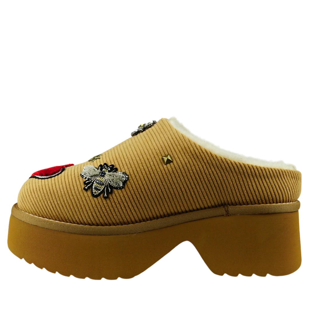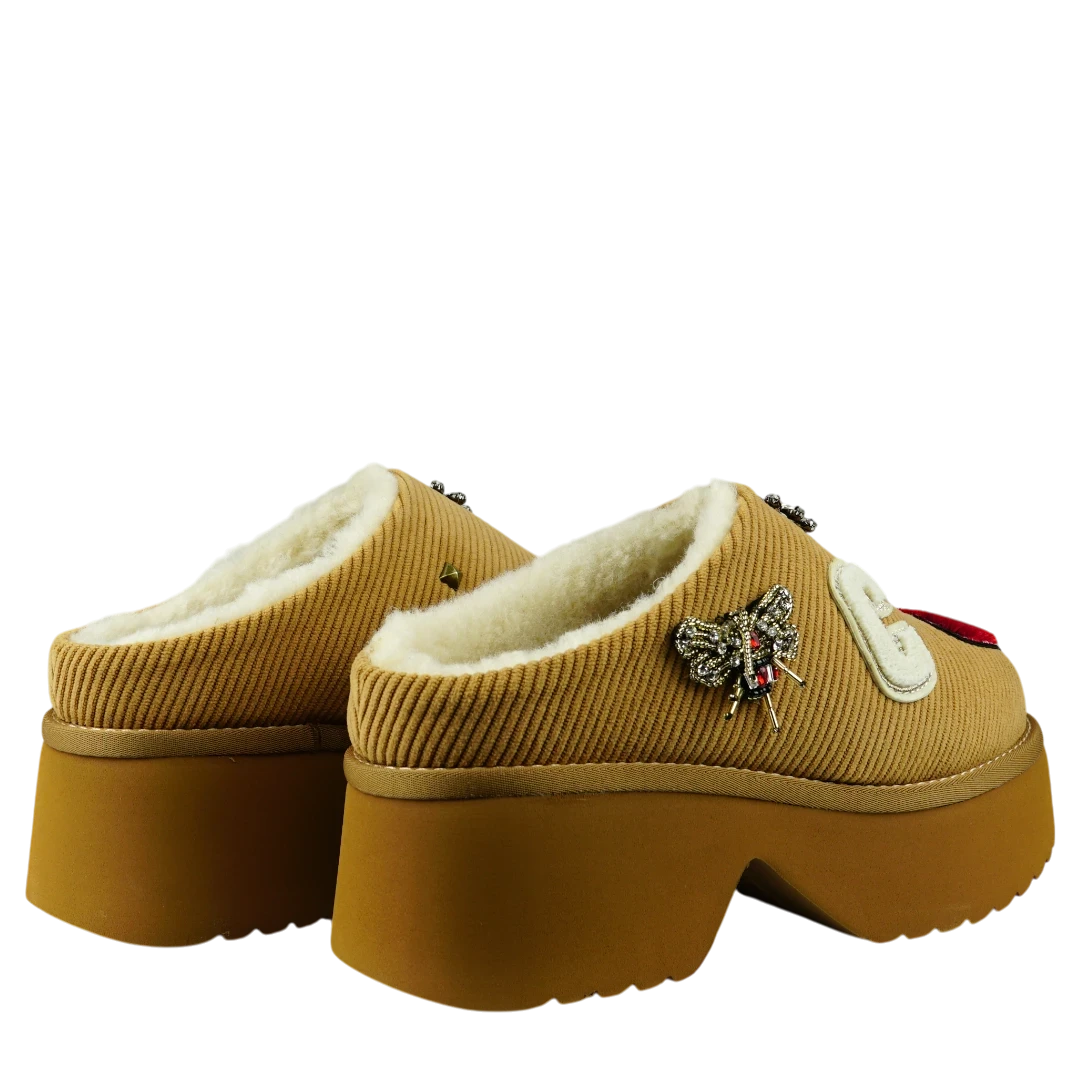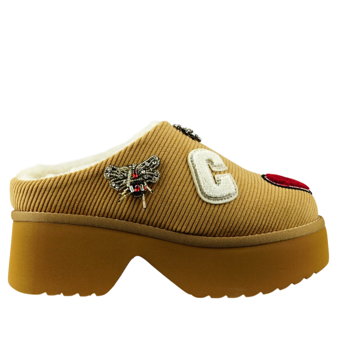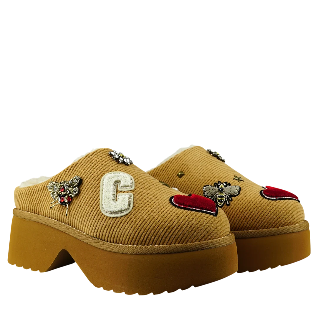Ove Colors of California papuče savršen su spoj udobnosti, topline i urbanog stila. Izrađene od mekanog materijala s teksturom rebrastog somota, ukrašene su prepoznatljivim detaljima – srce, slovo C i ručno rađena pčela s kristalima daju im razigran i prepoznatljiv karakter brenda. Unutrašnjost je obložena mekanim krznom koje pruža osjećaj topline i udobnosti, dok stabilna platforma i masivni đon nude sigurnost i moderan izgled. Idealne za one koji žele da i kod kuće ili u ležernim zimskim kombinacijama zadrže svoj stilski pečat.