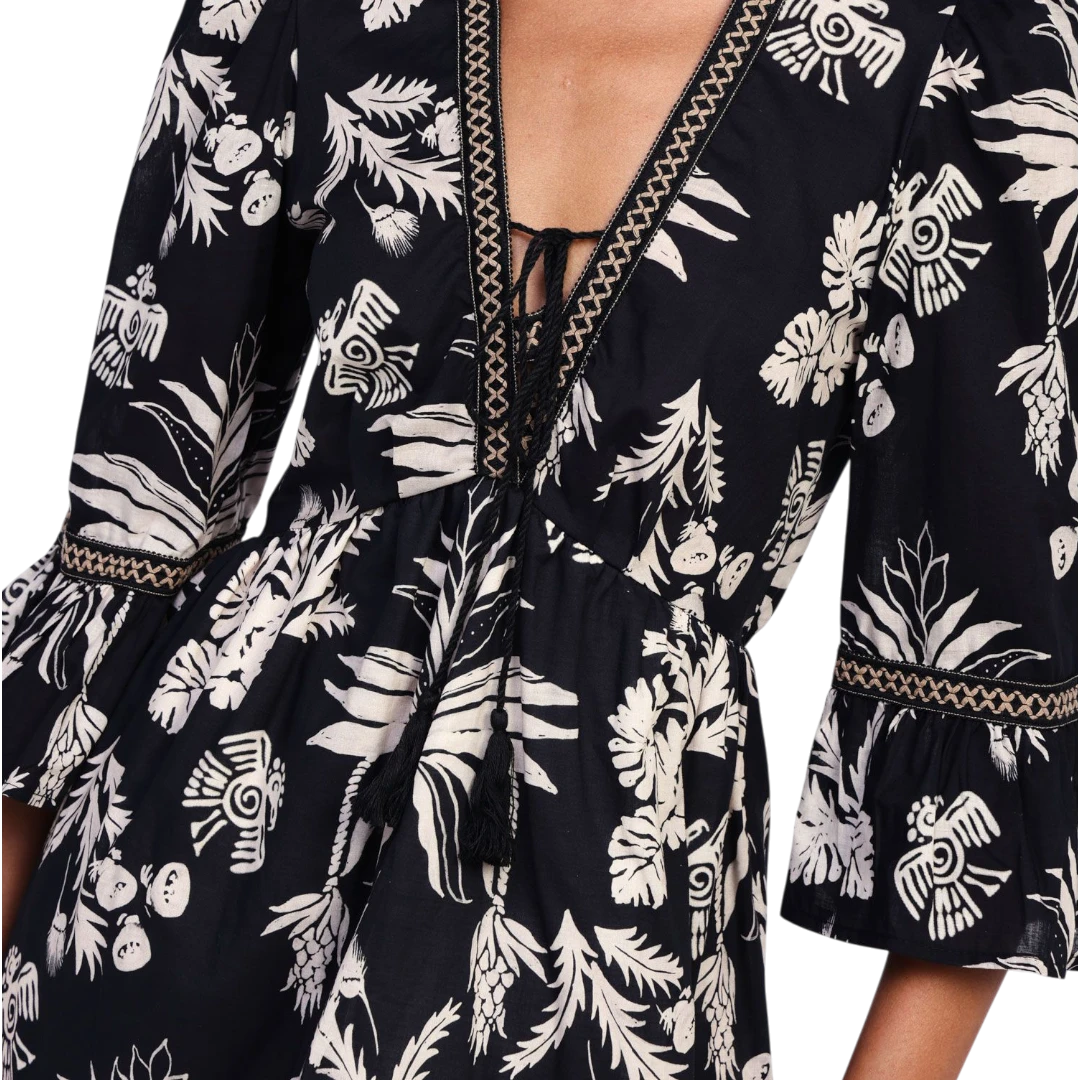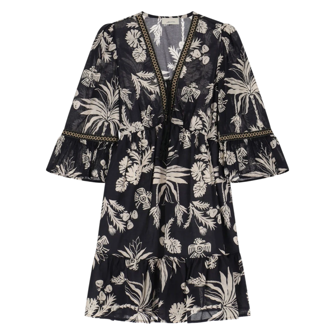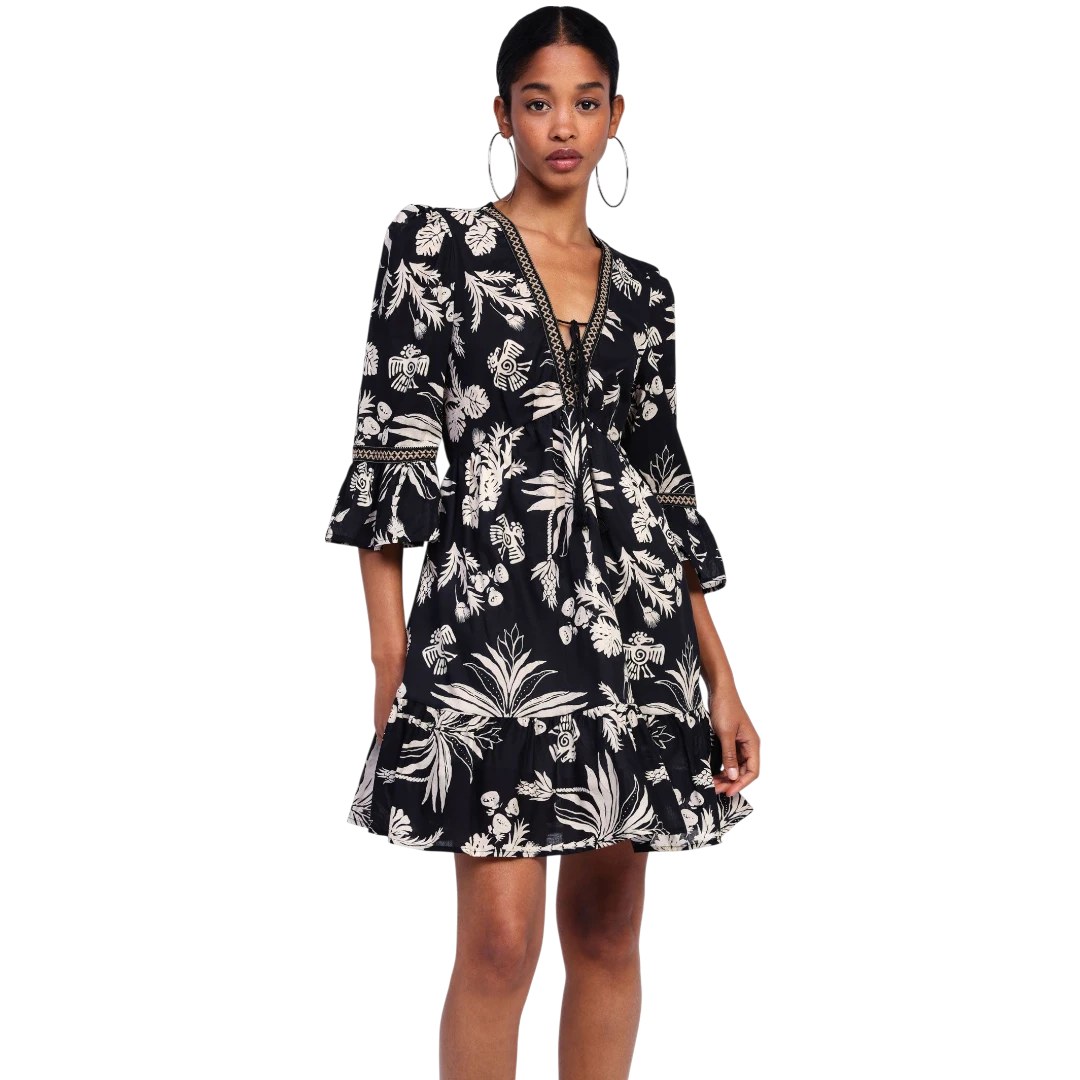 Ova kratka haljina s cvjetnim printom unosi dašak ličnog stila u svakodnevne kombinacije. V-izrez i ¾ rukavi doprinose lepršavoj i udobnoj silueti, idealnoj za opuštene, ali dotjerane prilike. Dizajn bez kopčanja omogućava lako oblačenje, dok se zahvaljujući jednostavnoj formi lako kombinuje s različitim modnim dodacima – za stil koji govori o vama.