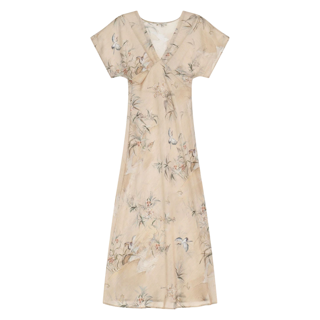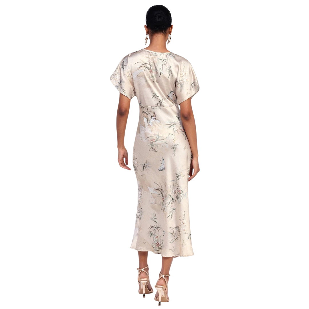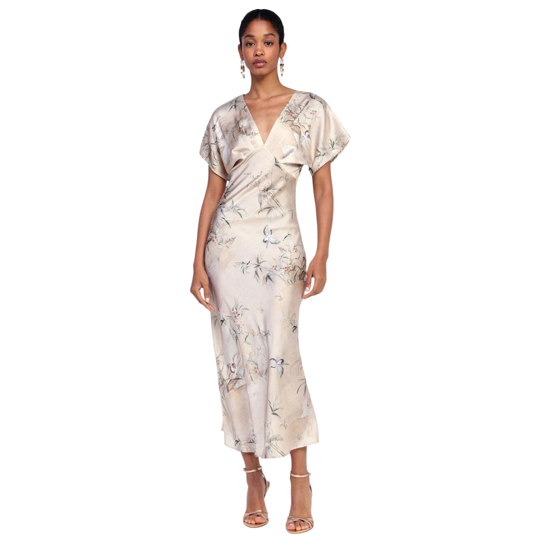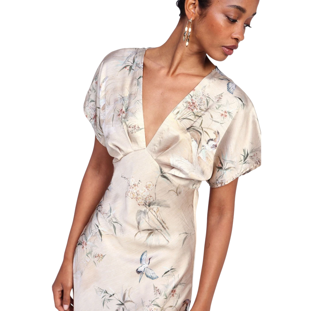Ova haljina srednje dužine očarava svakodnevnim stilom i nježnim printom inspirisanim cvjetnim motivima. V-izrez i kratki rukavi dodaju suptilnu notu ženstvenosti, dok lagani kroj pruža udobnost kroz cijeli dan. Idealna za žene koje žele spojiti eleganciju i originalnost u svakodnevnim kombinacijama – bez kompromisa.