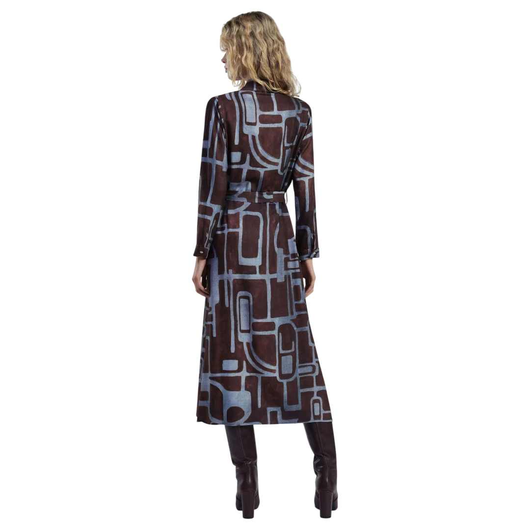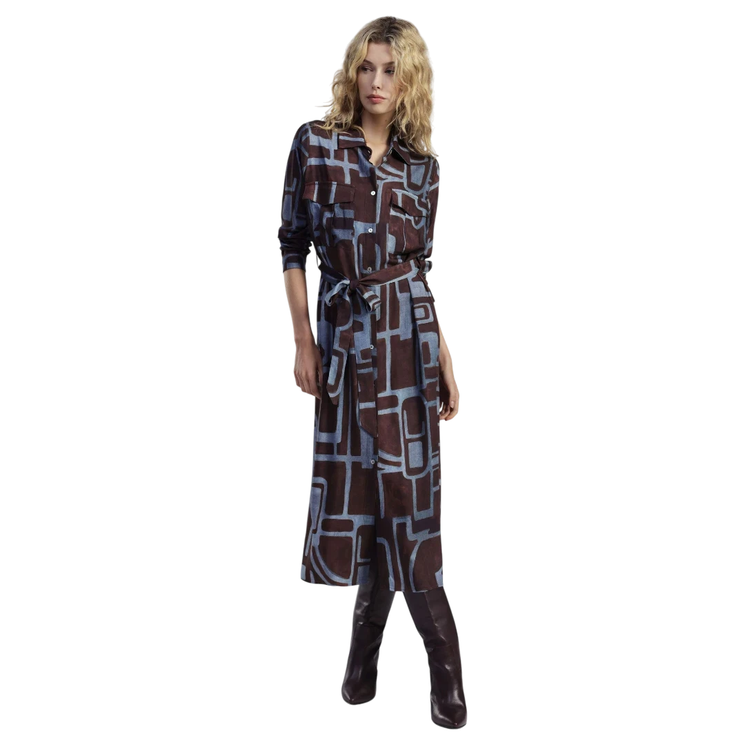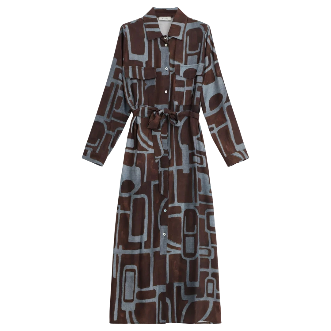 Ova Dixie košulja-haljina donosi savršen spoj sofisticiranog kroja i modernog printa. Izrađena od laganog i glatkog materijala, odlikuje se geometrijskim uzorkom u tonovima smeđe i plave, koji stvara upečatljiv, ali profinjen izgled. Model ima klasičan kragnu, dugmad duž cijele dužine i remenić koji naglašava struk, pružajući mogućnost prilagođavanja siluete. Dugi rukavi s manžetnama dodaju strukturu i eleganciju, čineći je idealnim izborom za dnevne i poslovne kombinacije. Nosiva tokom cijele sezone, ova haljina lako prelazi iz casual u elegantan izgled, jednostavnim odabirom obuće i modnih dodataka.