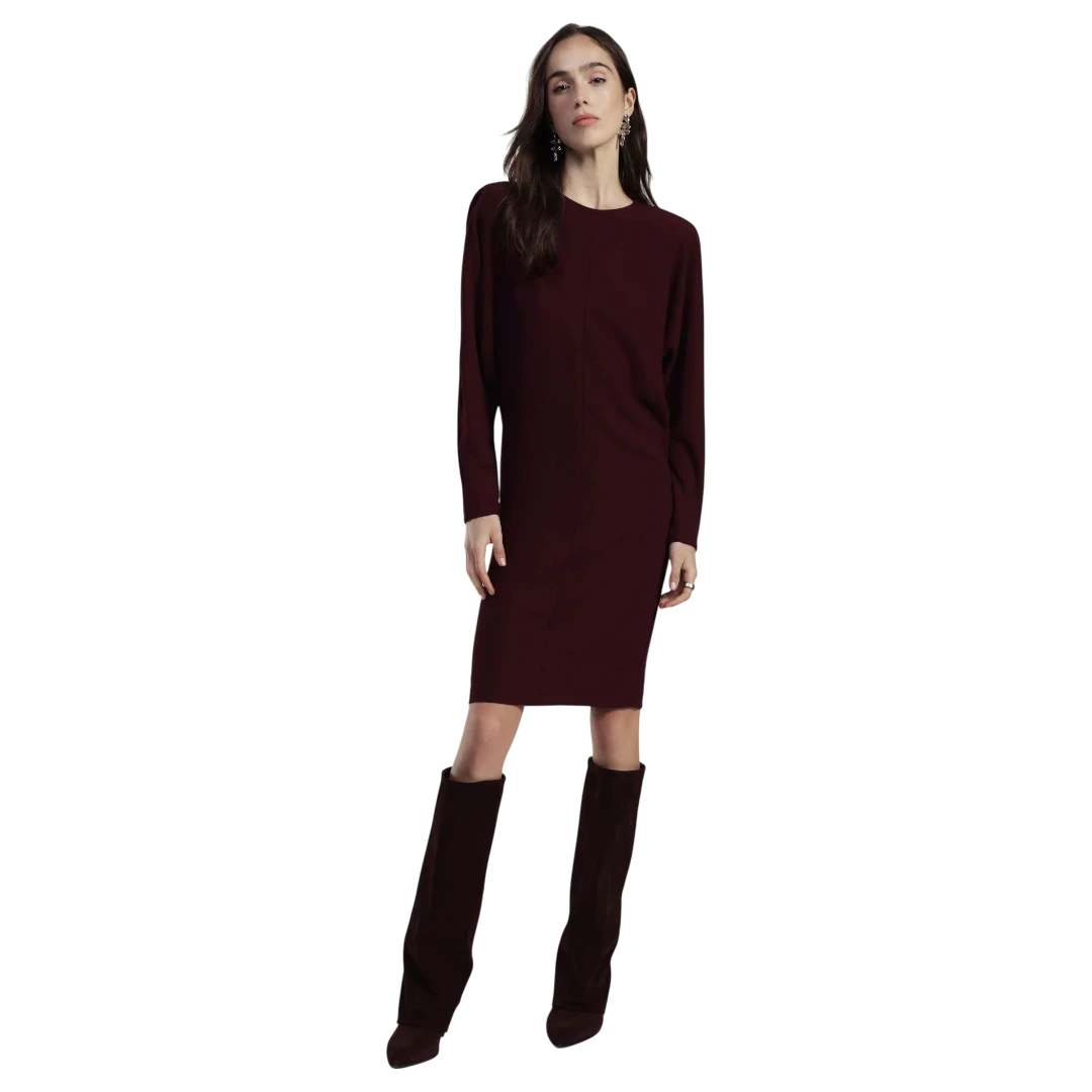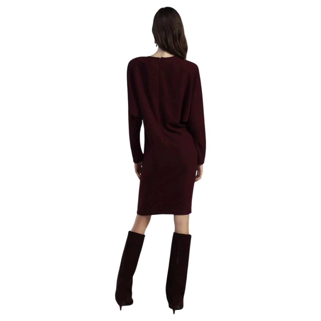 Ova Dixie haljina u dubokoj bordo nijansi odiše minimalističkom elegancijom i sofisticiranim stilom. Izrađena od mekane, strukturirane tkanine, pruža savršeno pristajanje uz siluetu, dok čiste linije i jednostavan kroj naglašavaju bezvremenski karakter modela. Dugi rukavi i diskretan okrugli izrez čine je idealnim izborom za elegantne dnevne ili večernje prilike. Zatvaranje na skriveni patent na leđima dodaje notu profinjenosti i jednostavnosti. Savršena za poslovne kombinacije, večere ili posebne prilike – ova haljina spaja ženstvenost, udobnost i modernu eleganciju u jednom komadu.
