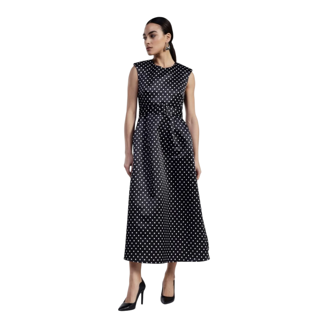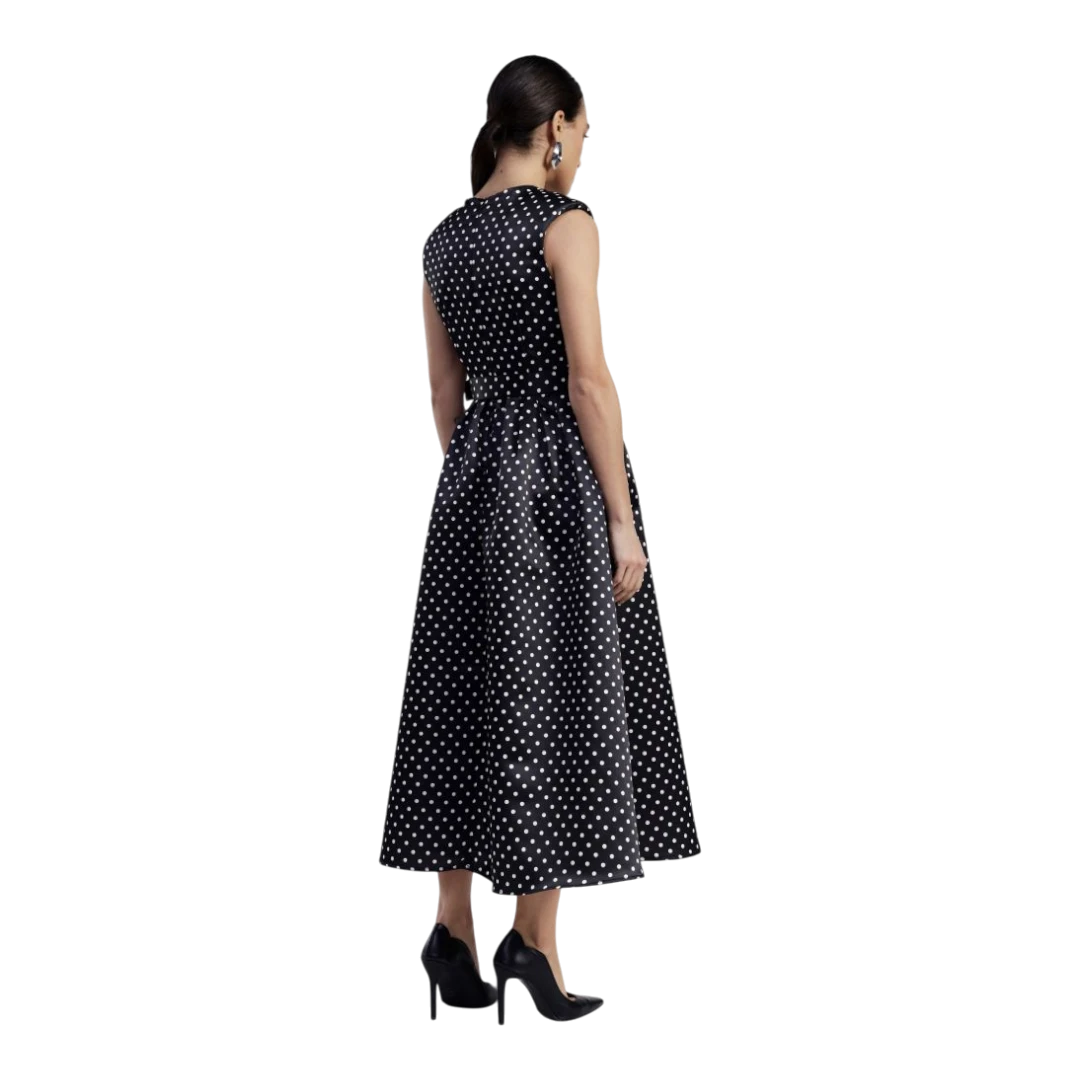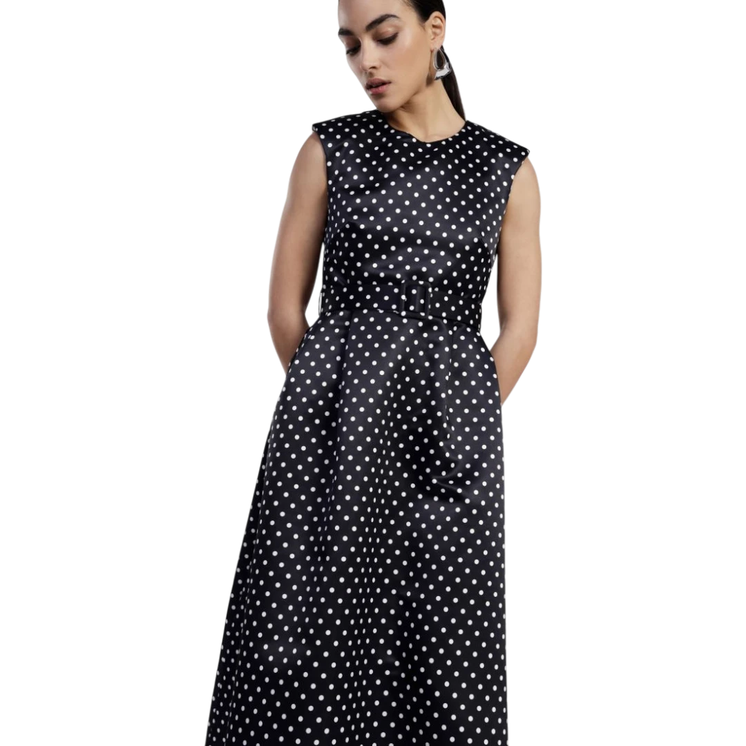 Duga haljina s efektom polka točkica kombinira klasičan uzorak s modernim krojem za ženstven i profinjen izgled. Remen u struku naglašava siluetu i stvara laskavu figuru, dok elegantni zatvarač na leđima osigurava ugodno i jednostavno oblačenje. Haljina je dizajnirana s pažnjom na udobnost i detalje, čineći je idealnim izborom za sve prilike – od dnevnih kombinacija do večernjih izlazaka. Lagana tkanina i lijep pad materijala doprinose fluidnom i sofisticiranom stilu, zahvaljujući kojem se lako kombinira s različitim modnim elementima u tvojoj garderobi. Uvijek moderan uzorak točkica dodaje dozu šarma i ženstvenosti.