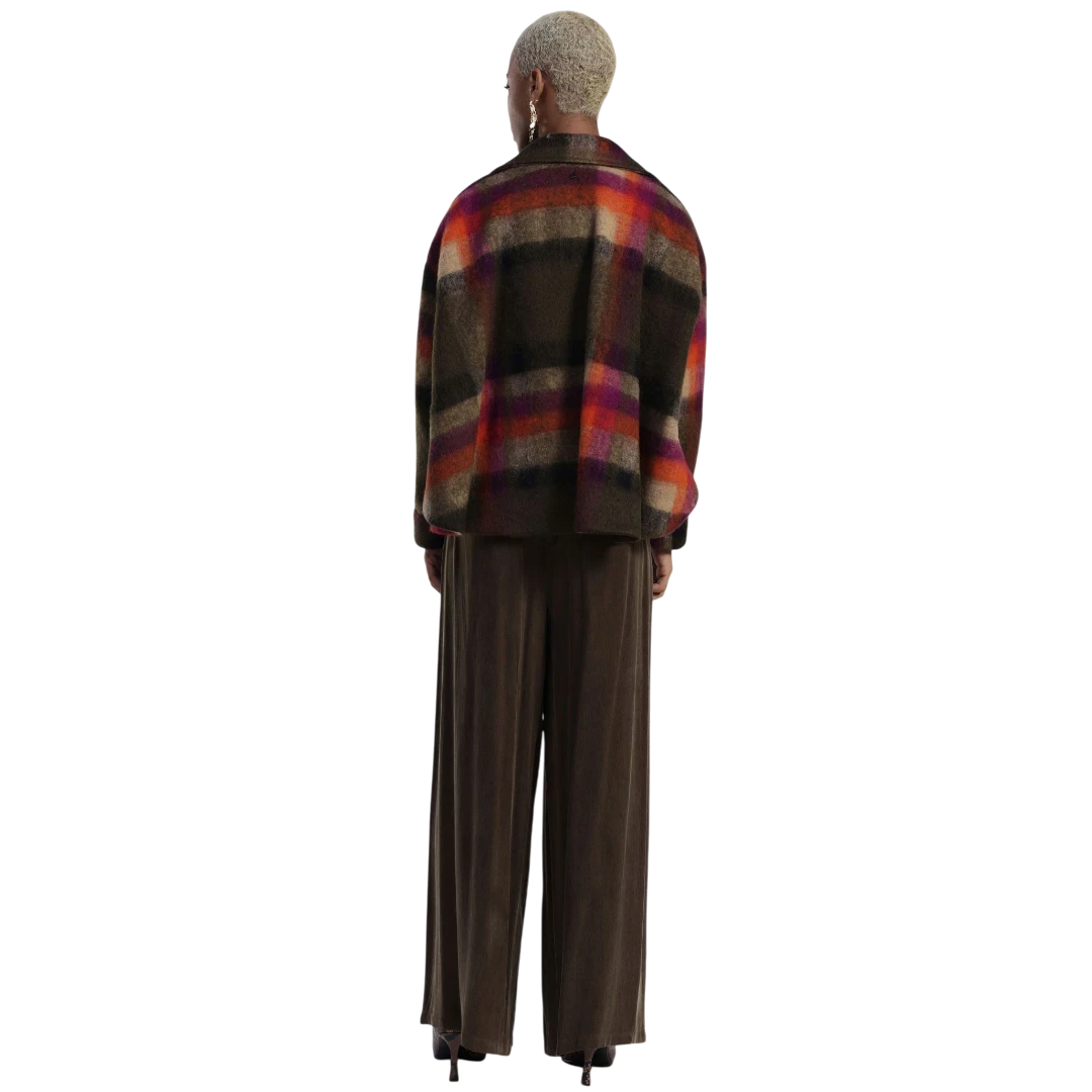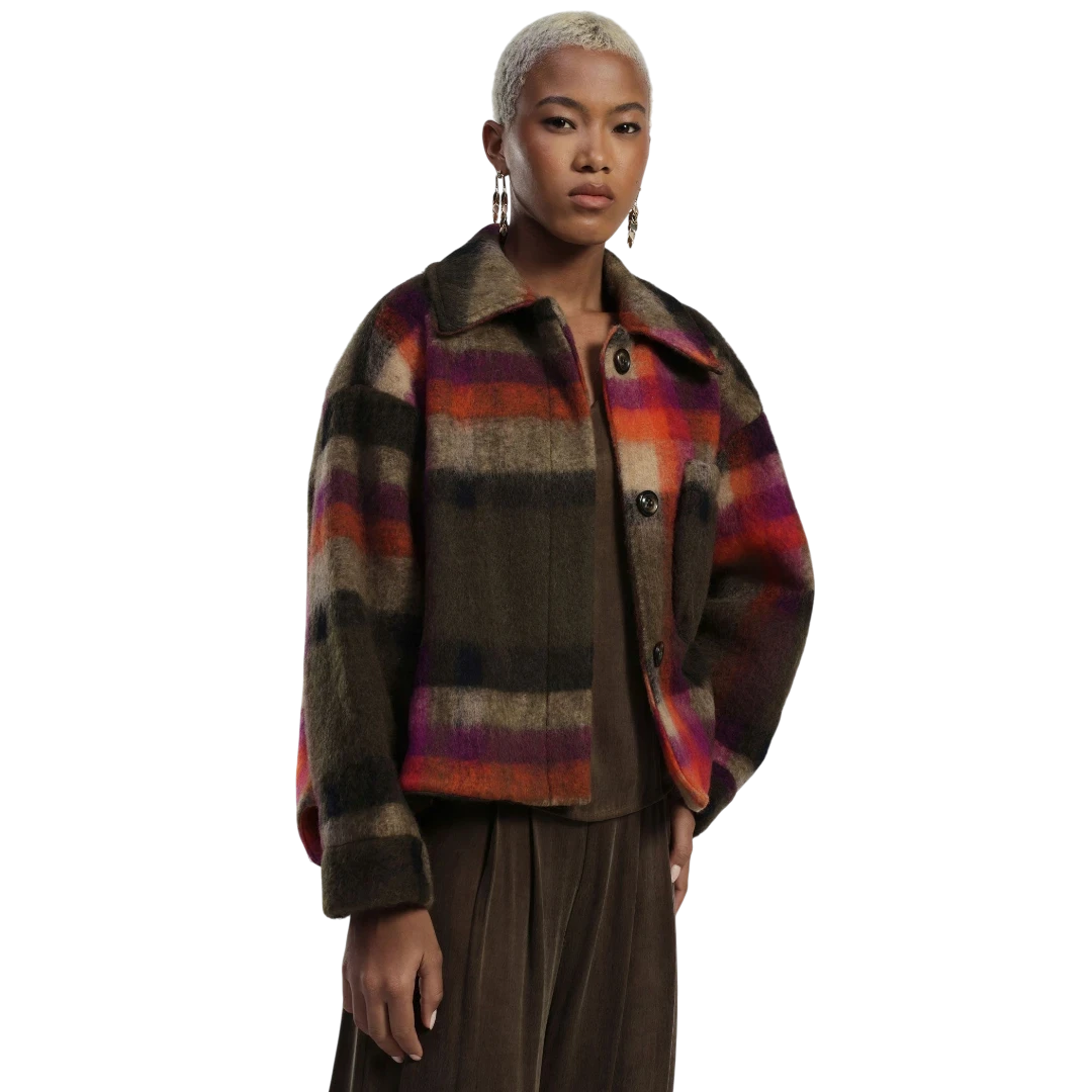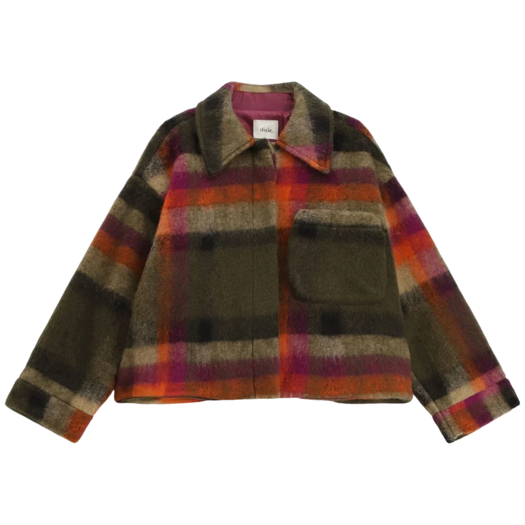 Ova Dixie karirana jakna unosi retro šarm u savremeni stil zahvaljujući živopisnoj kombinaciji boja — tonovi maslinaste, ljubičaste, narančaste i bež stvaraju efektan kontrast koji oživljava svaku zimsku kombinaciju. Izrađena od mekane tkanine s vunenim efektom, ova jakna pruža toplinu i udobnost, dok kraći, boxy kroj i izražena prednja džepna detaljnost daju modernu siluetu. Klasična kragna i skriveno kopčanje doprinose urednom, sofisticiranom izgledu. Idealna je za ležerne dnevne kombinacije uz traperice i čizme, ali i za modne avanture u urbanom stilu — savršen spoj topline, udobnosti i trendi estetike.
