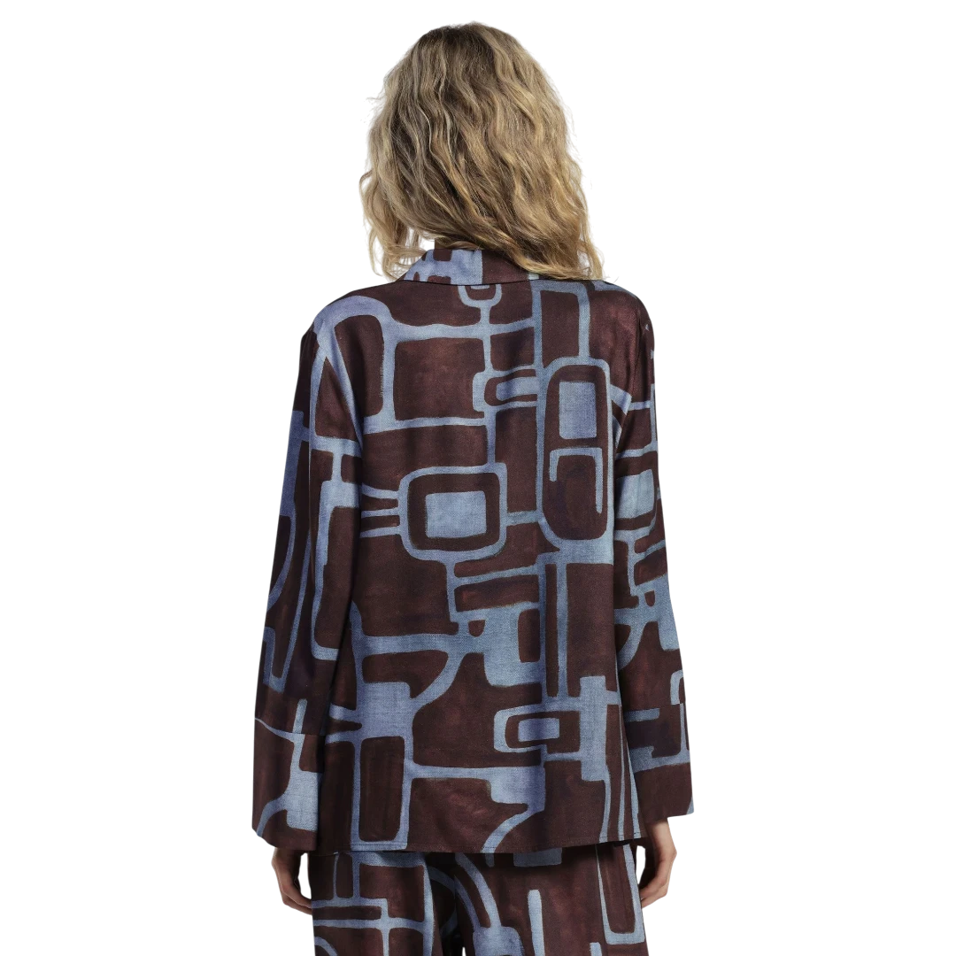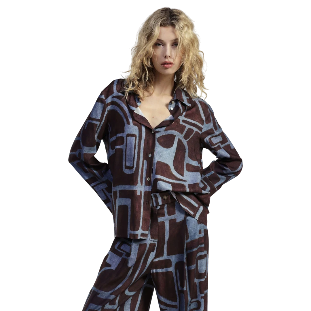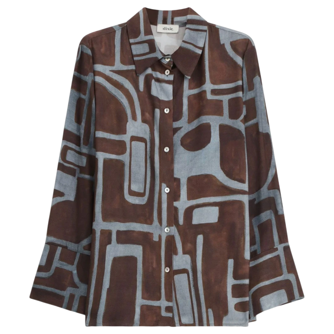 Ova Dixie košulja ističe se upečatljivim geometrijskim uzorkom u kombinaciji smeđih i plavih tonova, koji unosi modernu dinamiku u svaki outfit. Napravljena od mekane i lagane tkanine, pruža udobnost i elegantan pad materijala. Model sadrži klasičan kragnu, dugmad duž cijele prednje strane i blago širi rukav koji dodaje ležernu, ali sofisticiranu notu. Može se nositi samostalno uz elegantne pantalone ili suknju, ili u kombinaciji s odgovarajućom suknjom ili hlačama iz kolekcije za kompletan statement look. Savršen komad za žene koje vole moderne uzorke, udobnost i chic eleganciju u svakodnevnim i poslovnim kombinacijama.