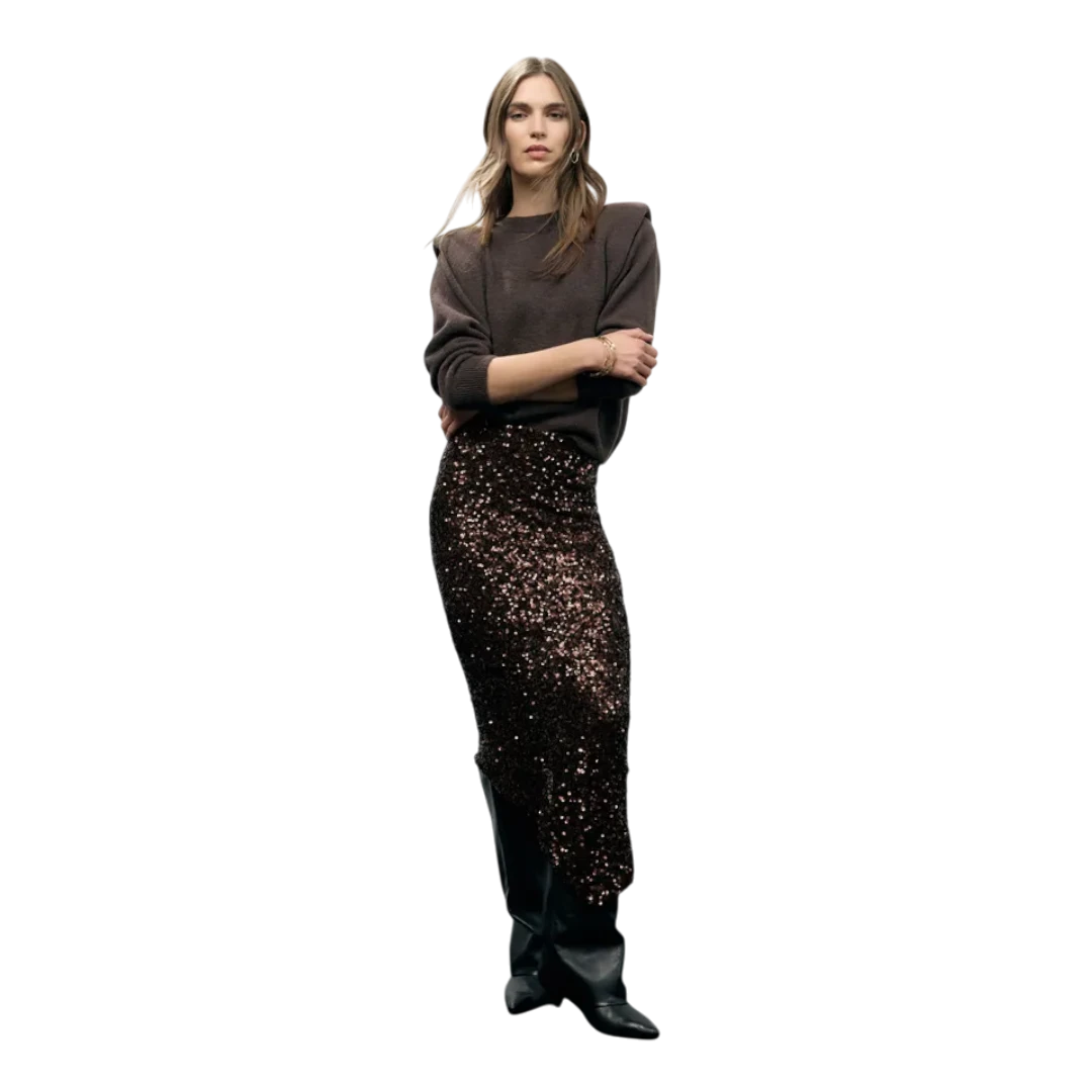 Ova ženska suknja sa paillettes ističe se asimetričnim krojem i geometrijskim rezom, koji joj daje moderan i sofisticiran izgled. Cijela površina je prekrivena sjajnim šljokicama, stvarajući upečatljiv efekat i elegantan sjaj pri svakom pokretu. Dužina je midi, sa nepravilnim završetkom koji vizuelno izdužuje siluetu i naglašava noge.
