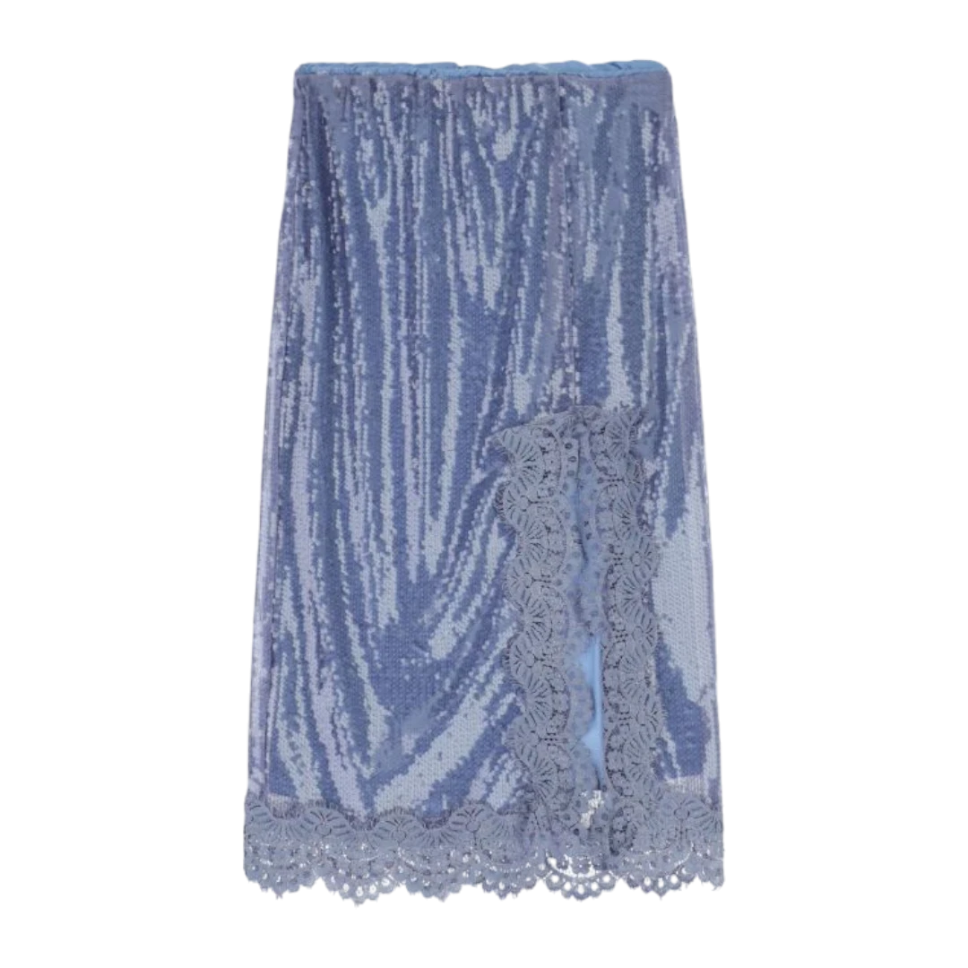 Elegantna Dixie suknja u nježnoj plavoj nijansi odiše profinjenošću i ženstvenim stilom. Izrađena je od kvalitetnog materijala s diskretnim sjajnim detaljima koji joj daju luksuzan izgled. Čipkasti detalji na rubu i uz bočni prorez dodatno naglašavaju sofisticiran dizajn i daju romantičnu notu. Kroj lijepo prati liniju tijela, čineći ovu suknju savršenim izborom za svečane prilike, večernje izlaske ili elegantne dnevne kombinacije. Lako se kombinuje uz košulje, bluze ili jednostavne majice.