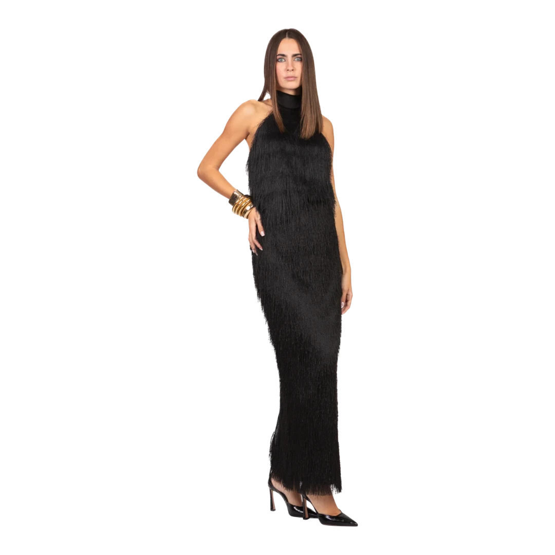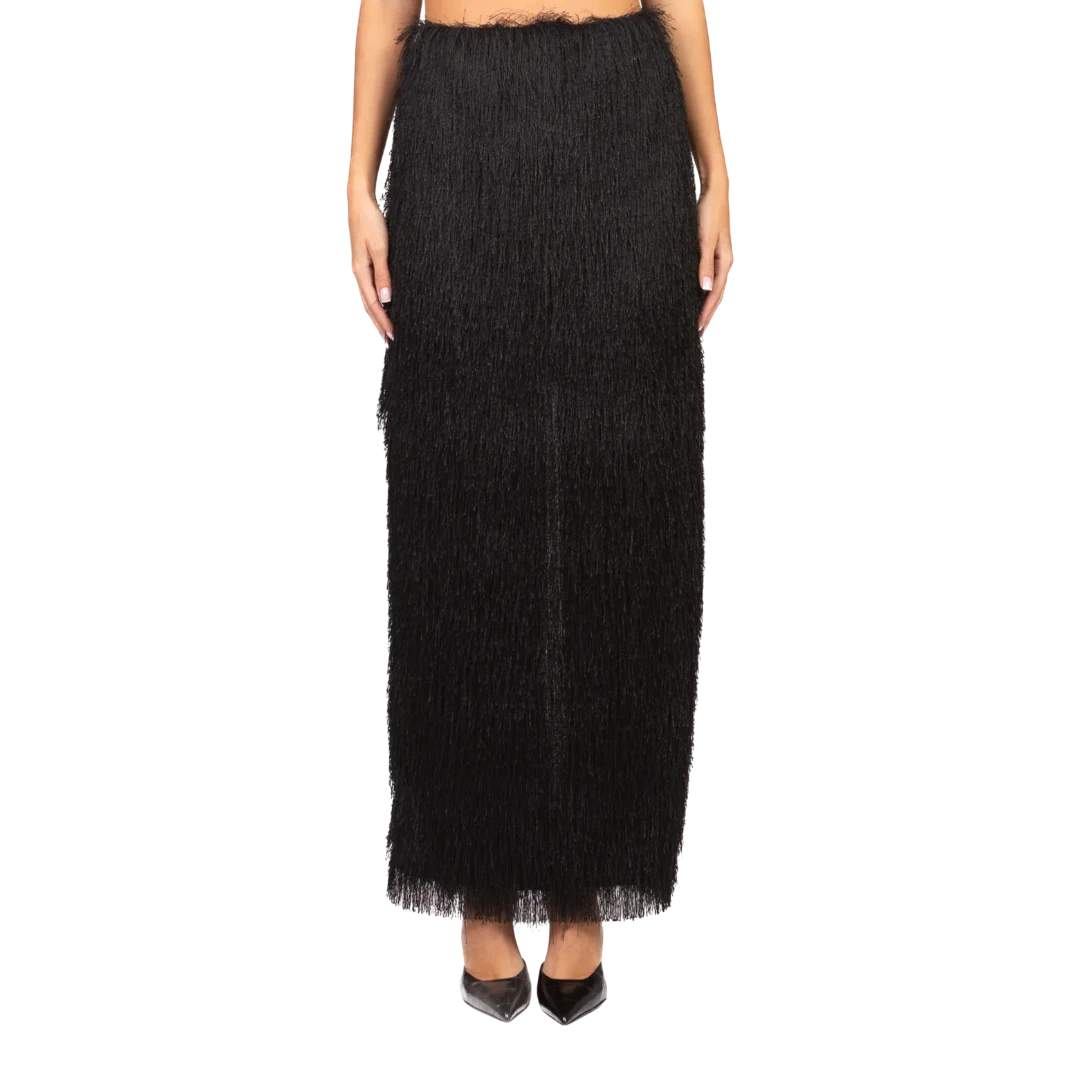 Ova suknja je duga ženska suknja sa visokim strukom i dekorativnim resicama koje vise sa donjeg dijela i daju joj dinamičan i izražajan izgled. U predjelu struka ima elastičnu traku, što omogućava udobno pristajanje bez neugodnog stezanja, a dizajn visokog struka vizualno izdužuje figuru. Uz resice, suknja ima i bočni prorez koji dodaje malo ležernosti i olakšava kretanje, pa je pogodna kako za dnevne tako i za večernje kombinacije. Ovaj model je vrlo ženstven i karakterističan, idealan je ako želiš da tvoj outfit ima upečatljiv detalj bez previše komplikovanih elemenata