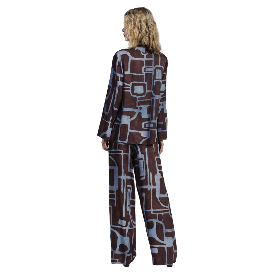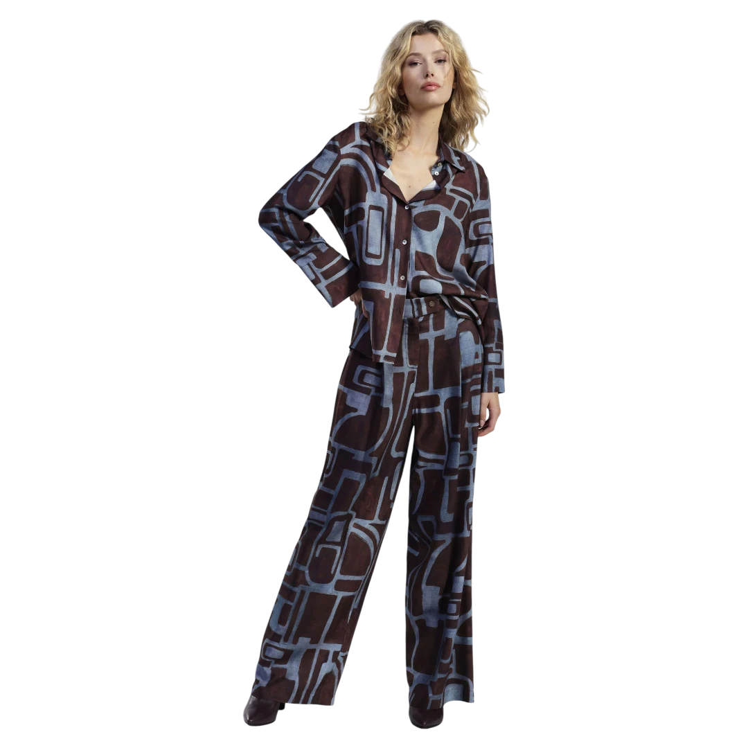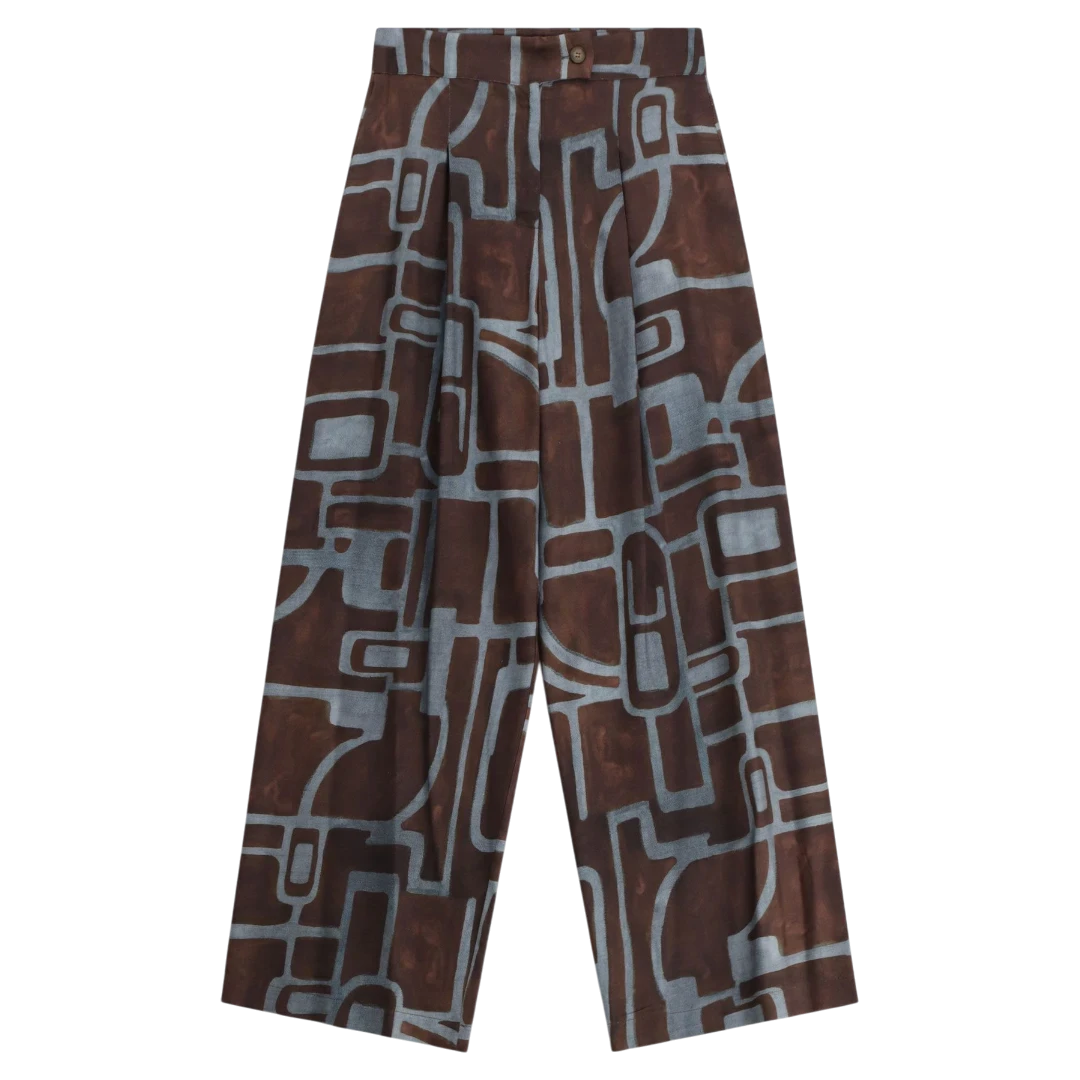 Ove Dixie široke hlače ističu se umjetničkim printom u nijansama smeđe i plave, koji donosi moderan i sofisticiran vizualni efekt. Napravljene od lagane, glatke tkanine, ove hlače nude udobnost i fluidnost u pokretu, dok visoki struk i široke nogavice stvaraju elegantnu siluetu inspirisanu retro estetikom. Kroj s blagim naborima sprijeda dodaje strukturu i eleganciju, dok klasično kopčanje na dugme i skriveni patent osiguravaju uredan završetak. Savršene su za dnevne i večernje modne kombinacije — nosite ih s odgovarajućom košuljom iz iste kolekcije za prepoznatljiv Dixie total look, ili ih kombinujte s jednostavnom bluzom i cipelama na petu za profinjen urbani stil.