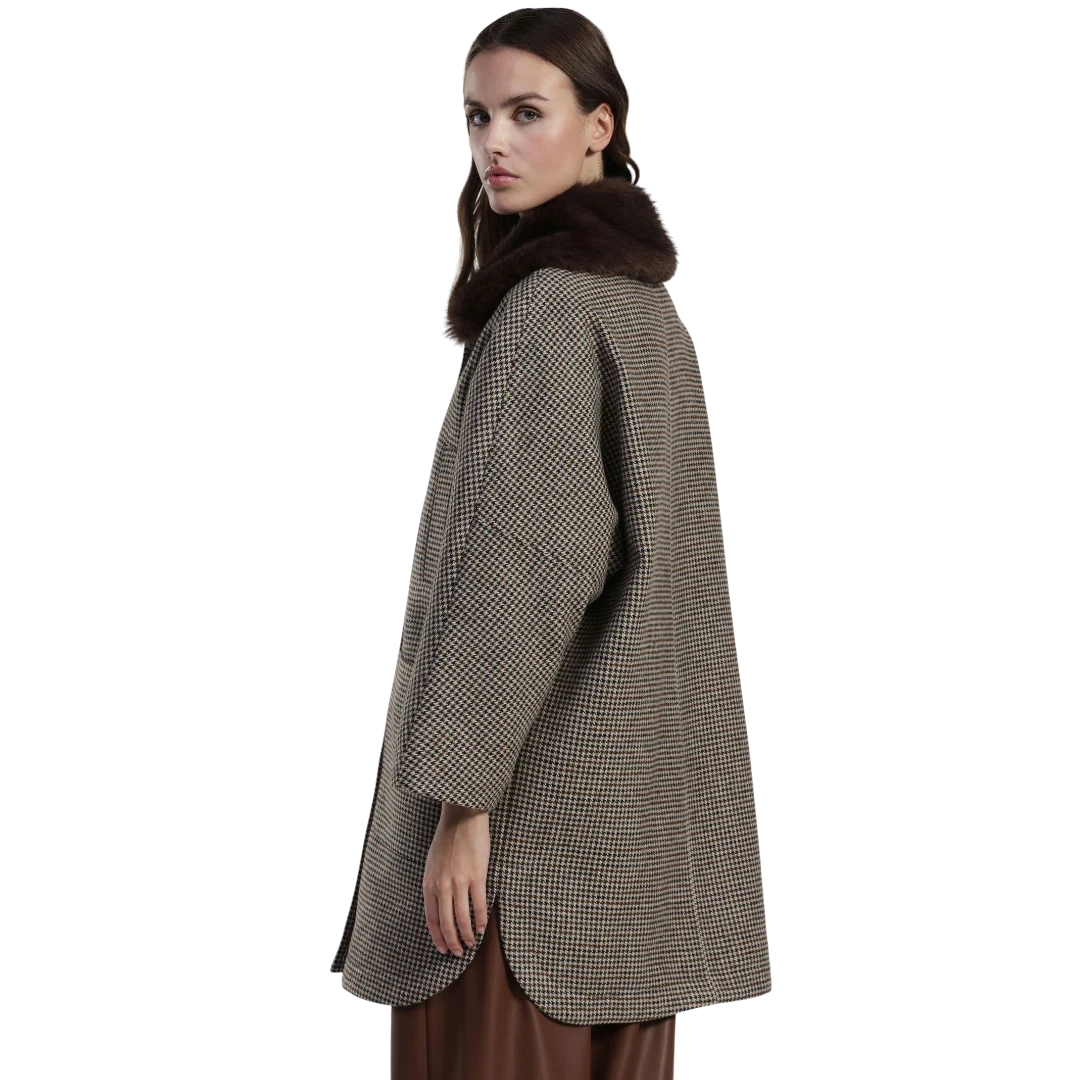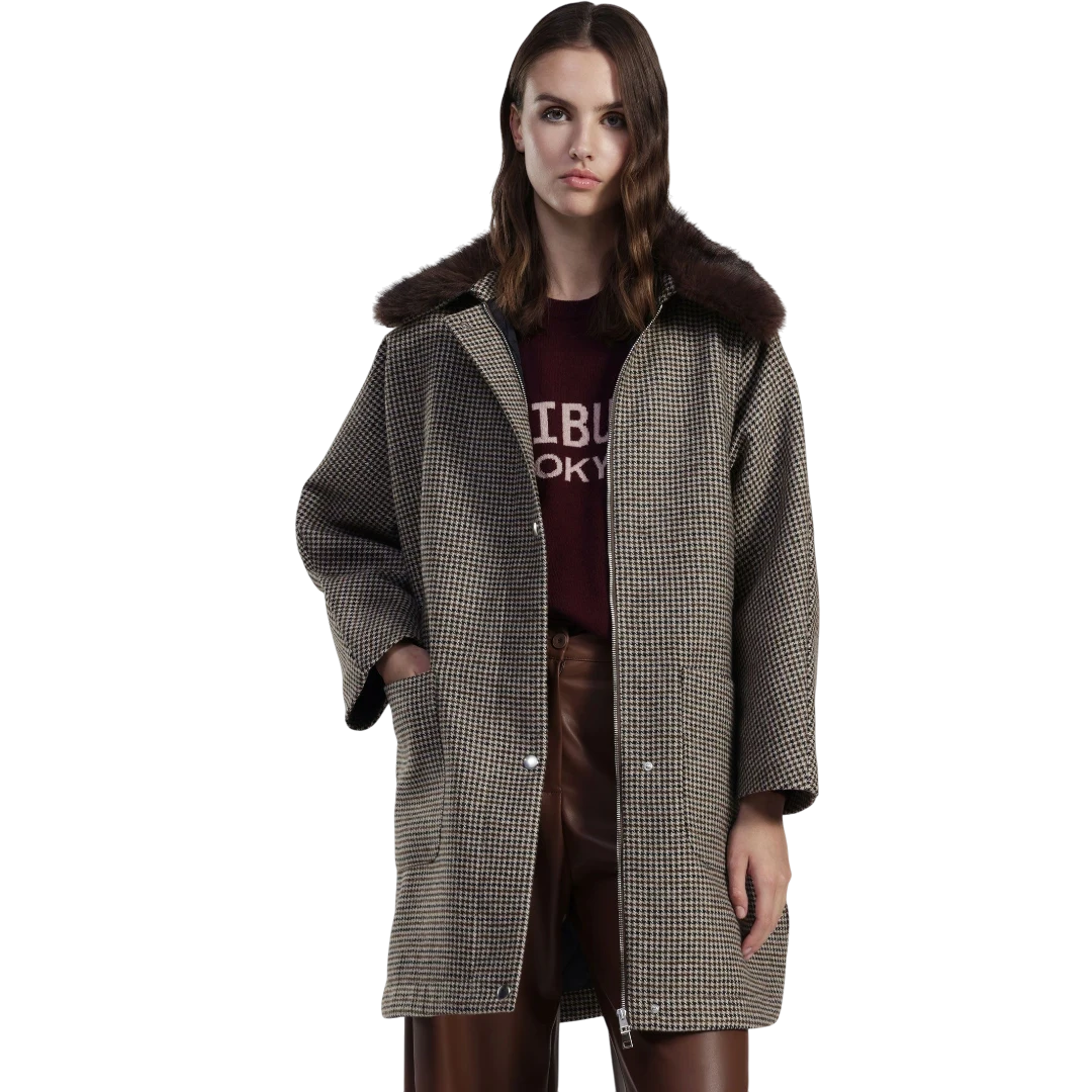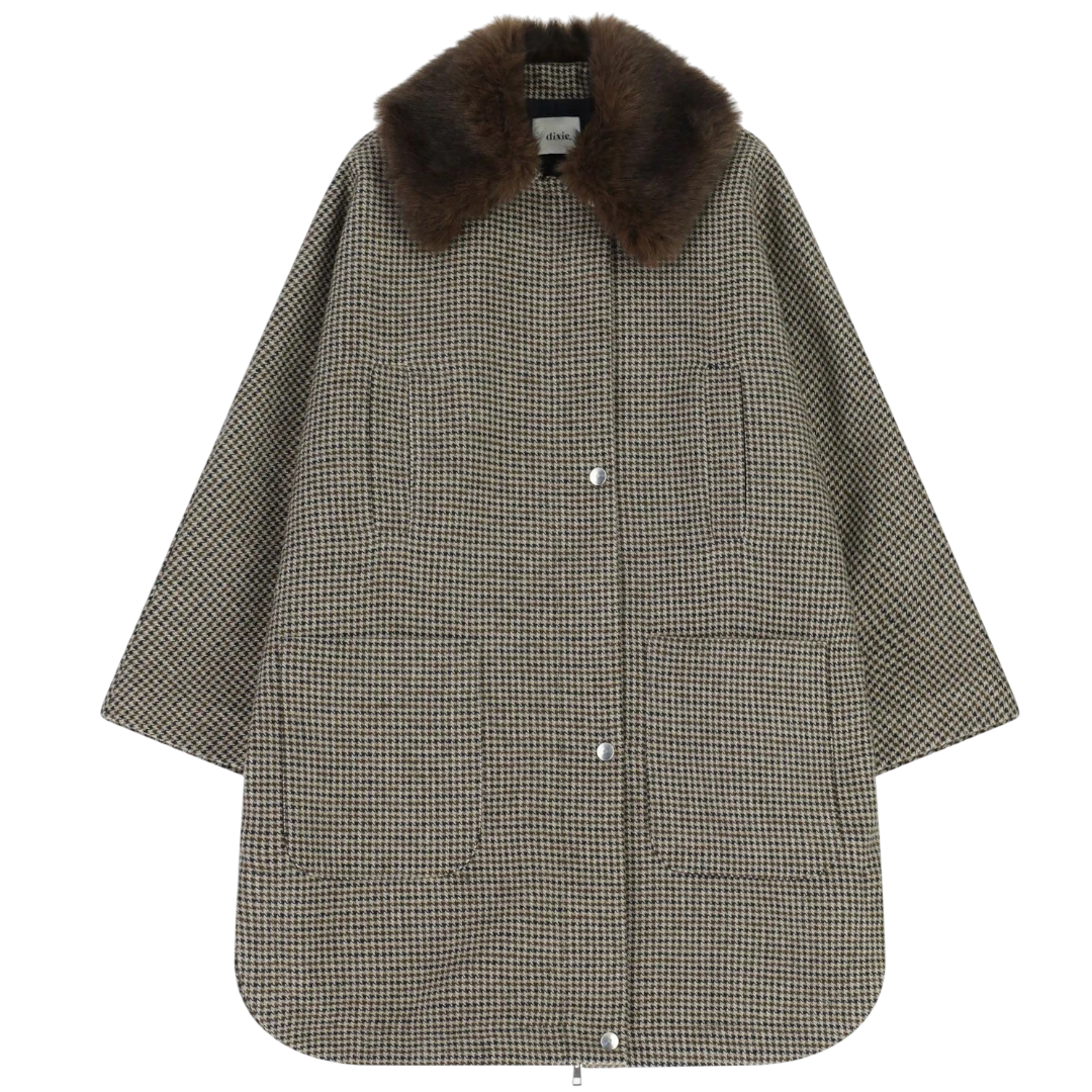 Ovaj Dixie kaput savršen je spoj klasične elegancije i moderne udobnosti. Izrađen u bezvremenskom pepita uzorku, odiše retro šarmom, dok kragna od umjetnog krzna u toploj smeđoj nijansi dodaje notu luksuza i sofisticiranosti. Prostran, oversized kroj omogućava slojevito kombiniranje i maksimalnu udobnost, dok veliki džepovi i metalni drukeri pružaju praktičnost i moderan detalj. Materijal tople, meke teksture čini ga idealnim za hladnije dane. Ovaj model savršeno se uklapa u urbane i elegantne zimske kombinacije — uz čizme, vunene haljine ili traperice i dolčevitu, donosi prepoznatljiv Dixie karakter: chic, udoban i uvijek u trendu.