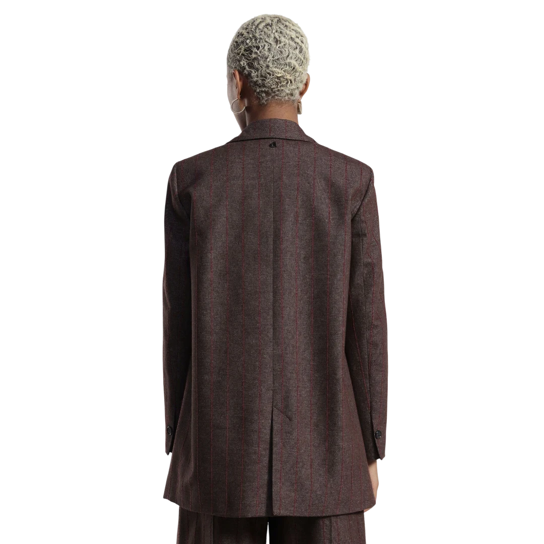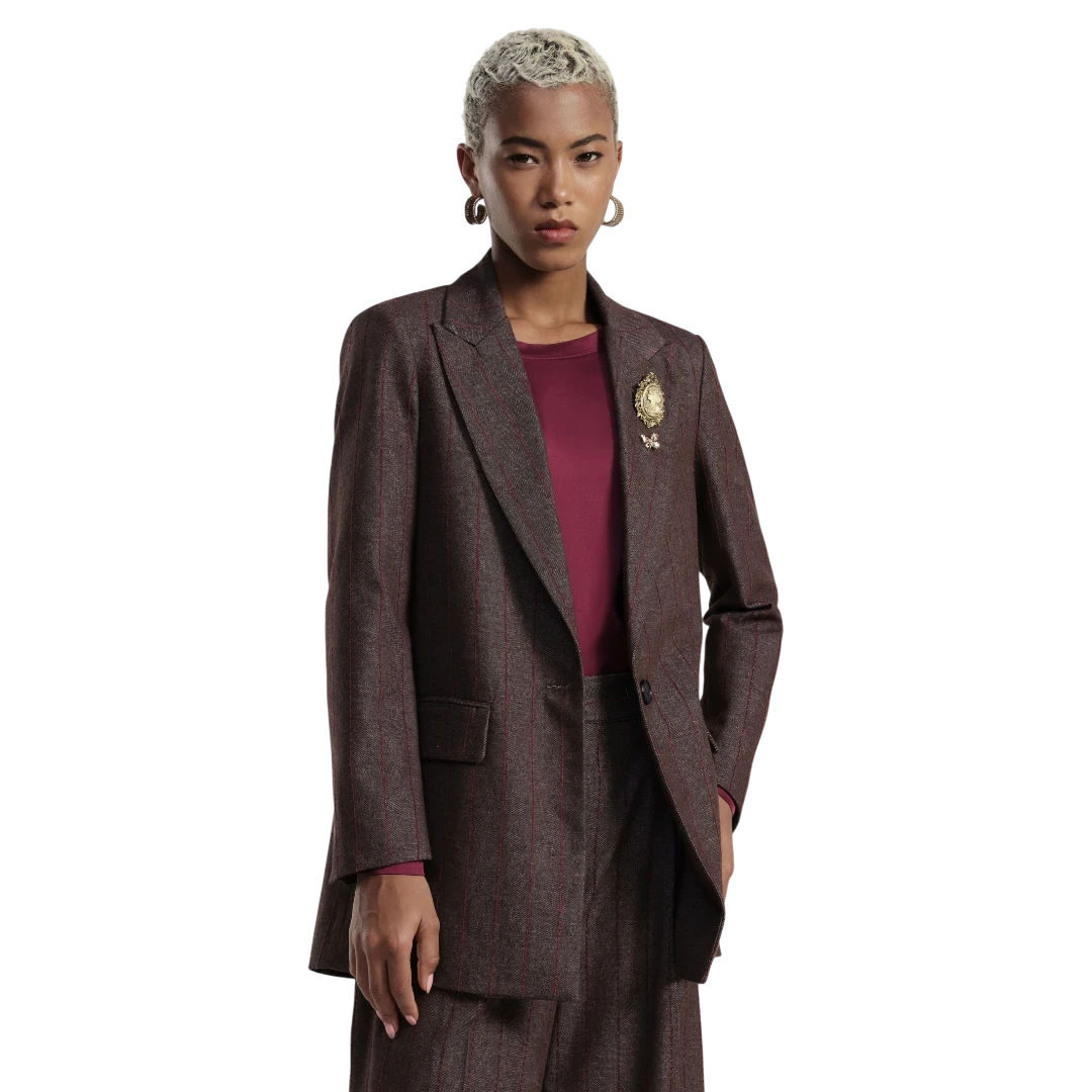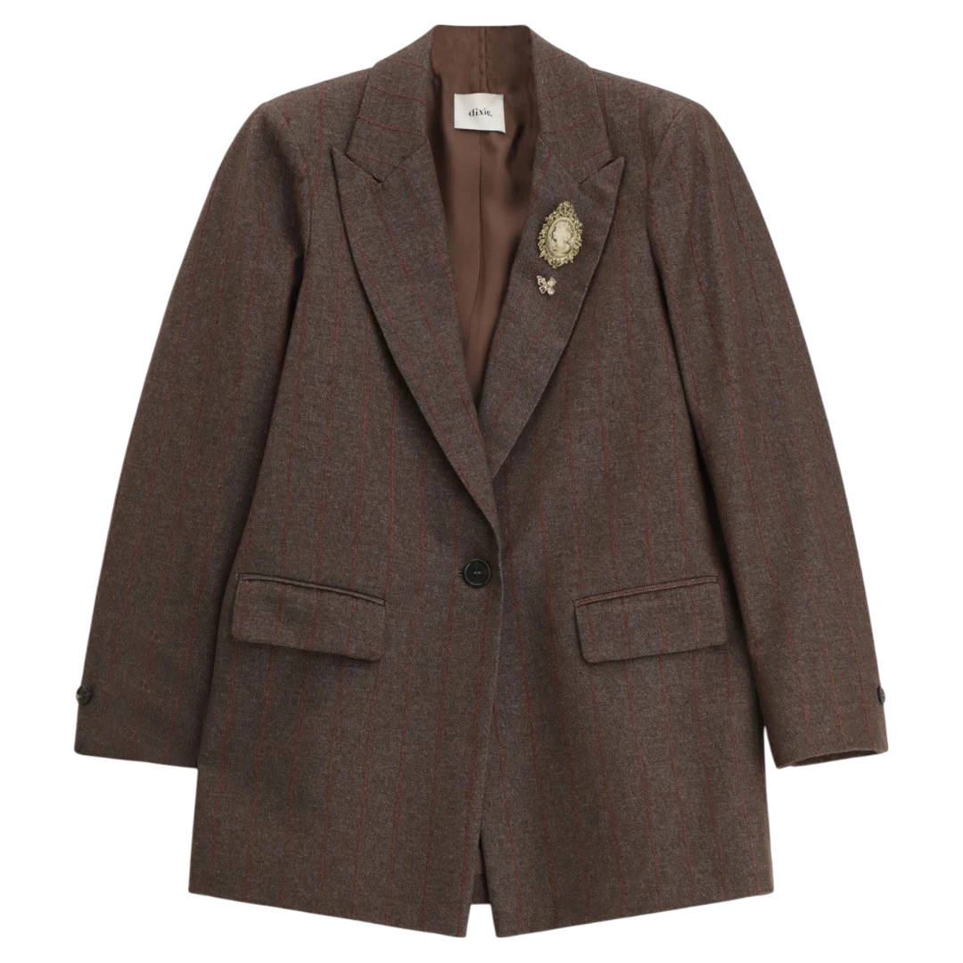 Ovaj Dixie blejzer predstavlja savršenu ravnotežu između klasične elegancije i modernog stila. Izrađen od mekane tkanine s finim prugastim uzorkom u toplim tonovima smeđe i ciglastocrvene, ovaj model odiše retro sofisticiranošću uz dašak urbanog šarma.NKroj je blago oversize, s izraženim ramenima i strukturiranim reverima koji naglašavaju siluetu, dok jedno dugme za kopčanje i ukrasna broša na reveru dodaju profinjen završetak. Praktični džepovi s preklopom i podstava u kontrastnoj nijansi čine ga udobnim i funkcionalnim za svakodnevno nošenje. Idealan je uz odgovarajuće hlače iz iste kolekcije za potpun poslovni look, ali i kao statement komad uz traperice i čizme za ležerniji, modno promišljen outfit.