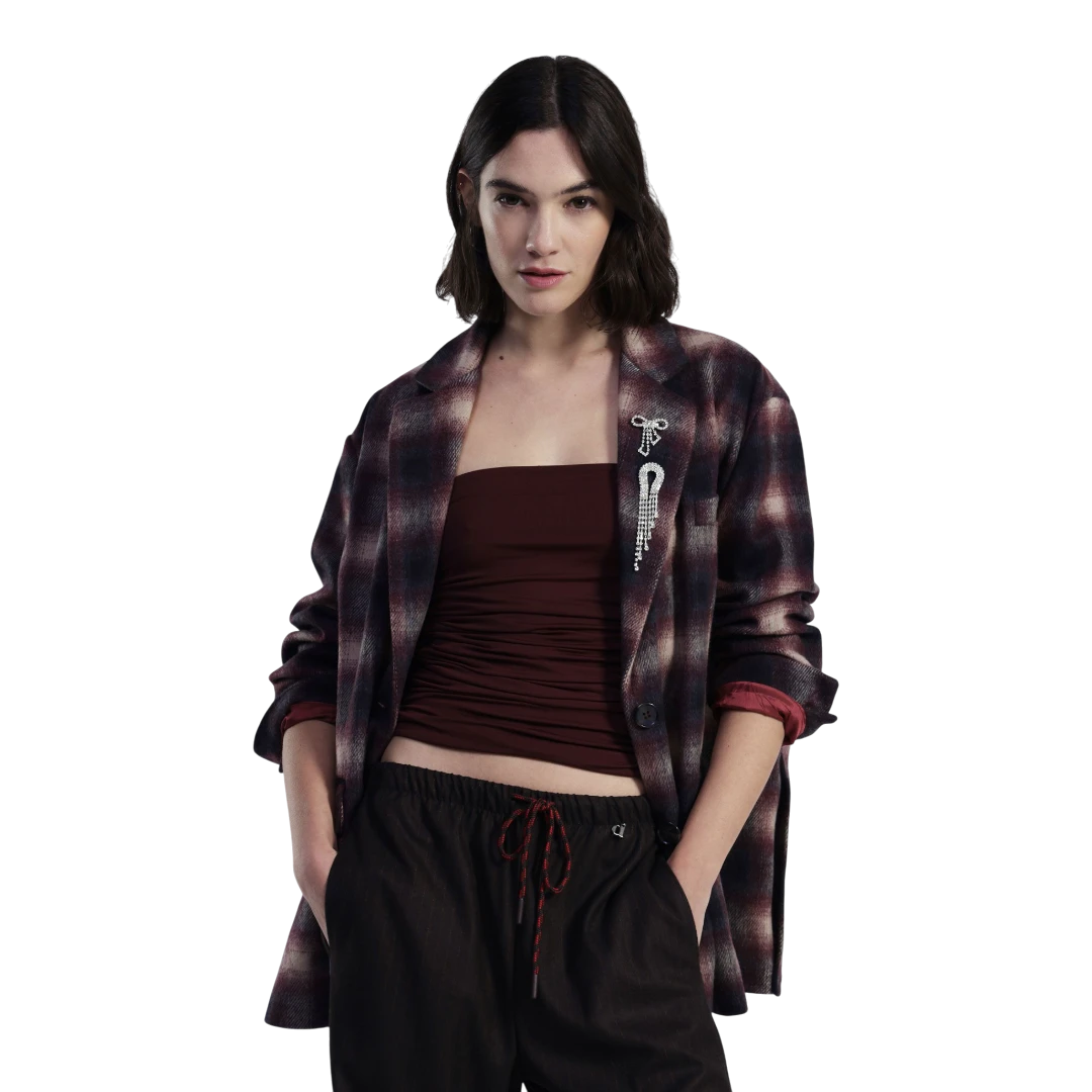 Blazer ima klasičan karirani uzorak koji daje karakter i vizuelnu dubinu odjevnom predmetu. Dekorativni broš na reveru dodaje osobni i unikatan detalj, čineći ovaj model posebnom modnom izjavom. Uključeni su funkcionalni džepovi koji povećavaju praktičnost, dok kroj daje profinjen silueta koji lijepo stoji uz različite kombinacije.