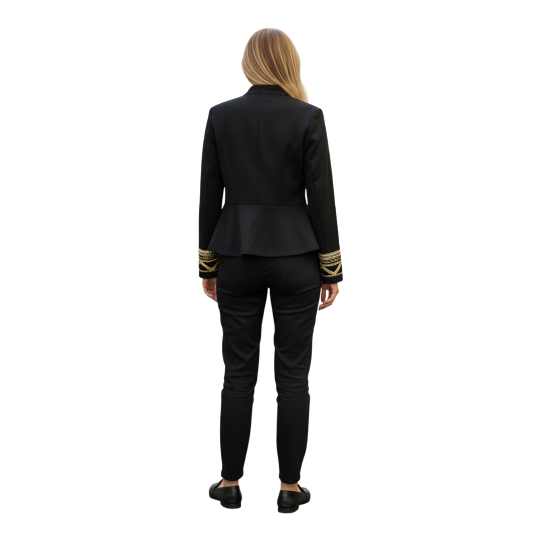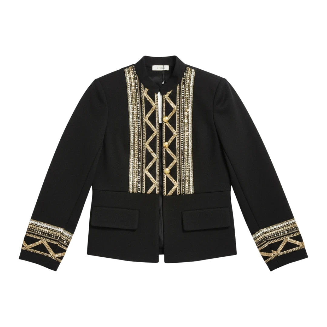 Elegantni Dixie sako u crnoj boji, izrađen u sofisticiranom kroju koji spaja klasičnu formu i upečatljive etno-inspirirane detalje. Prednji dio i rukavi ukrašeni su bogatim zlatnim vezom i dekorativnim aplikacijama, koje daju luksuzan i jedinstven izgled. Sako ima ravni kroj, duge rukave s naglašenim manžetama i diskretne džepove sprijeda. Idealno se uklapa uz elegantne pantalone ili haljinu, ali može se nositi i kao statement komad u modernim, urbanim kombinacijama.