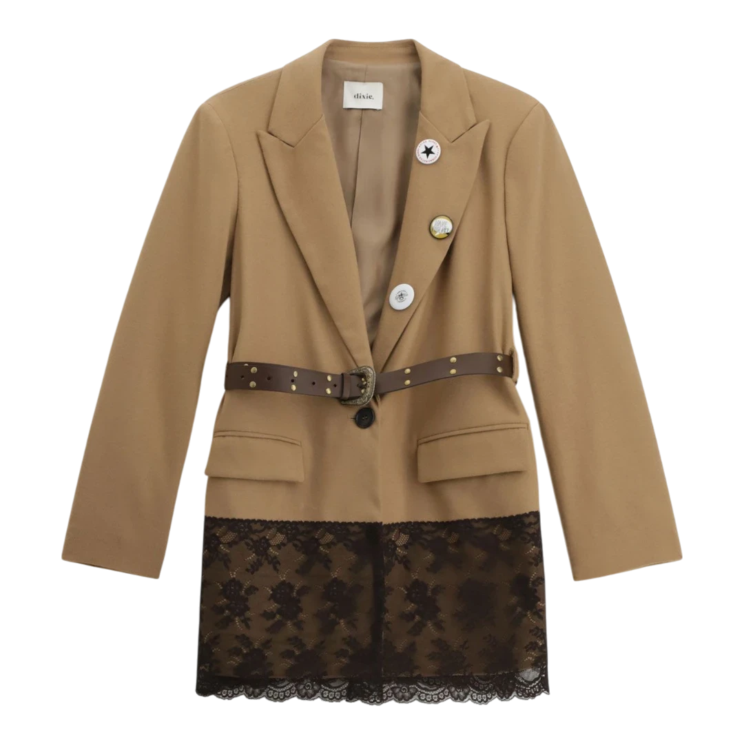 Ovaj Dixie sako ističe se elegantnim krojem i pažljivo odabranim detaljima koji mu daju poseban karakter. Klasični rever i strukirani oblik naglašavaju siluetu, dok tanki smeđi kaiš u struku dodatno definiše figuru i daje ženstven izgled. Dekorativni bedževi na prednjem dijelu unose dozu urbanog stila i originalnosti.