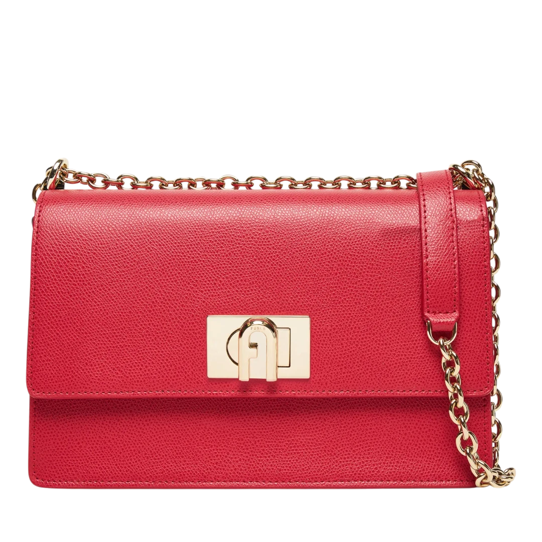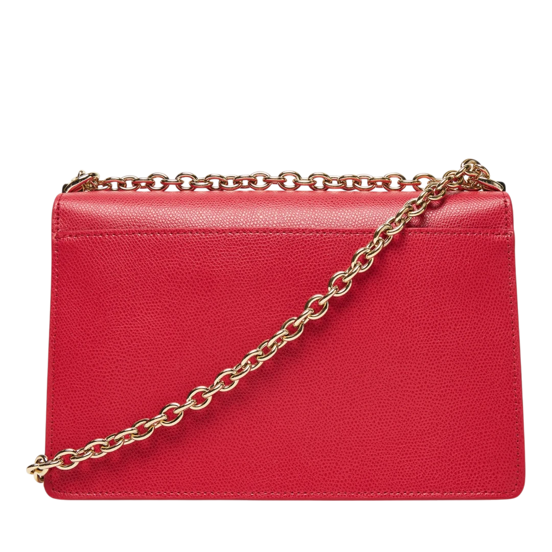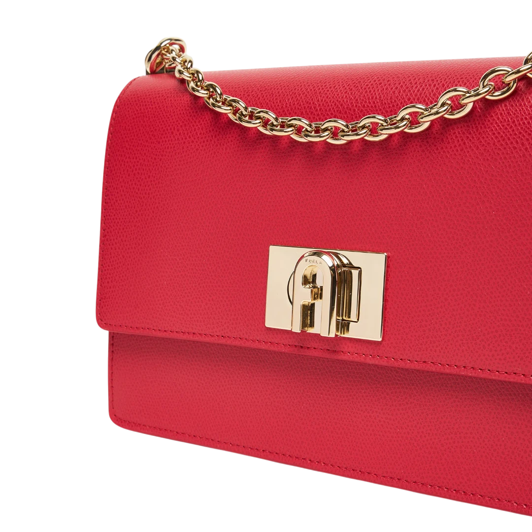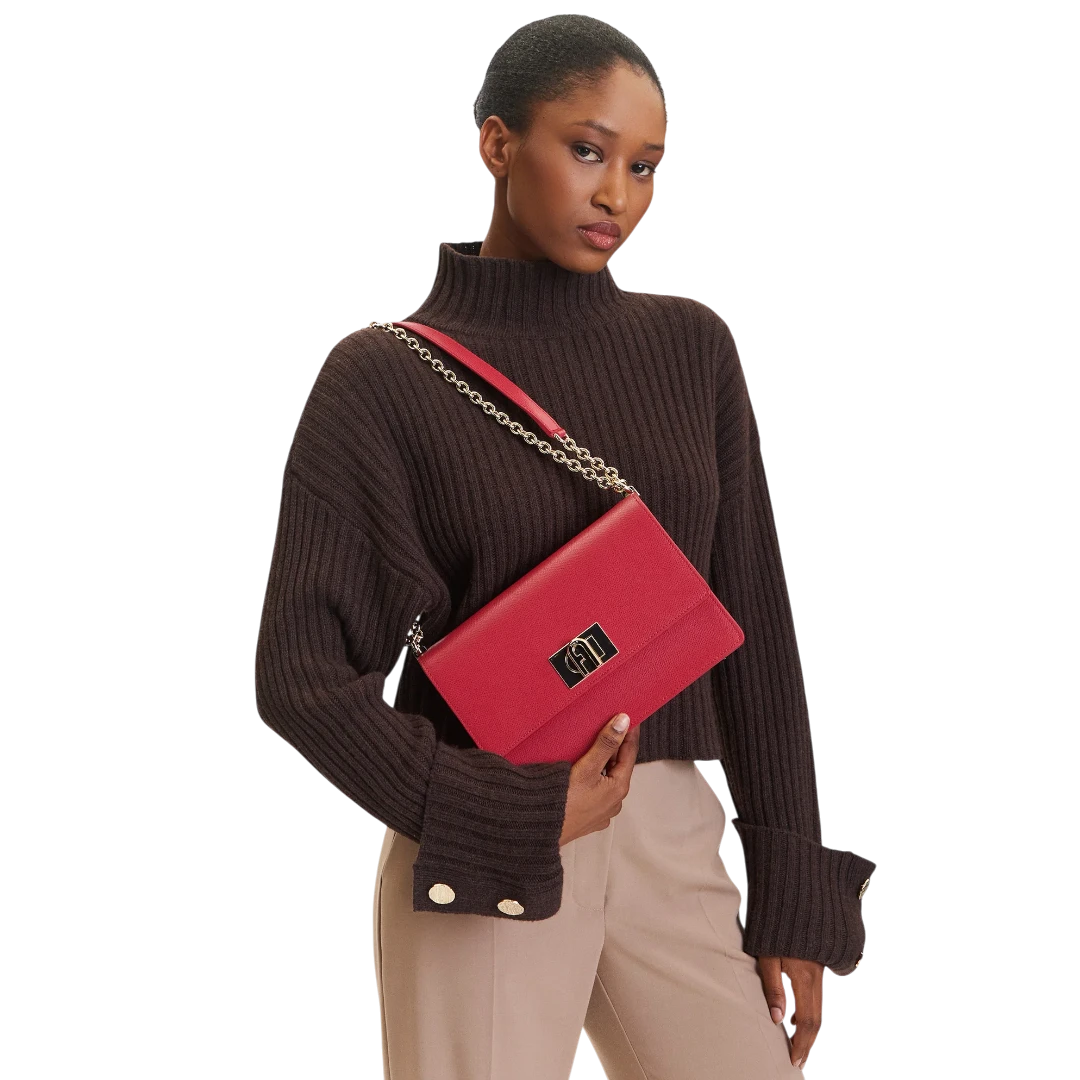 Crvena Furla torba izrađena od vrhunske zrnaste kože donosi savršenu kombinaciju luksuza i izražajnog stila. Prepoznatljivo zlatno kopčanje s Furla logom i elegantni lanac za nošenje na ramenu ili crossbody dodaju sofisticiran sjaj svakoj odjevnoj kombinaciji. Kompaktna, ali praktična, ova torba je idealna za večernje izlaske, posebne prilike ili kao upečatljiv akcent u dnevnim outfitima, naglašavajući samouvjerenost i bezvremensku eleganciju moderne žene.