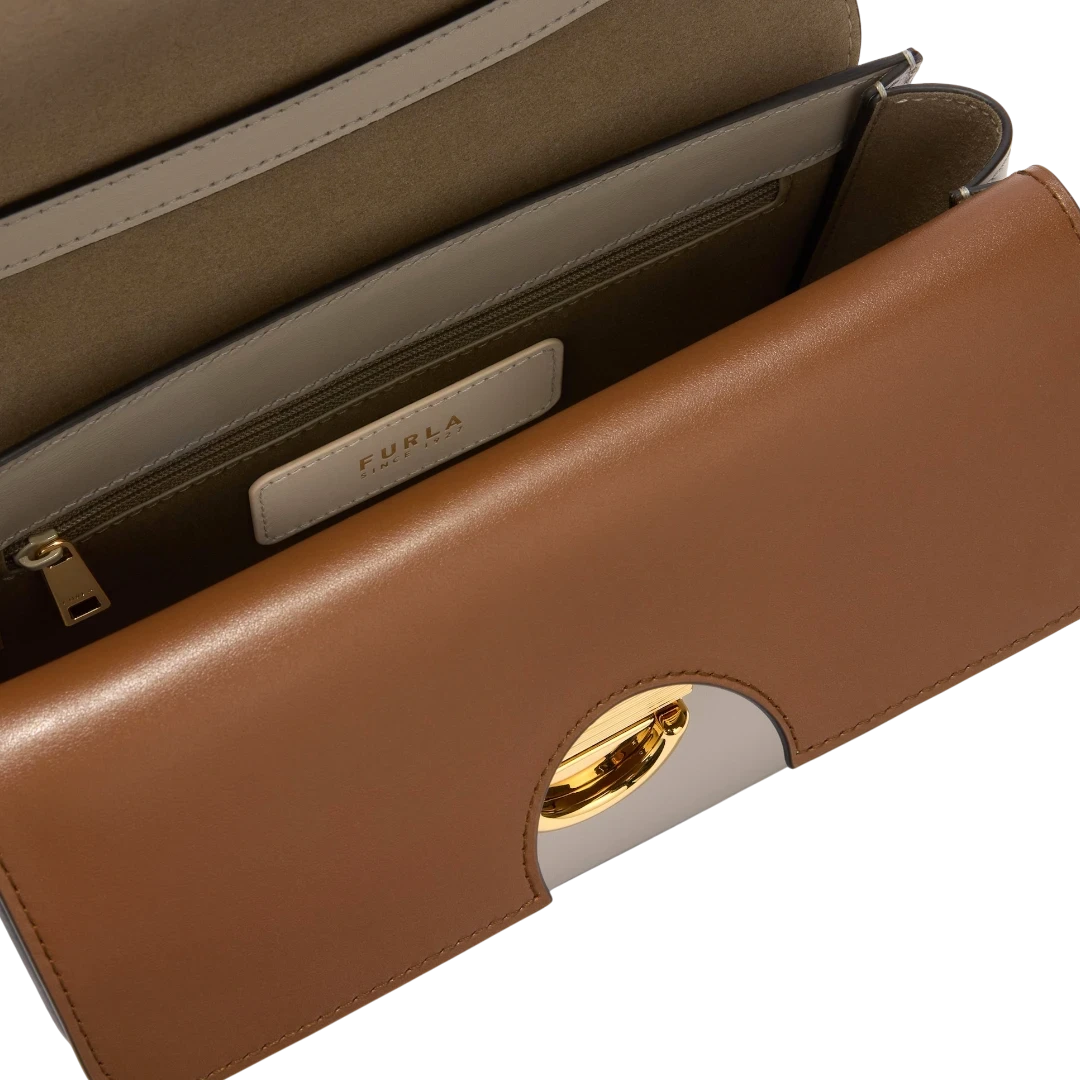 Furla torba spoj je elegancije i suvremenog dizajna u jednoj savršeno balansiranoj silueti. Izrađena od glatke kože u kombinaciji toplih tonova senf žute, svijetlosive i smeđe, ova torba osvaja sofisticiranim kontrastima i prepoznatljivim zlatnim metalnim zatvaračem u obliku sfere.