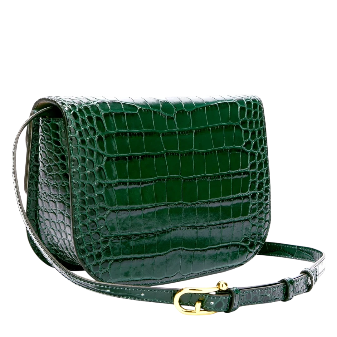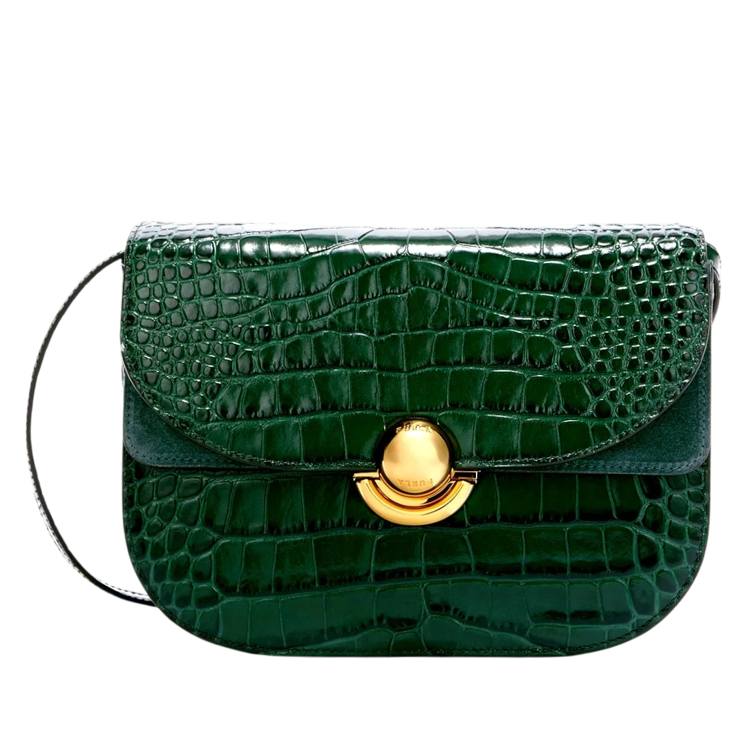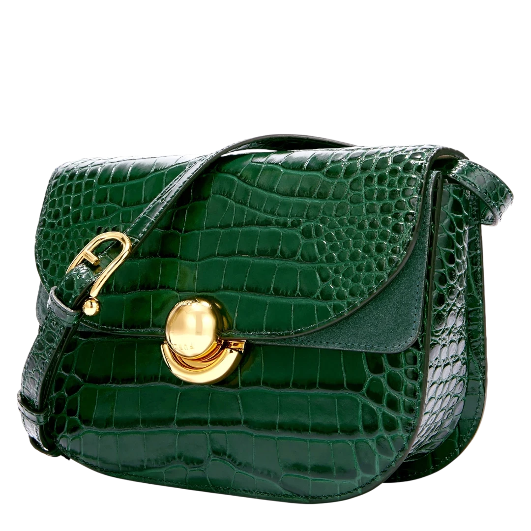 Furla crossbody torba u smaragdno zelenoj nijansi izrađena je od kože s luksuznim krokodil uzorkom koji joj daje ekskluzivan izgled. Elegantni zlatni detalj na kopčanju dodatno naglašava sofisticiranost, dok kompaktan dizajn i praktičan remen omogućavaju udobno nošenje. Savršen izbor za dame koje žele dodatak koji spaja luksuz i funkcionalnost u jedinstvenom modnom izrazu.