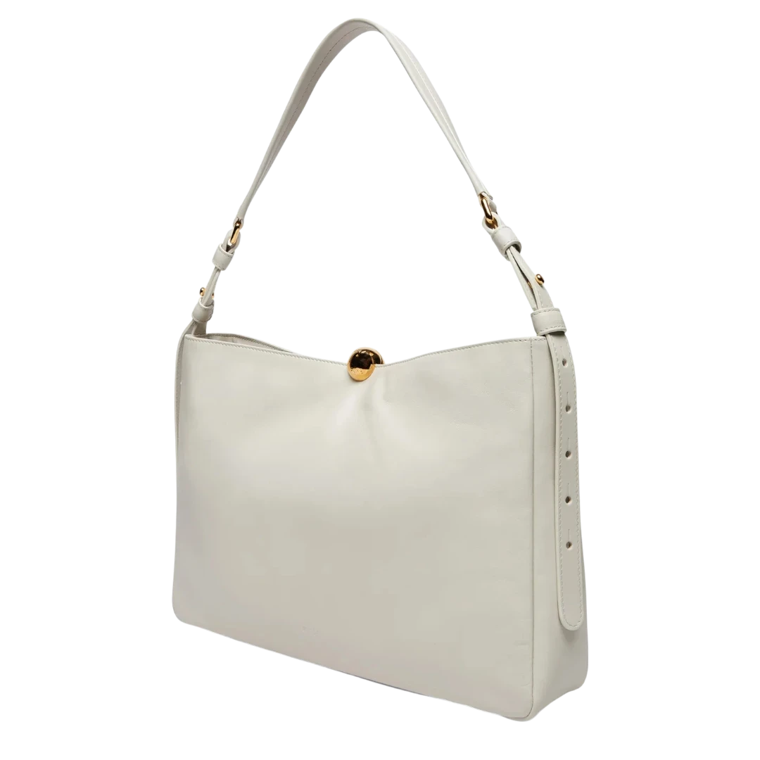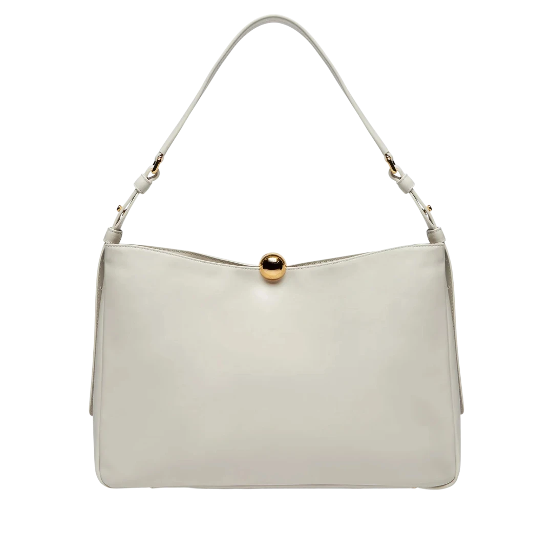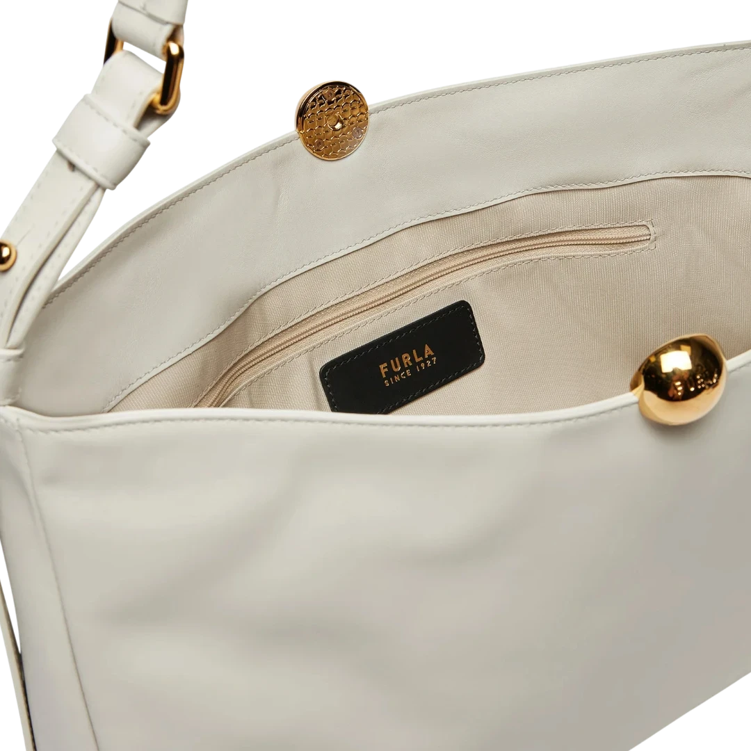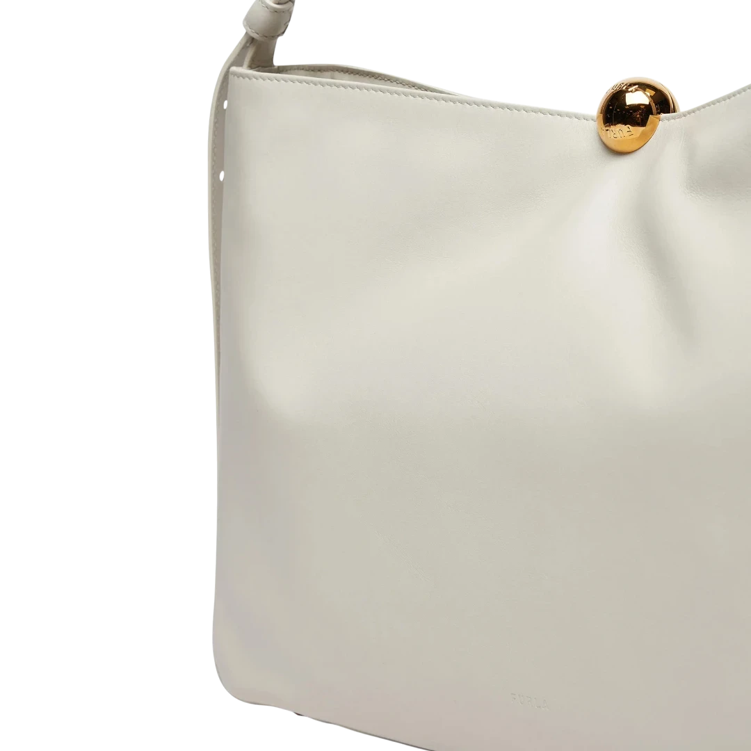 Furla torba savršen je primjer minimalističke elegancije i sofisticiranog dizajna. Izrađena od glatke kože u profinjenoj nijansi ecru, ukrašena je prepoznatljivom sfernom metalnom kopčom u zlatnom tonu – simbolom Furla estetike. Prostrana unutrašnjost i prilagodljiva ručka čine je praktičnim izborom za svakodnevne prilike, dok čistim linijama i bezvremenskim oblikom odiše modernim luksuzom.
