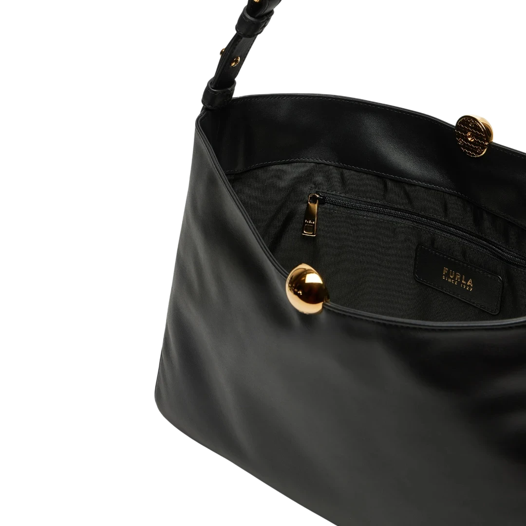 Furla Sfera torba u crnoj boji utjelovljuje savršenu ravnotežu elegancije i modernog minimalizma. Izrađena od glatke, luksuzne kože, odiše prefinjenošću, dok zlatni metalni detalj u obliku sfere na prednjoj strani dodaje suptilan, ali prepoznatljiv Furla potpis. Prostran dizajn i podesiva ručka čine je praktičnim izborom za svaku priliku — od poslovnih sastanaka do večernjih izlazaka. Bezvremenska i sofisticirana, Furla Sfera torba je komad koji podiže svaku kombinaciju na viši nivo stila.
