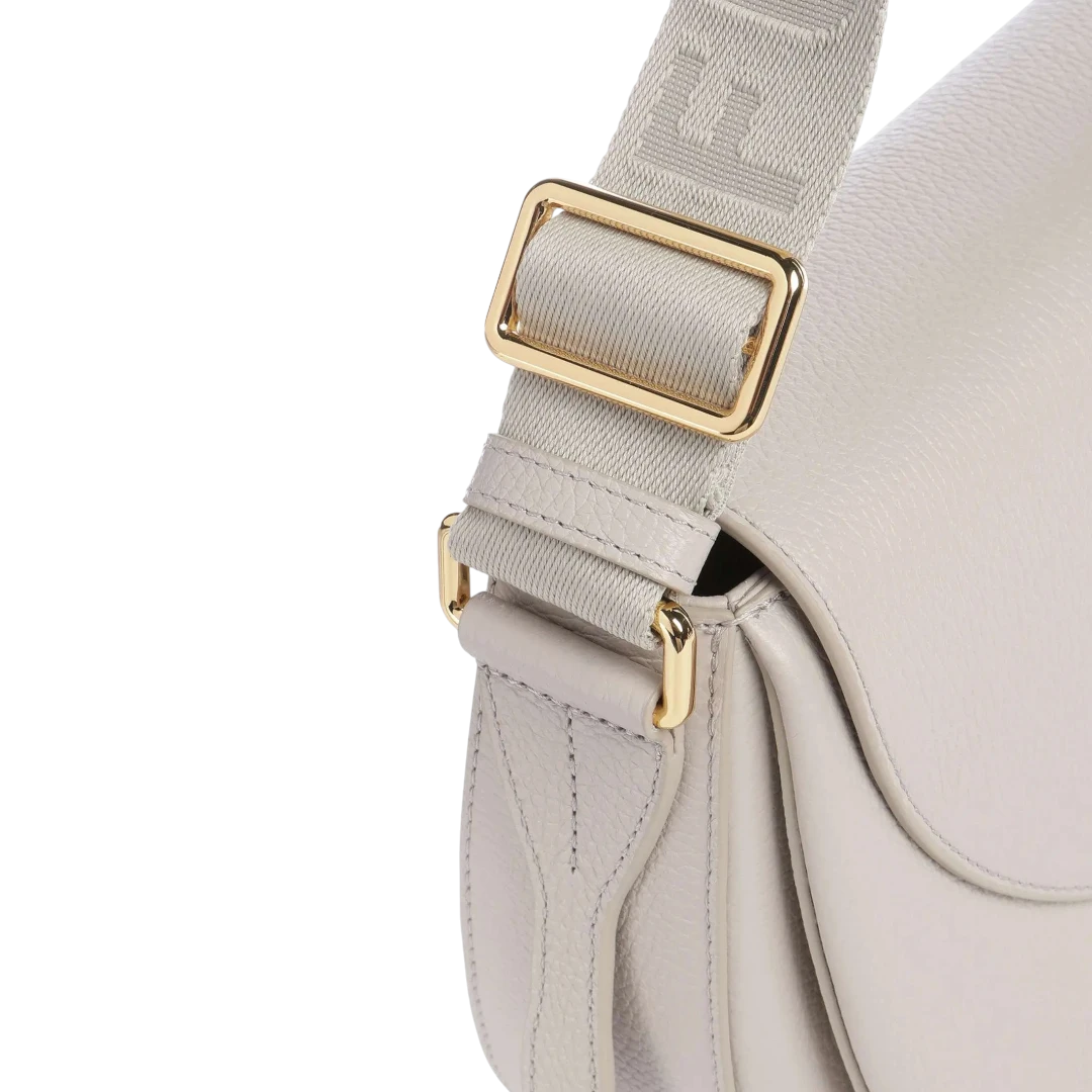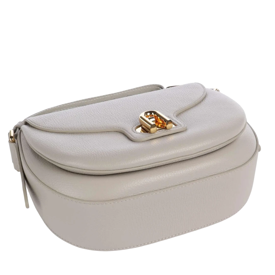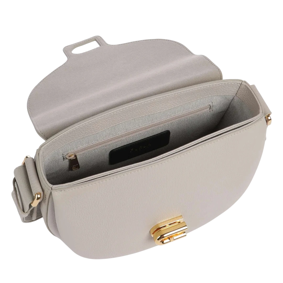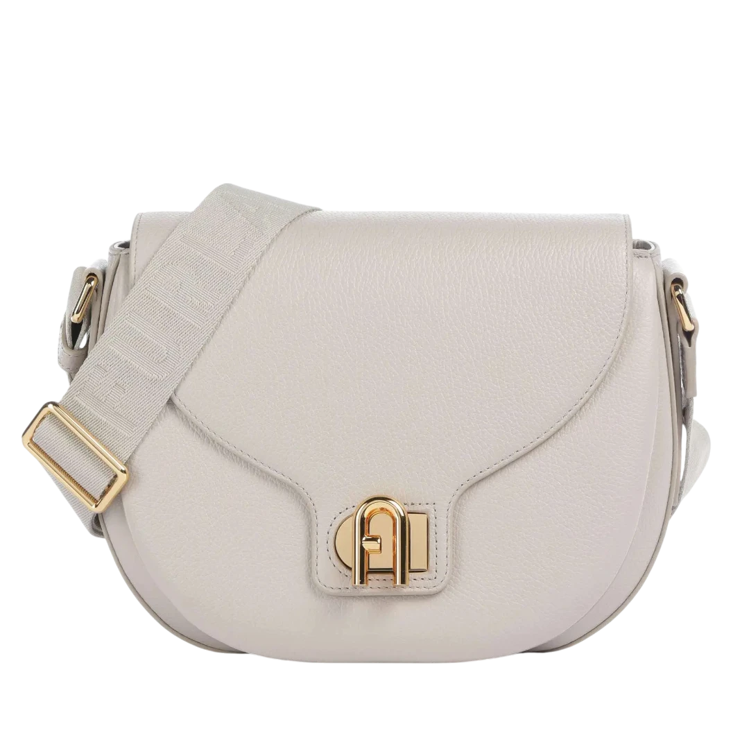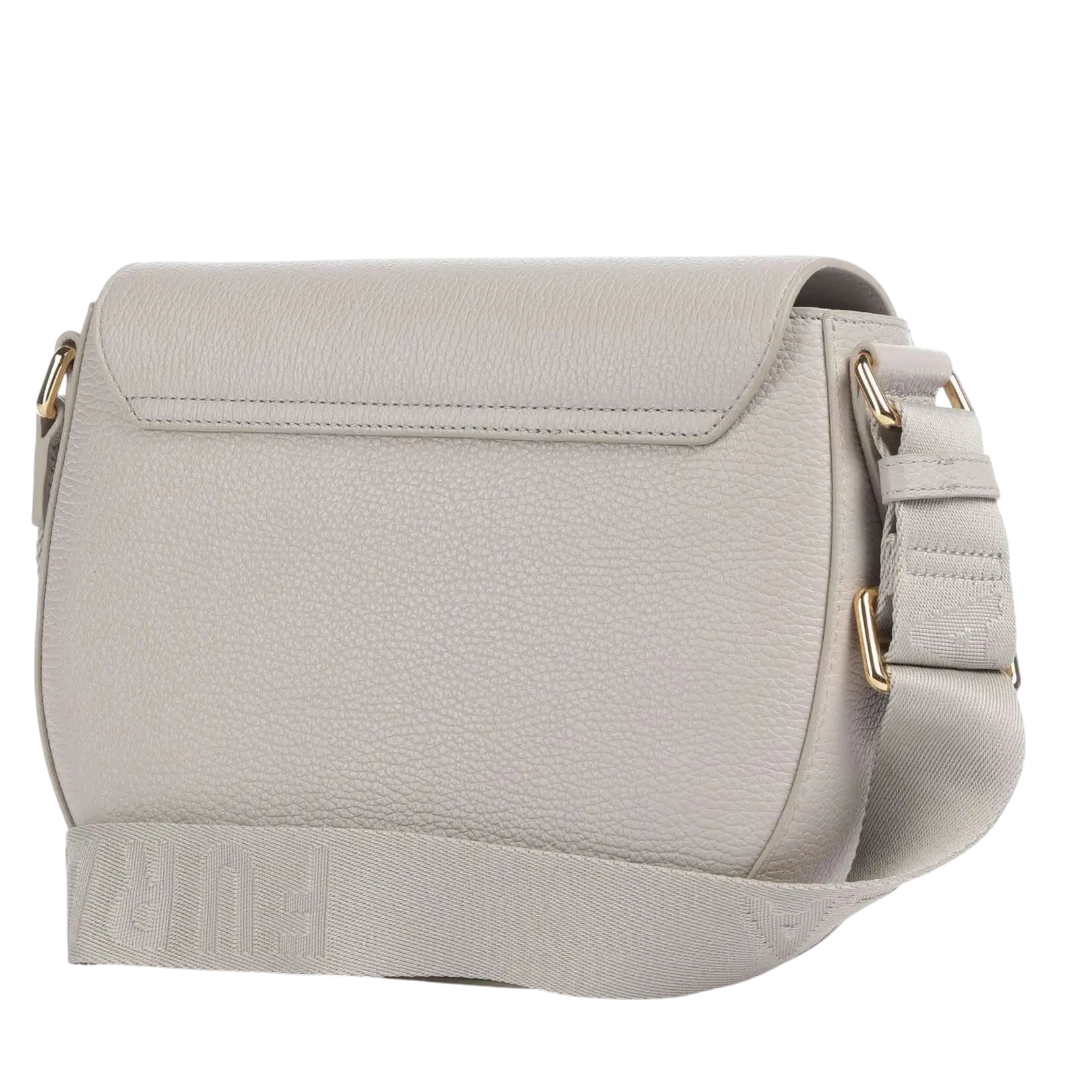 Ova Furla crossbody torba u elegantnoj svijetloj nijansi pruža savršen spoj sofisticiranog dizajna i praktičnosti. Izrađena od fine, zrnaste kože, ističe se zaobljenom siluetom i prepoznatljivom zlatnom kopčom s Furla logotipom koja dodaje luksuzan naglasak. Široki platneni remen s ugraviranim nazivom brenda omogućava udobno nošenje i moderan izgled, dok unutrašnjost nudi dovoljno prostora za svakodnevne potrepštine. Idealna je za dnevne kombinacije kada želite nenametljiv, ali upečatljiv modni dodatak.