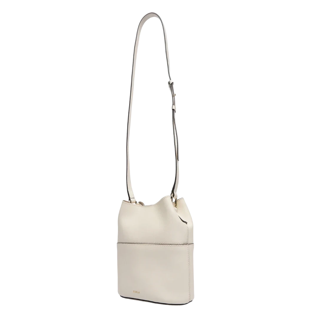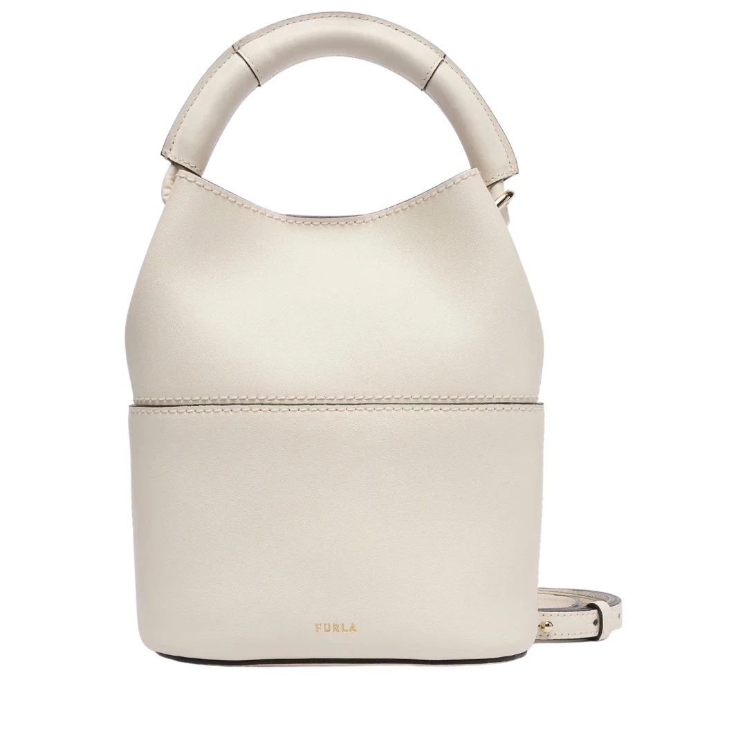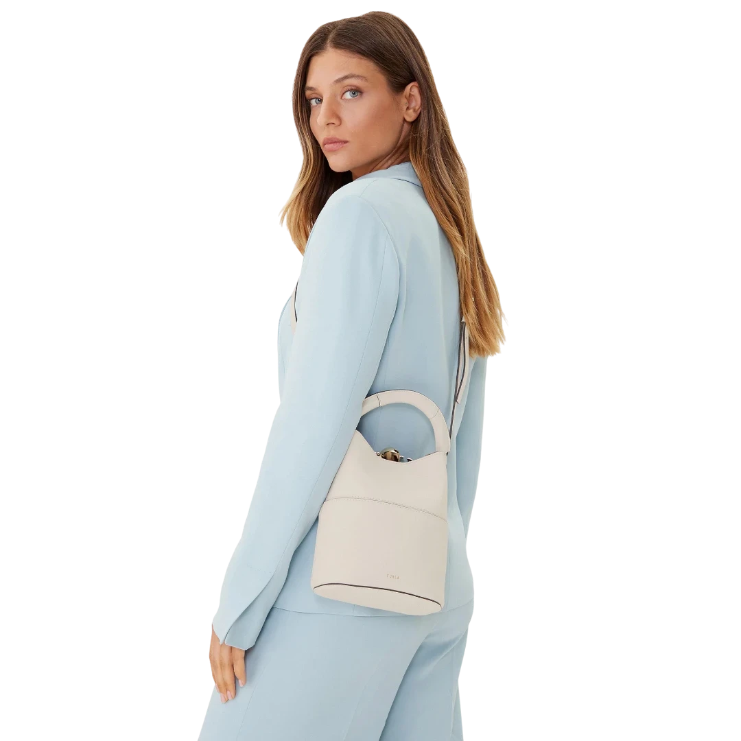 Furla bucket torba u elegantnoj bijeloj nijansi odiše minimalizmom i modernim luksuzom. Izrađena od fine kože s glatkom teksturom, ističe se kompaktnim i profinjenim oblikom. Kratka zaobljena ručka omogućava nošenje u ruci, dok podesivi remen pruža opciju nošenja preko ramena ili crossbody. Zlatni Furla logo diskretno naglašava sofisticiranost brenda. Savršen dodatak za sve prilike – od dnevnih kombinacija do večernjih izlazaka.