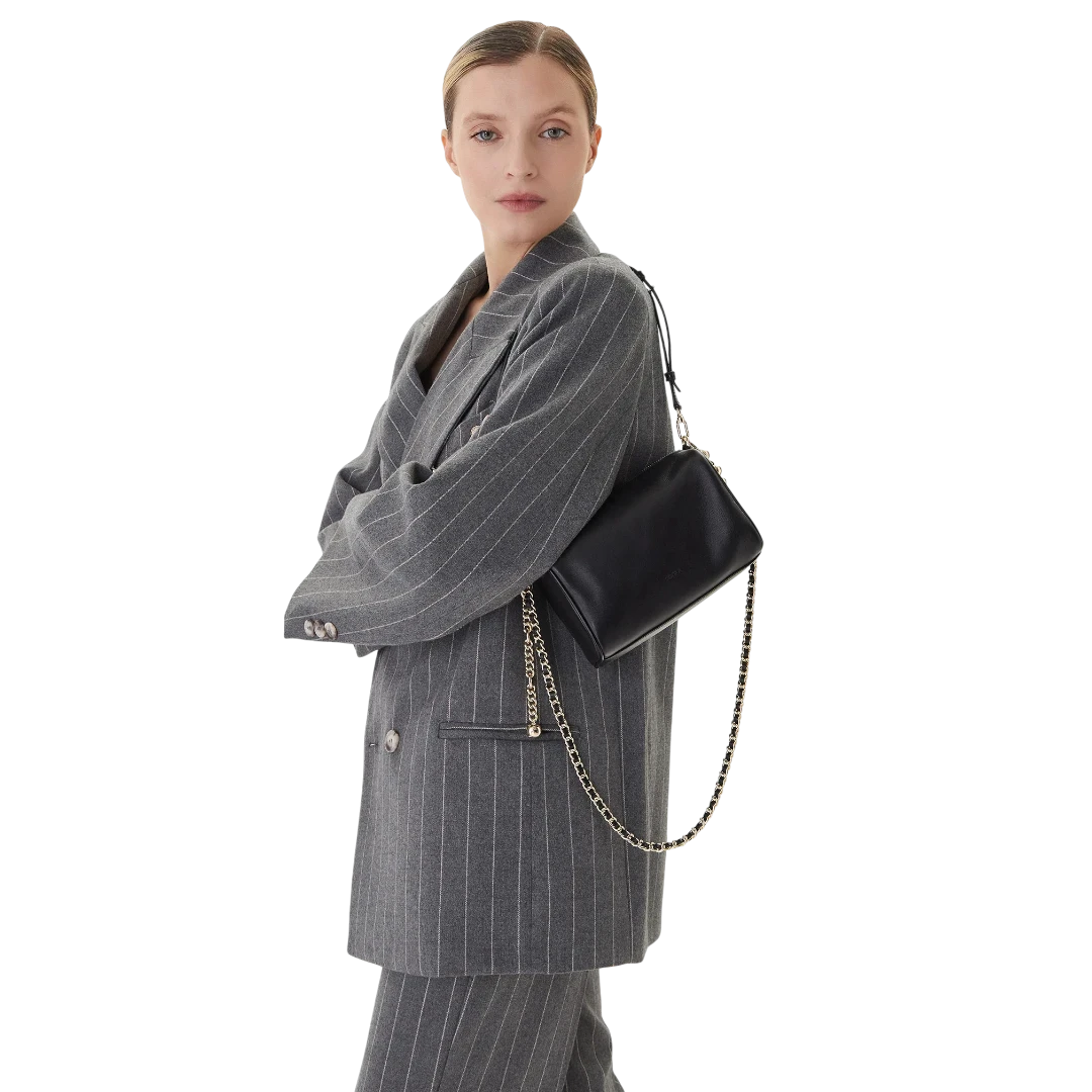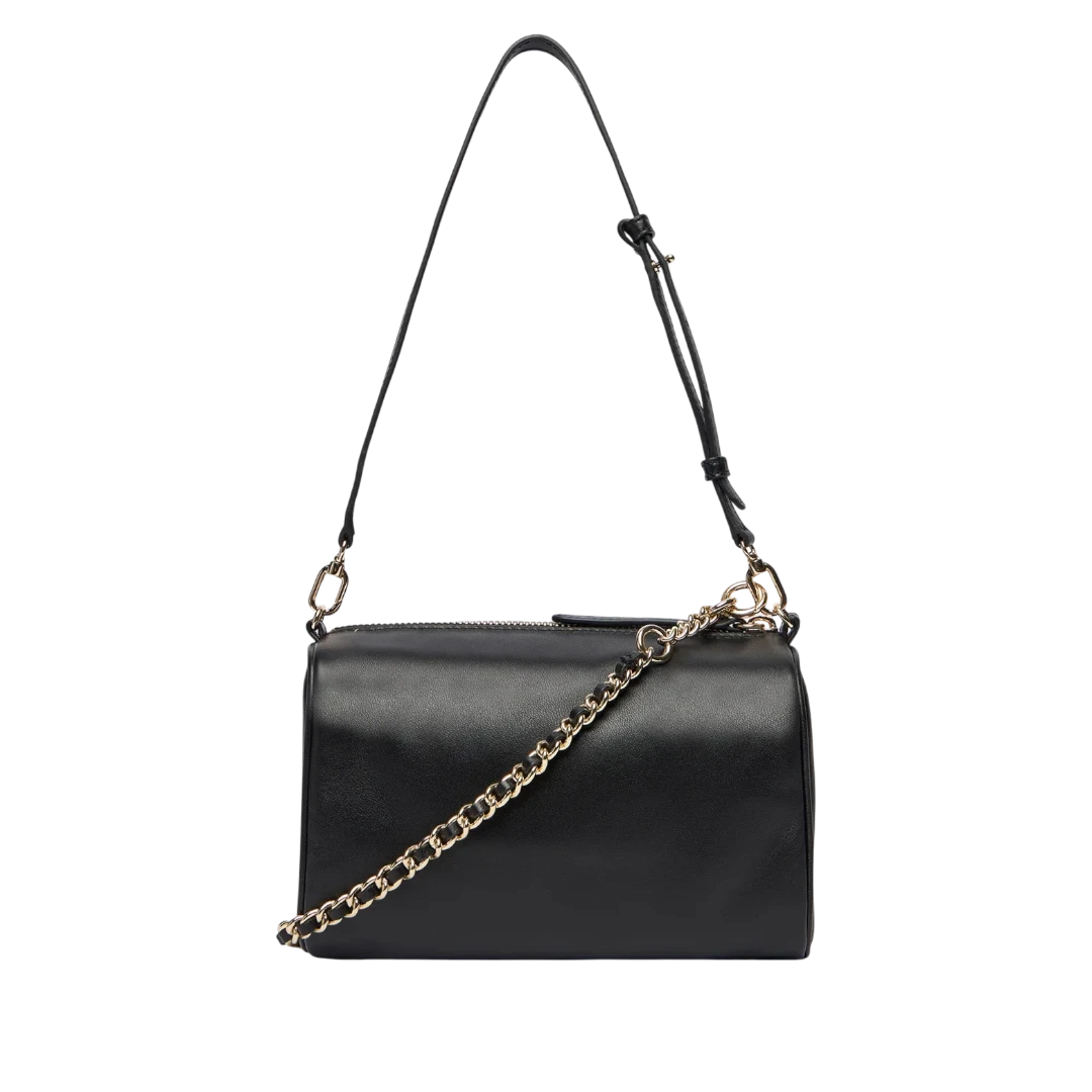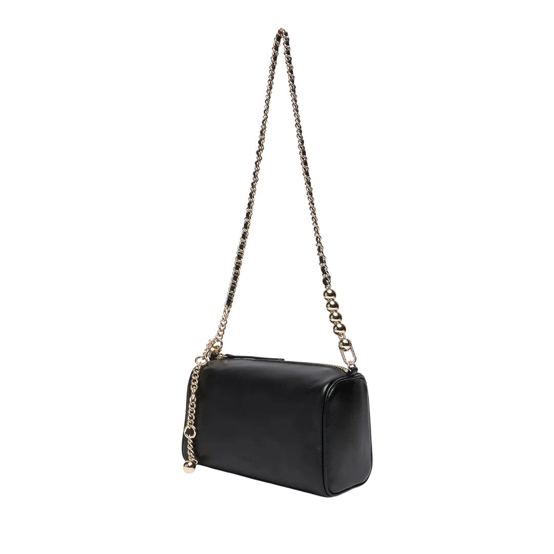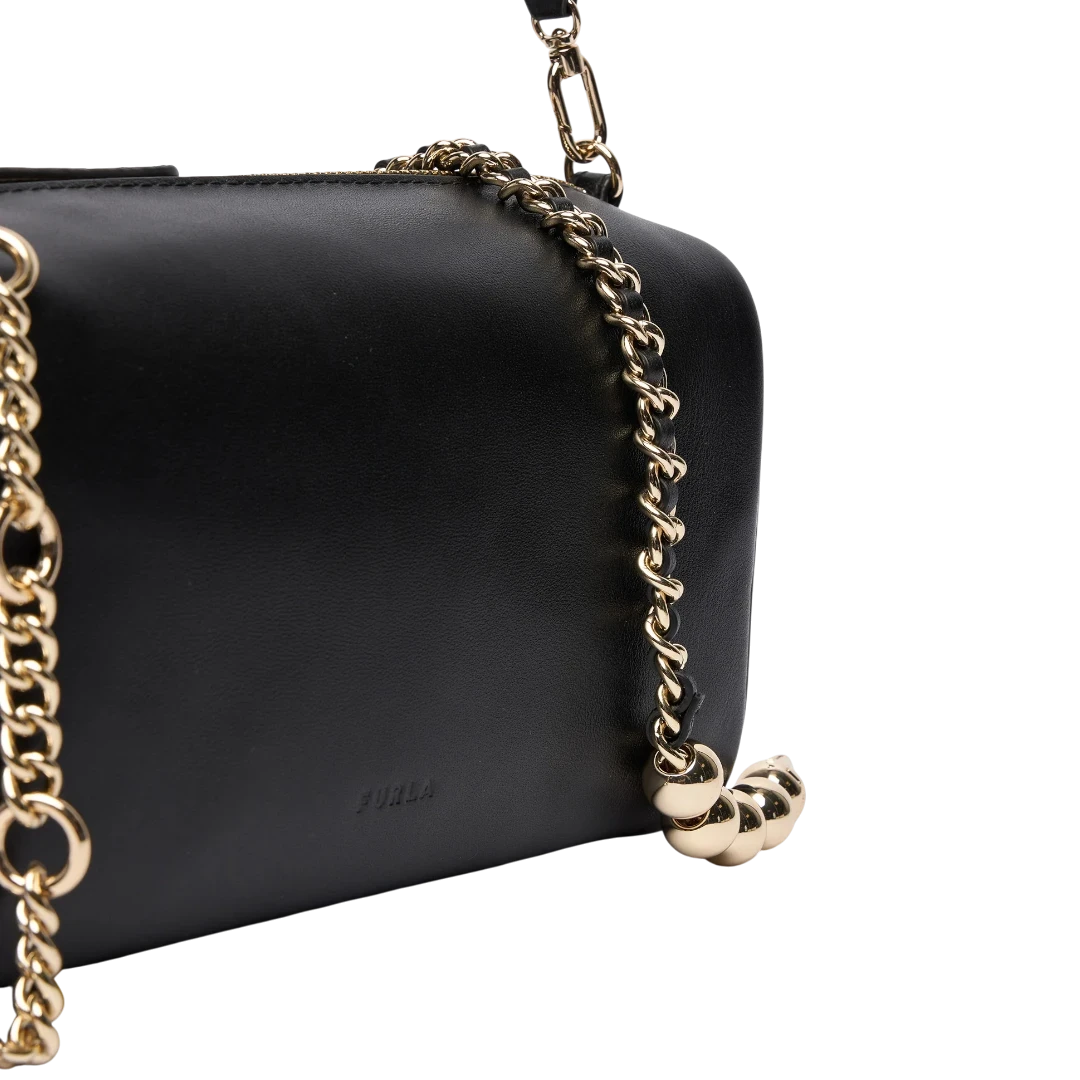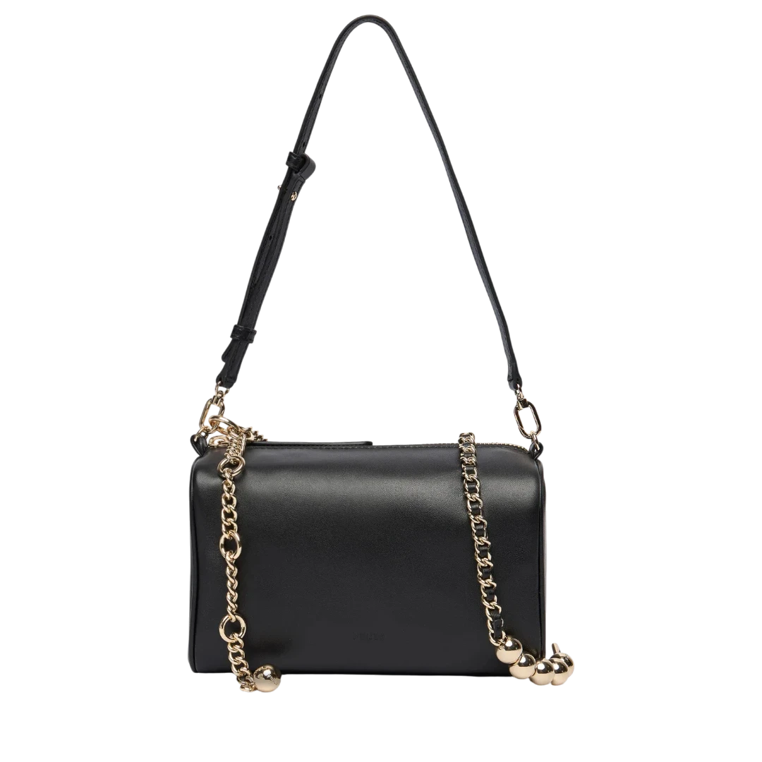 Furla torba u klasičnoj crnoj boji odiše minimalizmom i luksuznim detaljima. Izrađena od glatke kože, upotpunjena je elegantnim zlatnim lancem s dekorativnim kuglicama koji joj daje moderan i prepoznatljiv karakter. Kompaktan pravougaoni oblik čini je praktičnom i sofisticiranom – idealnom za dnevne i večernje kombinacije. Zahvaljujući podesivom kožnom kaišu, može se nositi na ramenu ili crossbody, što je čini savršenim spojem funkcionalnosti i italijanskog šika.